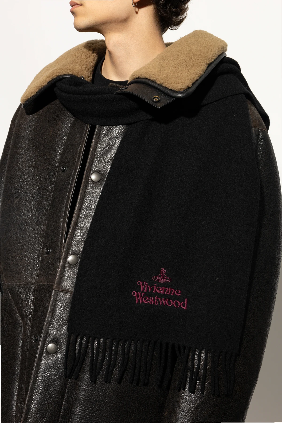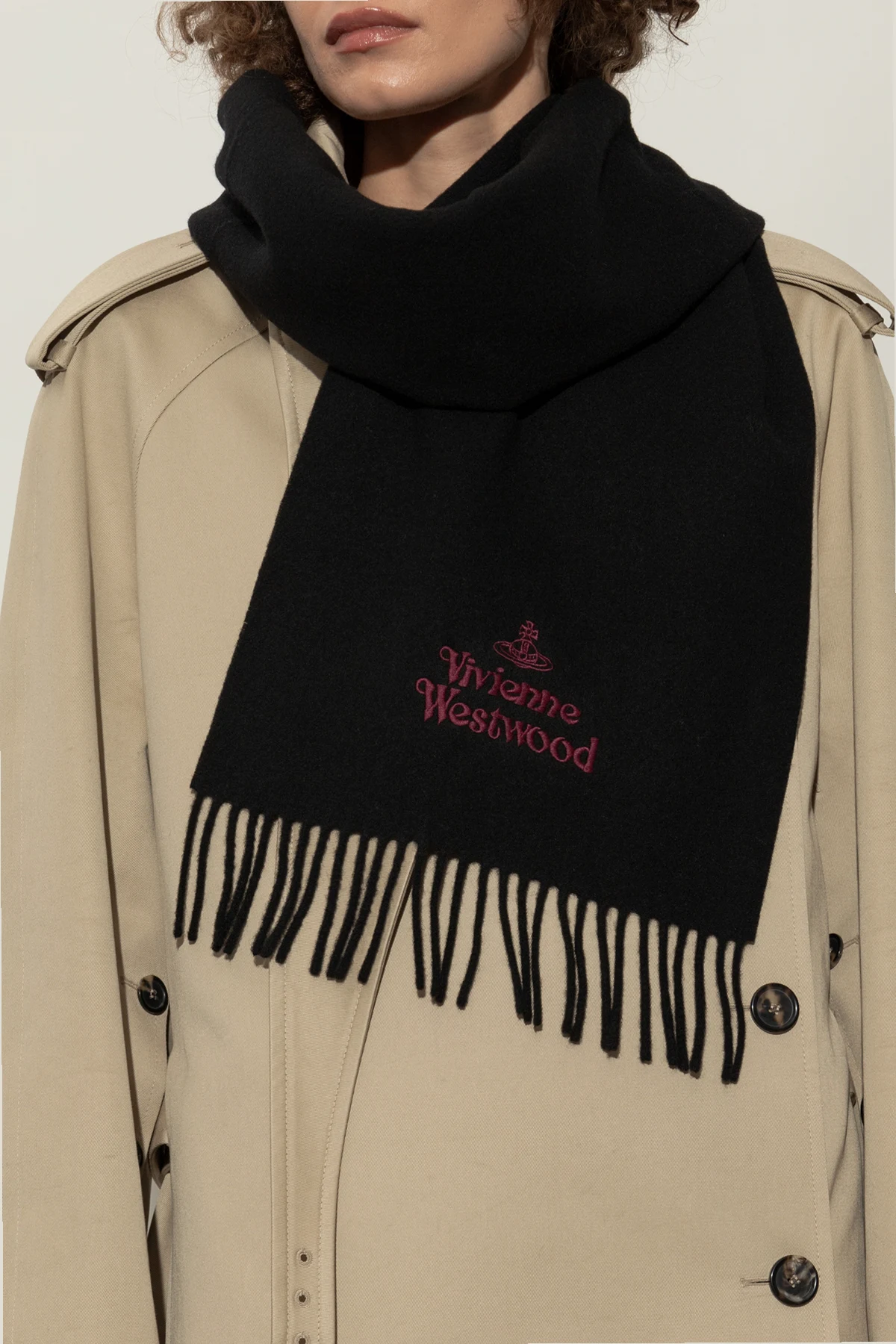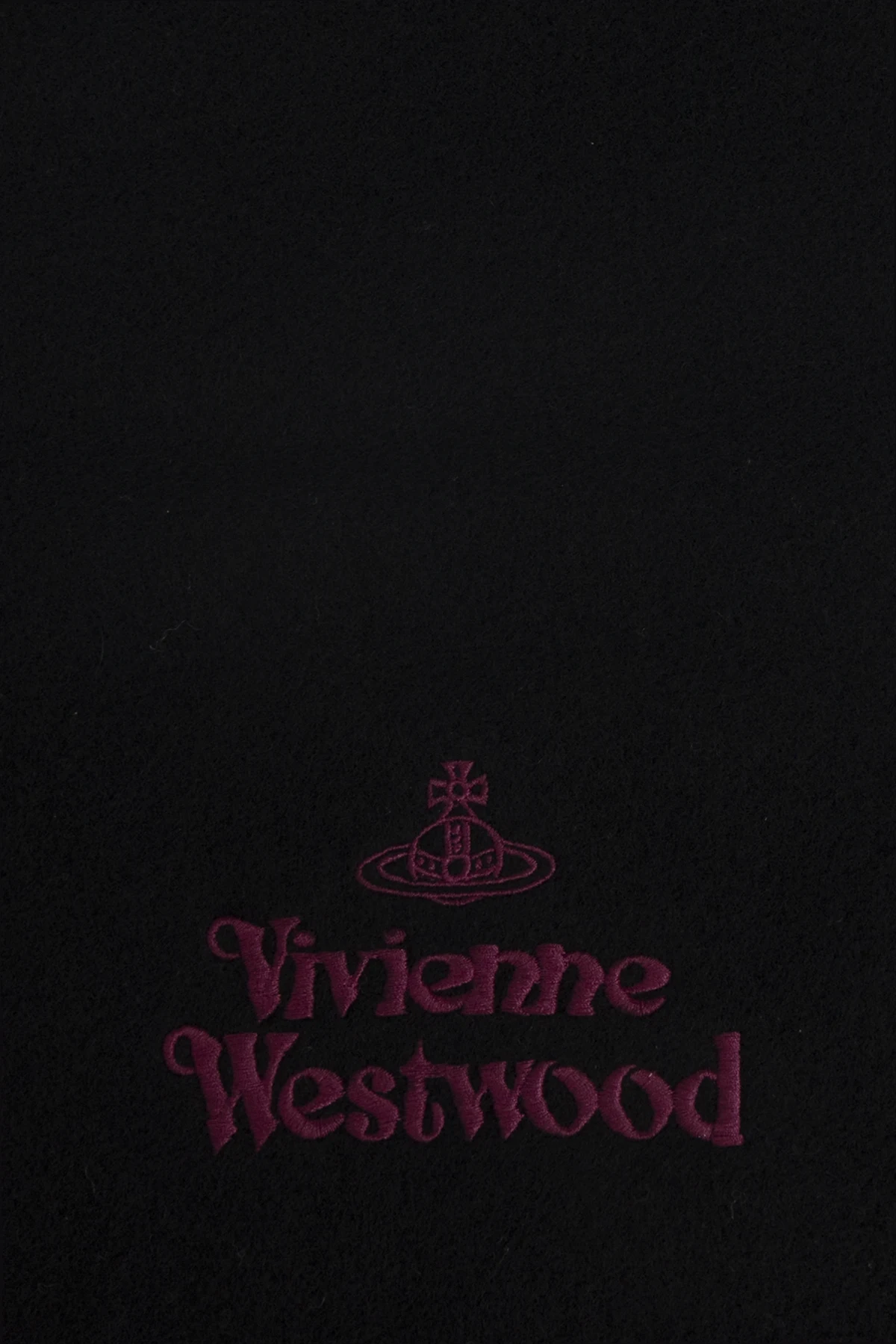Introducing the Wool Scarf by the illustrious Vivienne Westwood, a paragon of luxury and elegance. This exquisite black scarf is crafted from the finest wool, offering unparalleled softness and warmth. Its rectangular shape is accentuated by delicate fringes at one end, adding a touch of sophistication. Centrally adorned with the embroidered Vivienne Westwood name in rich burgundy, accompanied by the iconic logo, this scarf is a testament to the brand's legacy of avant-garde design. A versatile accessory, it is perfectly suited for both men and women who seek to make a subtle yet bold statement. Why buy this product? Luxurious 100% wool for ultimate comfort. Embroidered signature and logo for a distinctive touch. Classic design with a modern twist, suitable for all genders. Perfect for elevating any ensemble with a hint of rebellion.