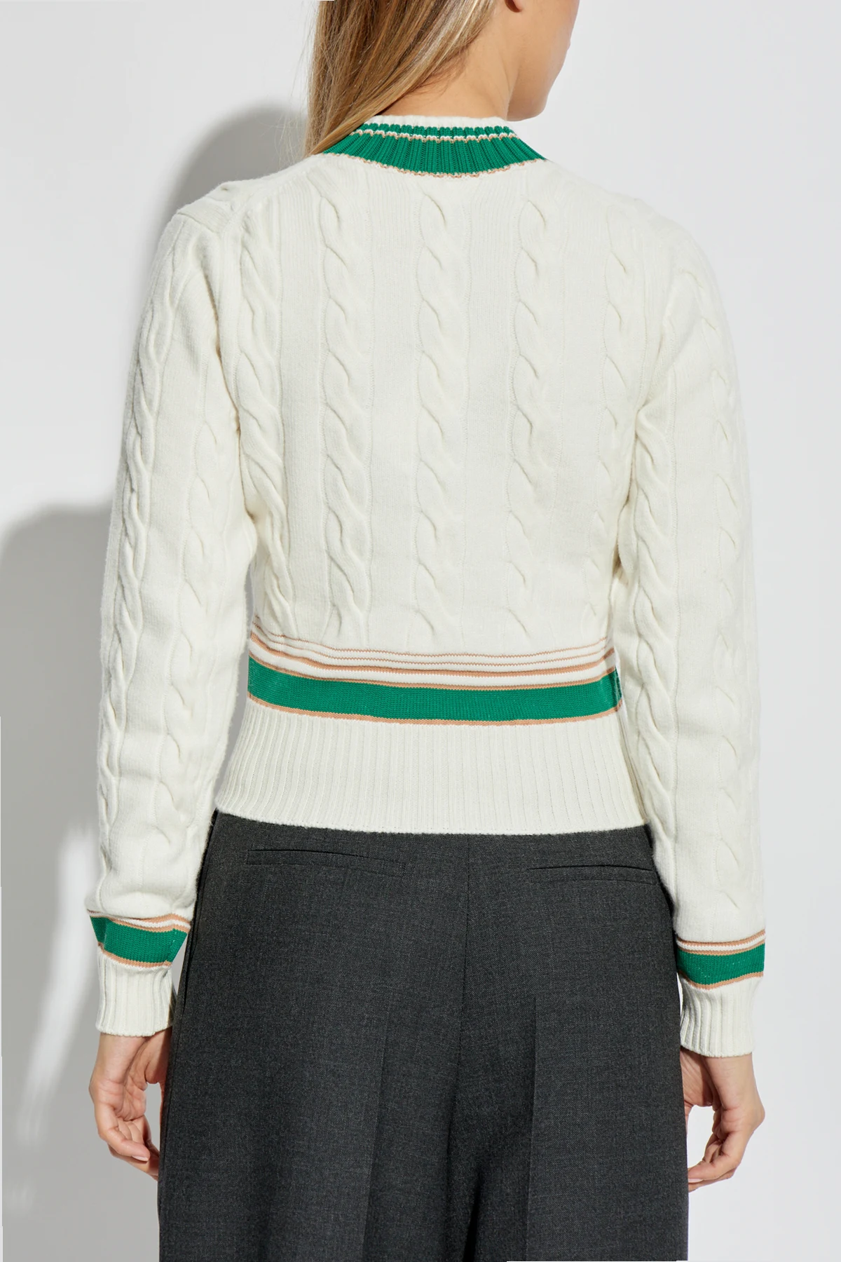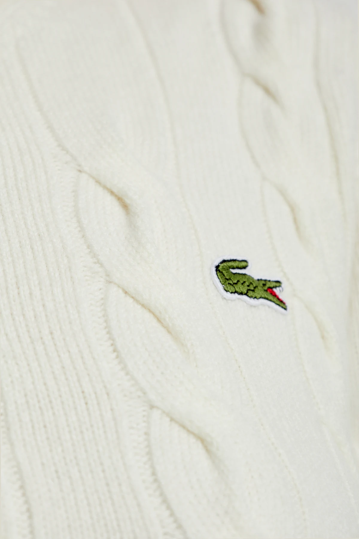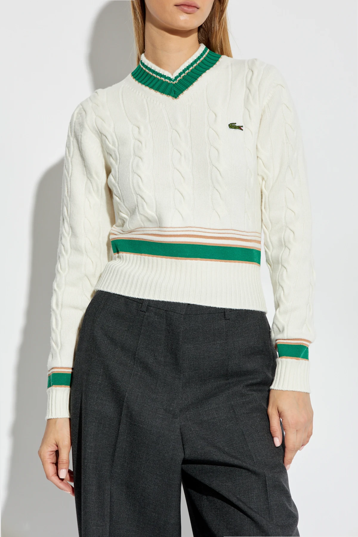 Experience the epitome of sophistication with the Wool Sweater with Logo by Lacoste. This exclusive garment epitomizes timeless elegance, featuring a classic, tailored fit with long sleeves and a ribbed hem, cuffs, and a V-shaped neckline. The sweater boasts a refined cable-knit pattern, exuding a sense of luxury and tradition. Crafted from premium wool, it ensures both warmth and exceptional quality. Distinctive details include a small, embroidered green crocodile logo on the left chest, and green and brown stripes adorning the neckline, cuffs, and hem, adding a unique touch to its sophisticated design. The dominant cream color complements the intricate design elements, making it a versatile addition to any wardrobe. Why Buy This Product? Classic and elegant design with a tailored fit. Luxurious cable-knit pattern. Exquisite details such as the embroidered logo and striped accents. Made from high-quality wool for warmth and durability. Perfect for colder days, adding a touch of sophistication to your ensemble.
