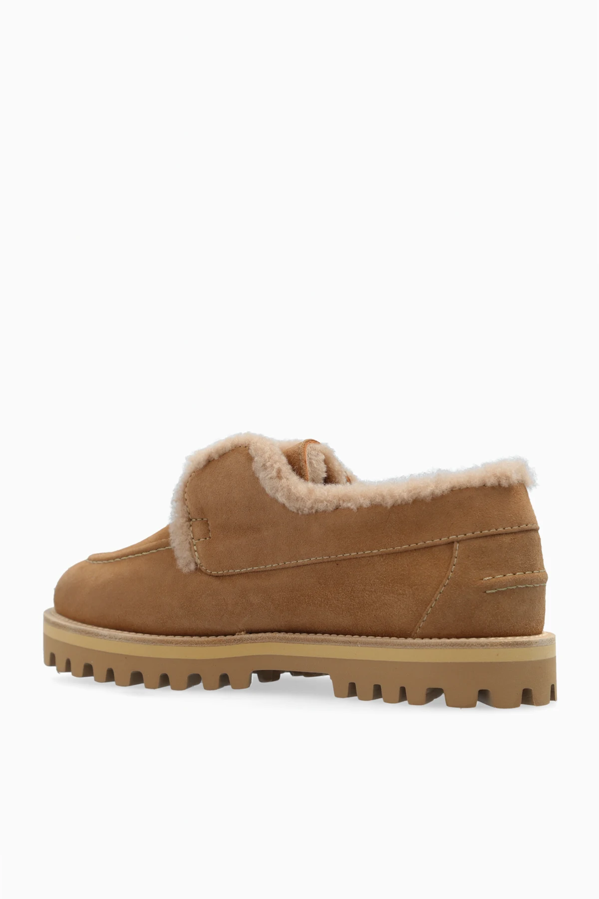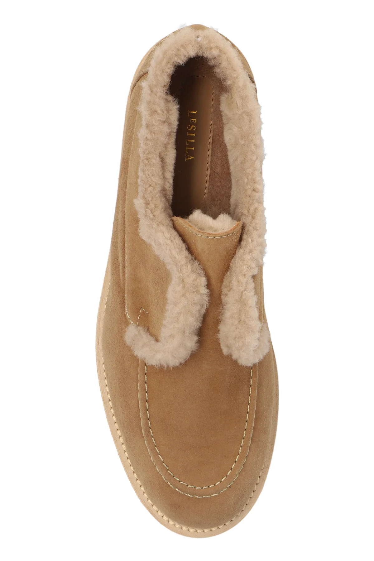 Introducing the Leather Shoes 'Yacht' by Le Silla, an epitome of refined elegance and unparalleled comfort from our exclusive collection. These shoes boast a classic loafer design with a rounded toe, exuding sophistication in every step. Crafted from premium beige suede leather, the exterior of these shoes showcases a timeless aesthetic. Inside, the shoes are lined with soft, plush fur, likely sheepskin, ensuring utmost warmth and comfort. The robust rubber sole, distinguished by a prominent tread, offers exceptional grip, making these shoes as practical as they are stylish. Delicate decorative stitching adorns the shoes, complemented by a discreet logo on the heel, adding a touch of subtle luxury. The beige hue provides a versatile and elegant appearance, perfect for both casual and formal settings, especially during cooler days. Why Choose This Product? Exquisite Materials: Premium suede leather exterior and plush fur lining. Timeless Design: Classic loafer shape with a rounded toe. Superior Comfort: Soft fur lining for warmth and cushioning. Durable Construction: Solid rubber sole with excellent traction. Elegant Detailing: Decorative stitching and discrete logo on the heel.
