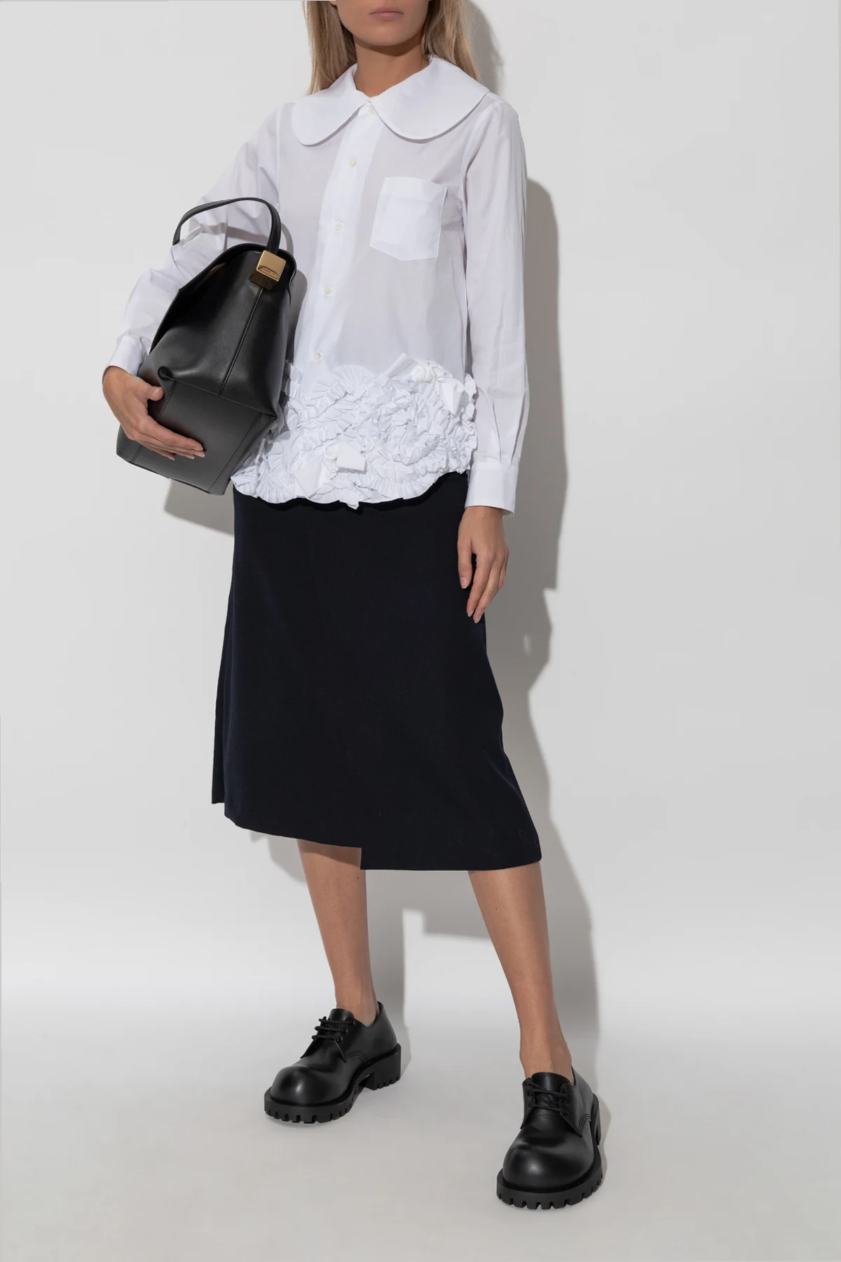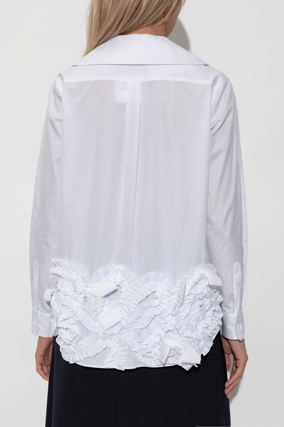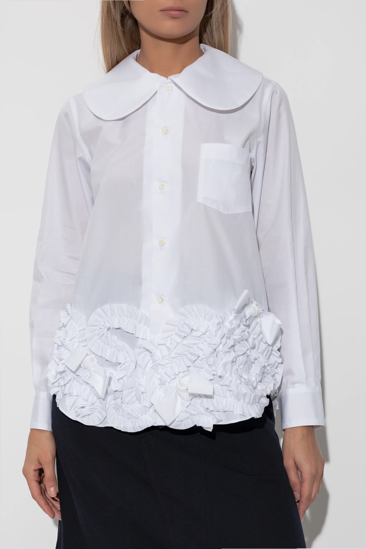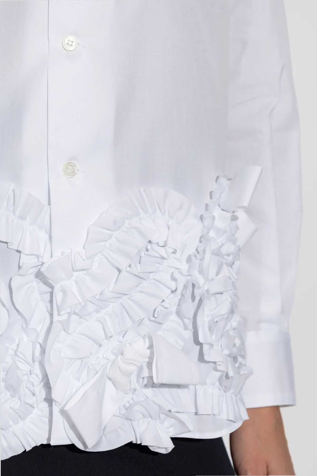 Discover the epitome of sophistication with the Decorative Ruffle Shirt by CDG by Comme des Garçons. This exquisite piece, crafted from lightweight and breathable cotton, is an embodiment of timeless elegance and contemporary flair. The shirt, resplendent in white, features a distinctive, large rounded collar, adding a touch of boldness to its classic design. A single pocket on the left chest enhances its functionality while maintaining a sleek silhouette. What sets this shirt apart are the decorative ruffles adorning its lower hem, arranged in an irregular pattern, infusing it with a unique and extravagant charm. The long sleeves conclude in simple cuffs with button closures, epitomizing understated elegance. Buttoned along the front, this shirt pairs effortlessly with a black skirt and matching shoes, as depicted, making it an ideal choice for those who appreciate elegance with a hint of audacity. Why Choose This Product? Exquisite Design: Features a large rounded collar and decorative ruffles for a unique look. Premium Material: Crafted from 100% breathable cotton ensuring comfort. Functional Elegance: Includes a single chest pocket and buttoned cuffs. Versatile Styling: Perfectly complements both formal and semi-formal outfits.