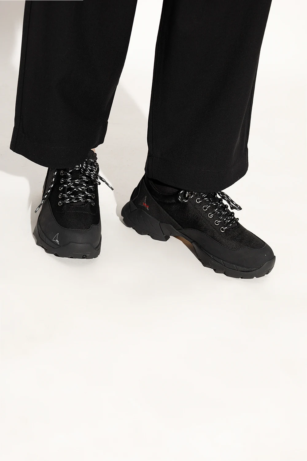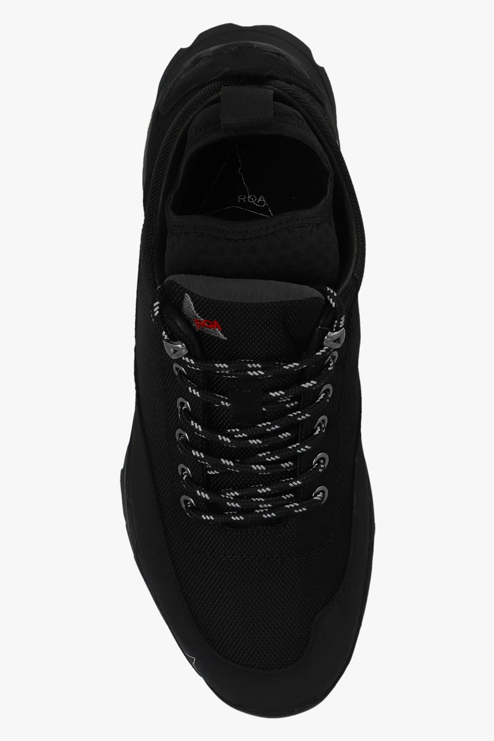 Black ‘Neal’ hiking boots from ROA. Crafted from durable technical nylon, this lace-up model features the brand's logo, rubber trims and a black Vibram Megagrip toothed tread pattern sole designed for optimal traction and to ensure high resistance to use on roughest surfaces. Swappable cream laces included.
