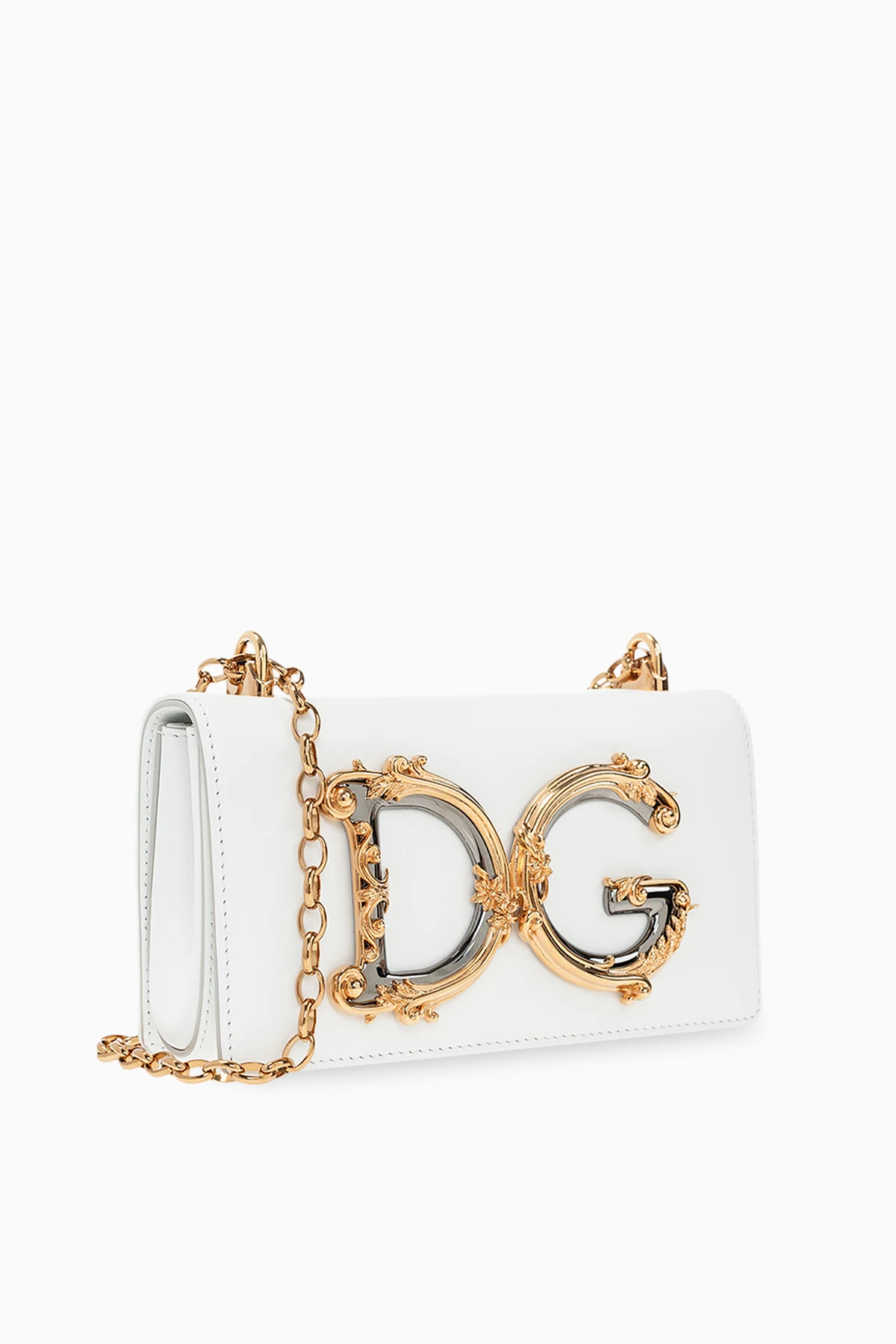 White ‘DG Girls’ shoulder bag from Dolce & Gabbana. Made of calf leather, this model fastens with magnetic snaps and is complete with an embroidered pattern, gold-tone and brown logo appliuqe, metal chain and one internal compartment with one card slot.