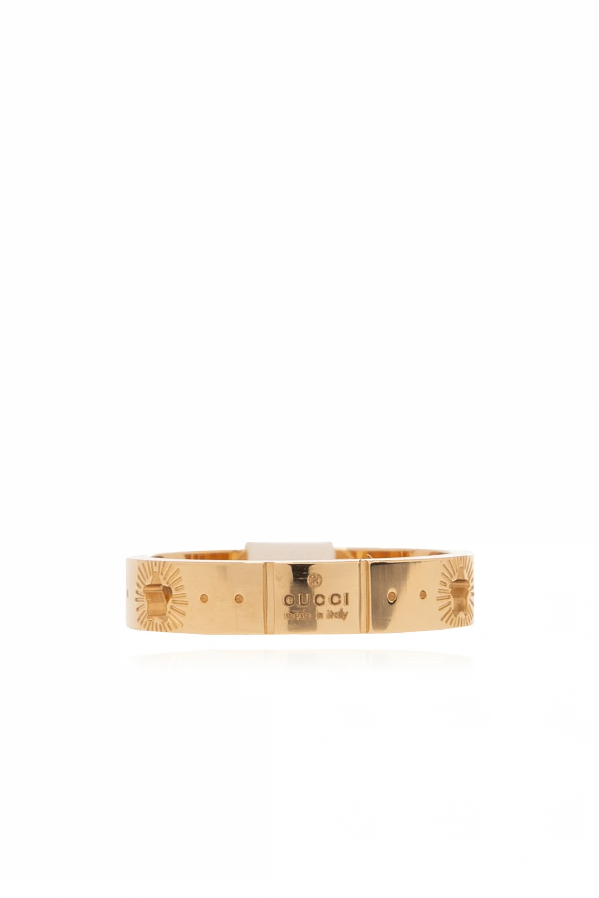 Gold ring with a cut-out star motif and an engraved logo from Gucci. Made of 18k yellow gold.