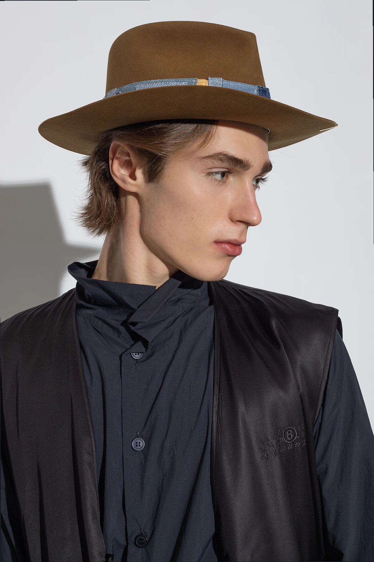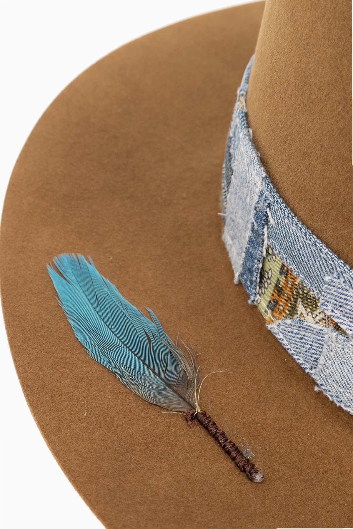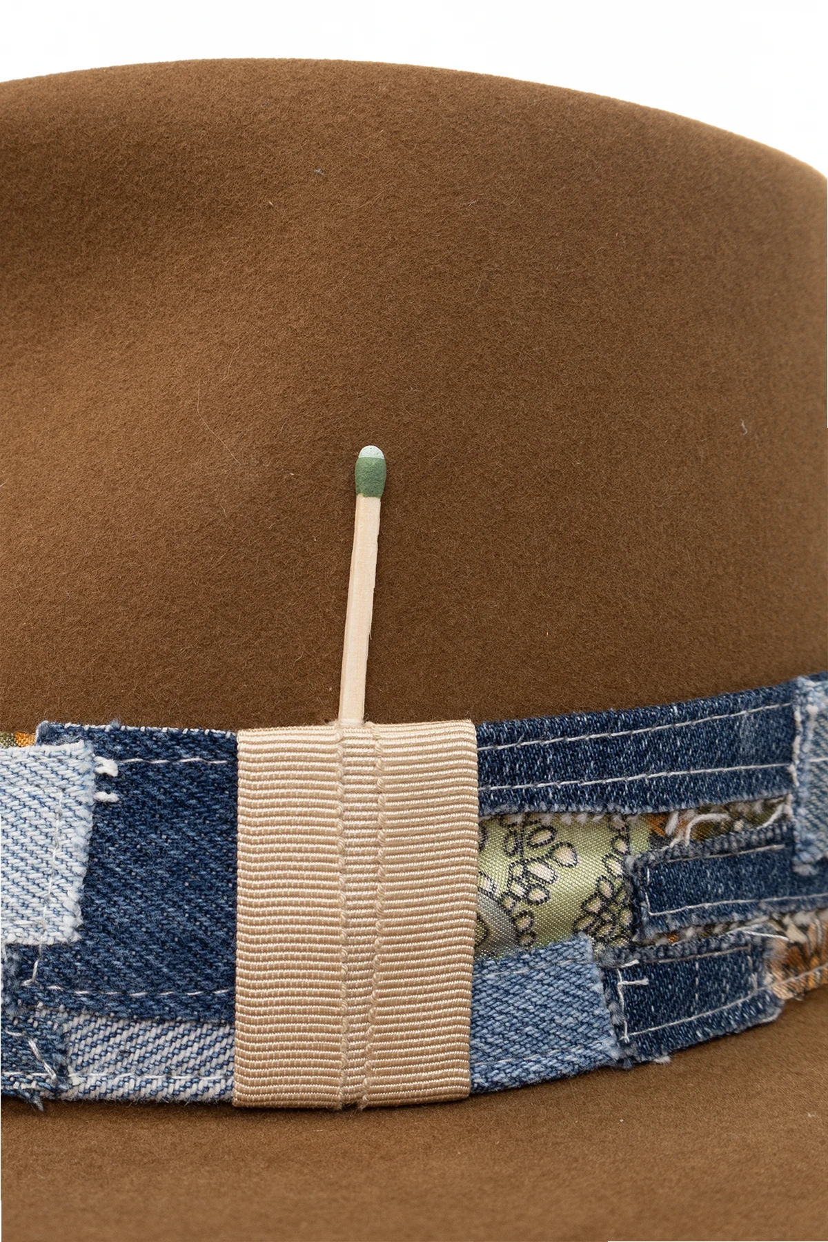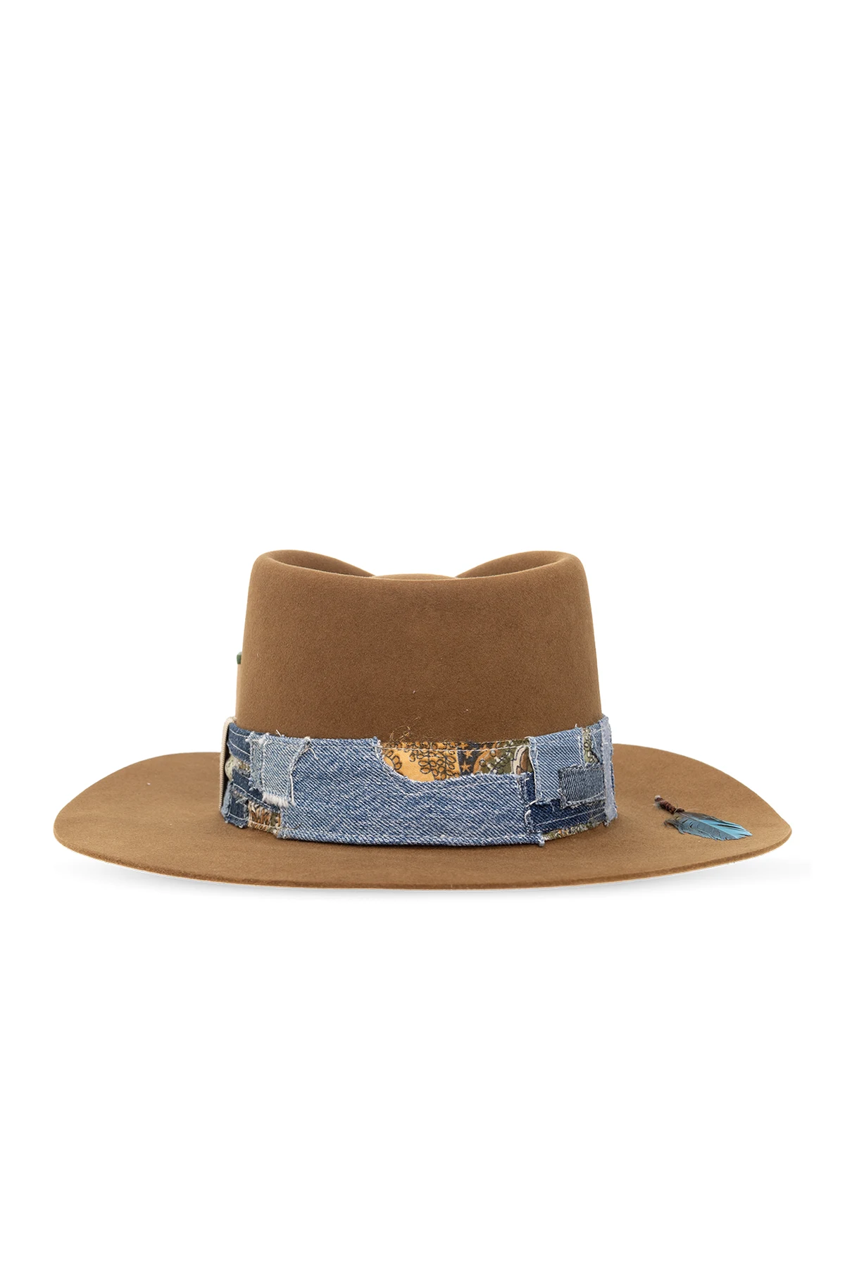 Brown ‘692’ fedora hat from Nick Fouquet. Made of felt, this item features a denim patchwork band, matchstick and blue feather.