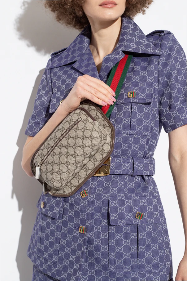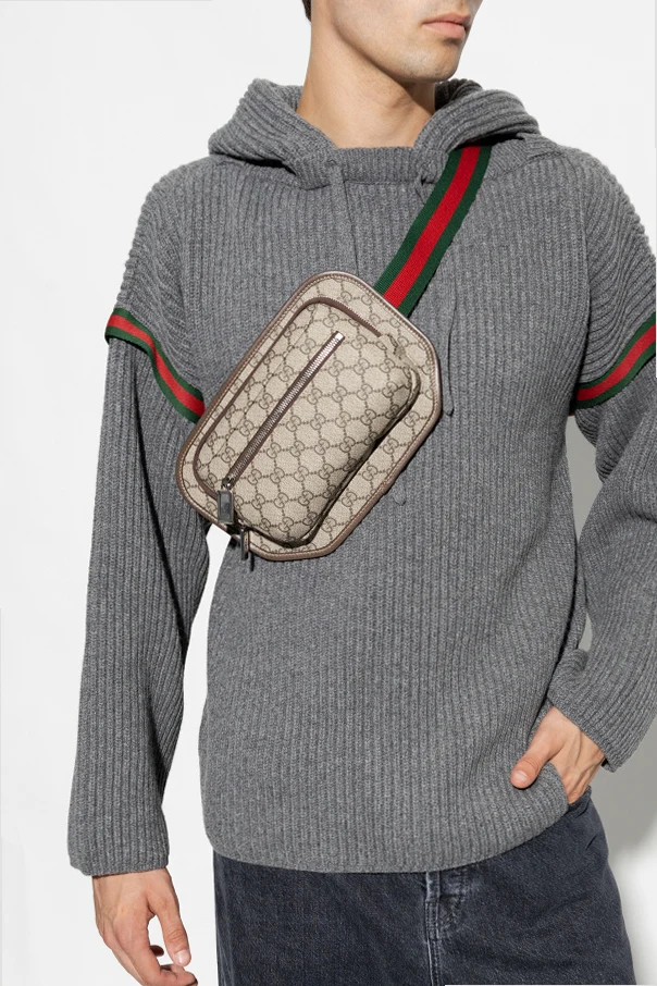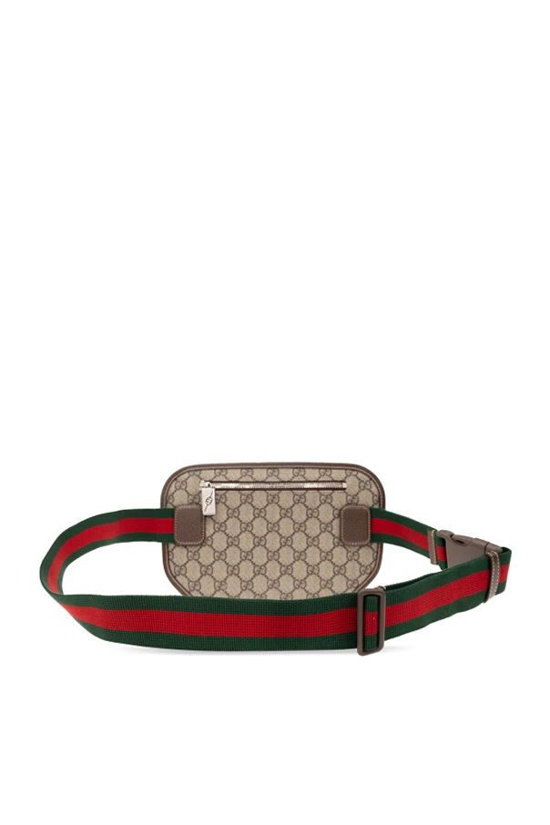 Beige and brown belt bag from Gucci. Crafted from ‘GG Supreme’ canvas and trimmed with calf leather, this design fastens via a zip and showcases an adjustable strap with a green and red Web motif, two external zip pockets, silver-tone metal elements and one internal compartment.