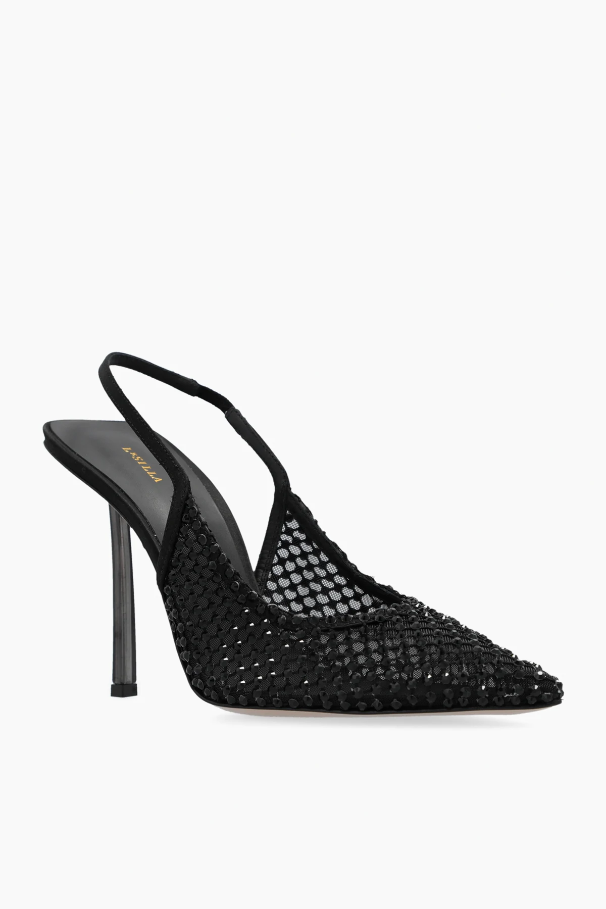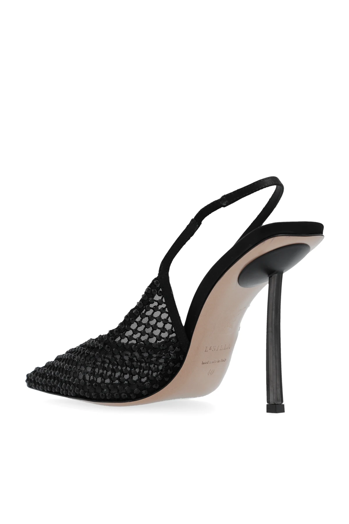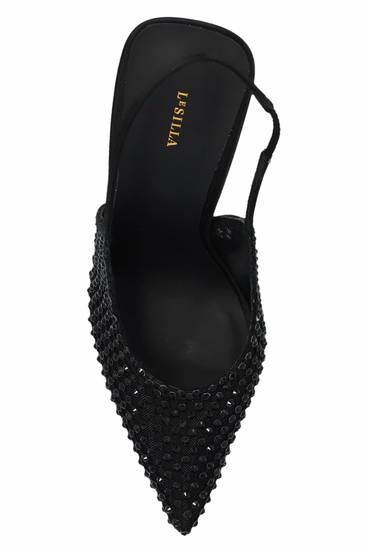Introducing the ‘Chanel Gilda’ Heels by Le Silla, a testament to unparalleled craftsmanship and the epitome of sophistication. These slingback pumps, with their classic silhouette and pointed toe, exude elegance with every step. The black fabric upper, intricately adorned with shimmering crystals, creates a mesmerizing texture that captures the light, ensuring you stand out with a refined sparkle. The heels boast a high, slender profile, meticulously crafted for a seamless, glossy finish that mirrors the luxurious appeal of patent leather. This exquisite pair is graced with Le Silla's golden logo on the inner strap, a hallmark of authenticity and designer flair. The insole, cloaked in black and possibly accented with the manufacturer's name in gold, further attests to the brand's attention to detail and quality. Constructed from a transparent material covered in a crystal-embellished mesh, the ‘Chanel Gilda’ Heels promise not only breathtaking beauty but also comfort, thanks to the elasticated back strap. The sole, a harmonious blend of leather and rubber, offers durability and a soft, beige contrast that beautifully complements the sparkling black exterior. Why Purchase These Heels? Elegant slingback silhouette with a sophisticated pointed toe design. Exquisite crystal embellishments for an eye-catching, luminous effect. Signature Le Silla craftsmanship, synonymous with luxury and exclusivity. Comfortable and secure fit, courtesy of the elasticated back strap. Versatile and durable sole, crafted from premium leather and rubber.