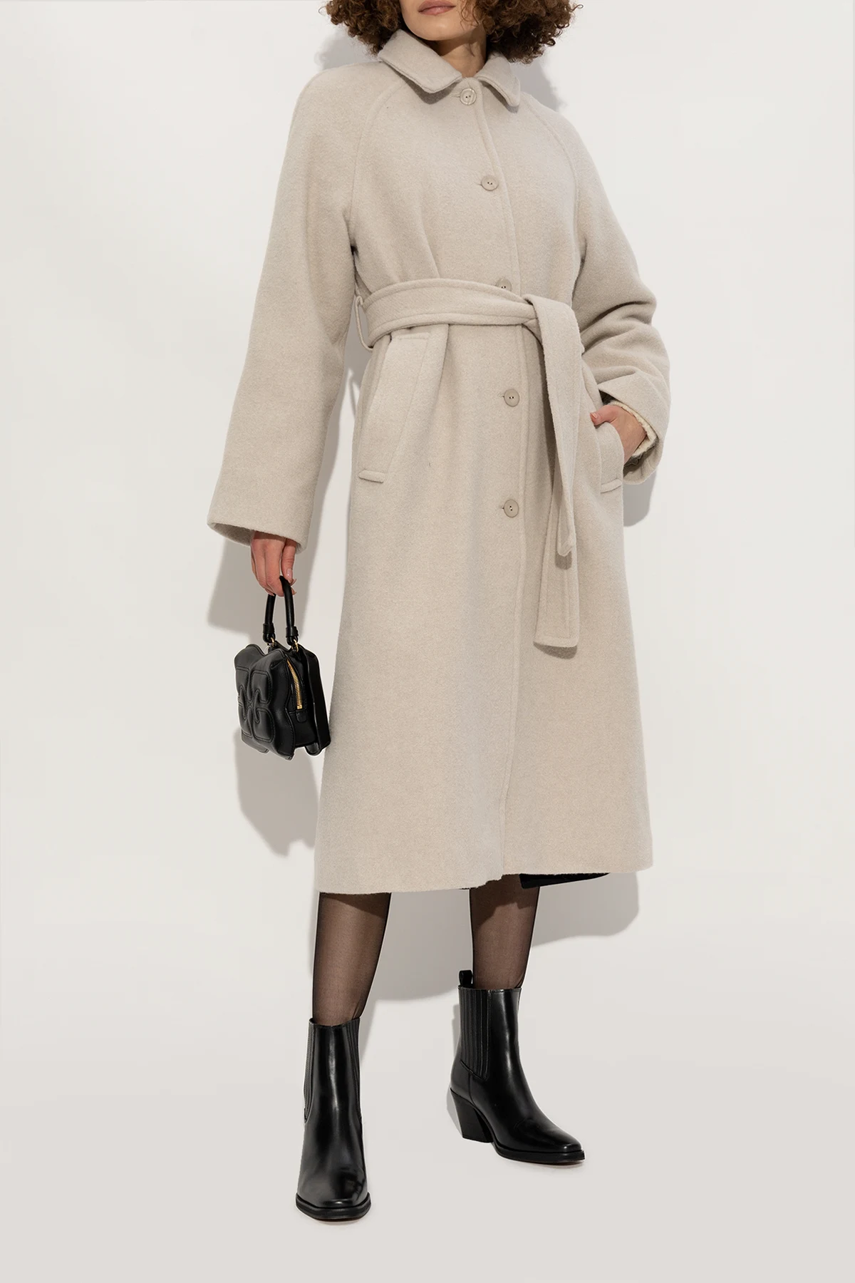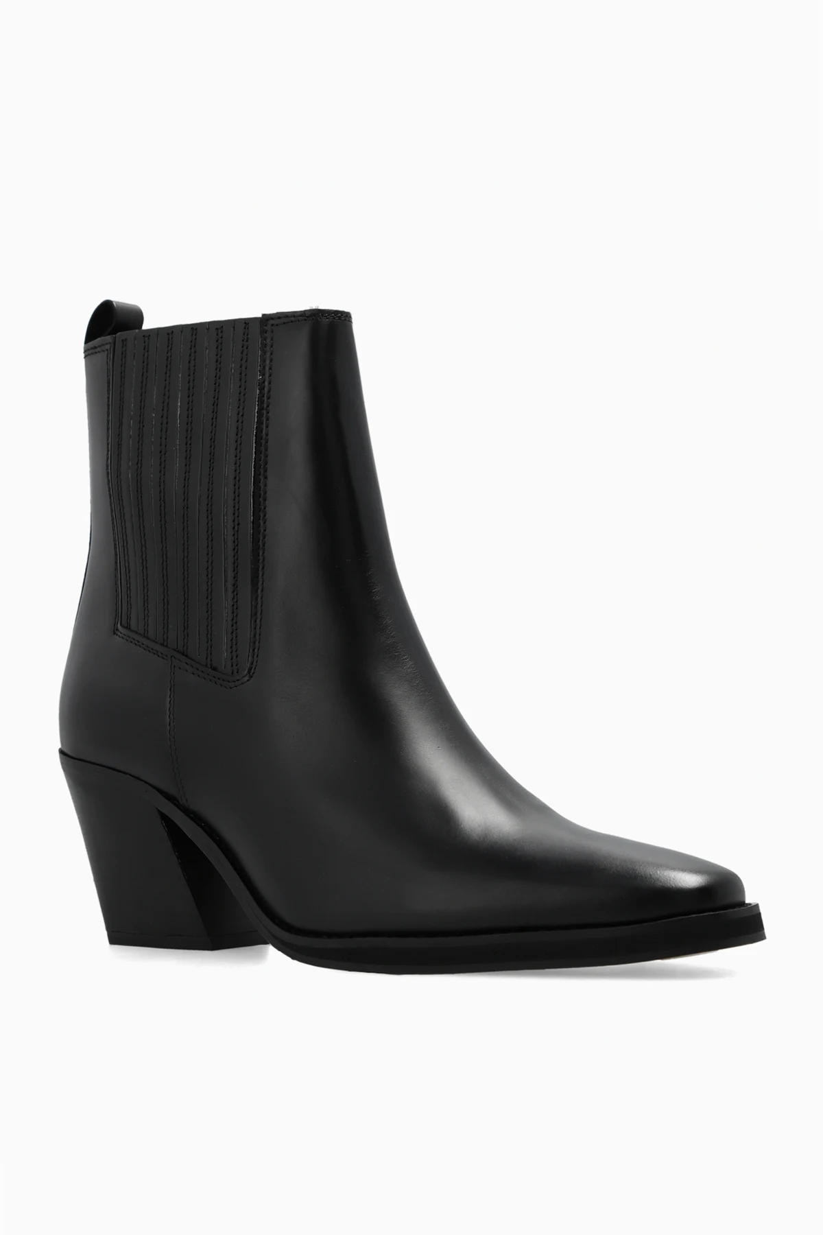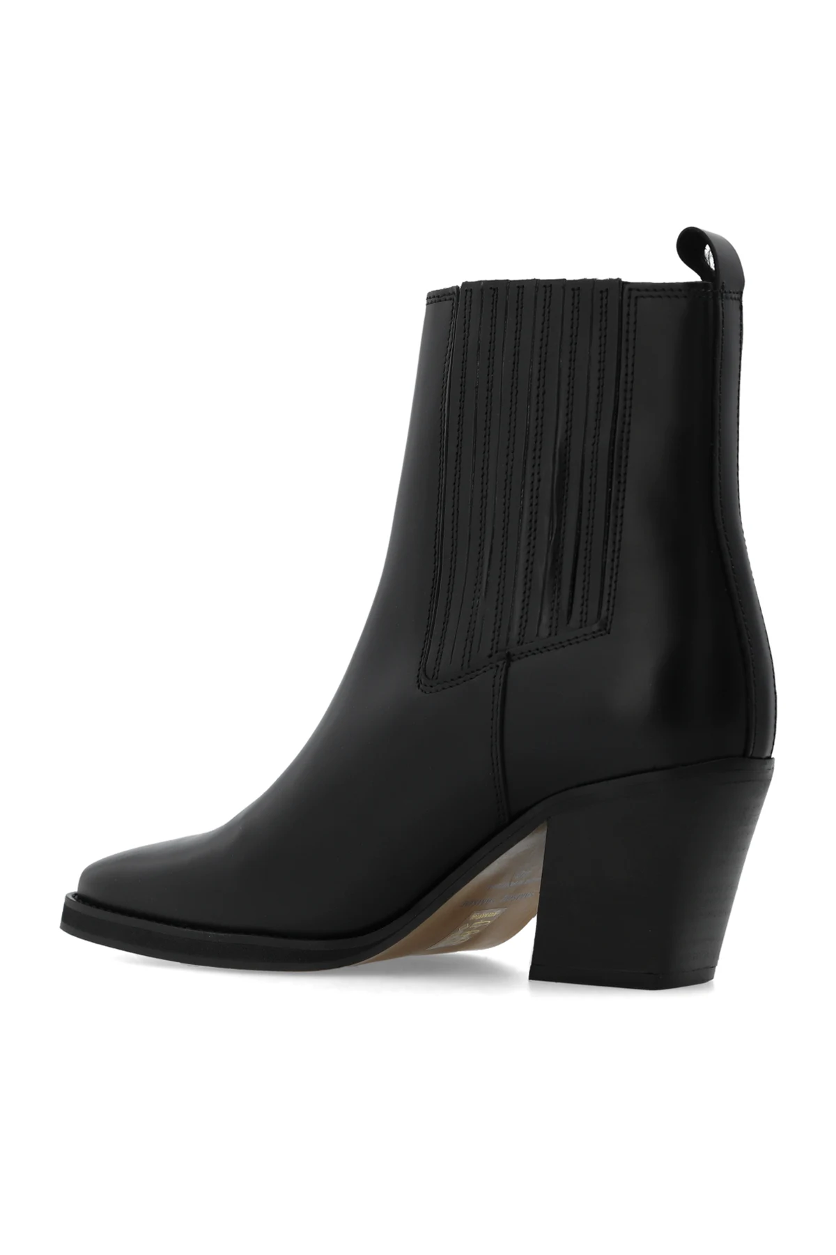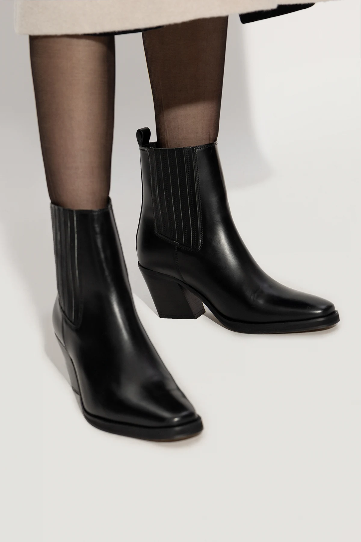 Black ‘Sophia’ boots from Samsoe Samsoe. Made of leather with a round toe, this model sits on a beige leather sole and features elastic panels on the sides.