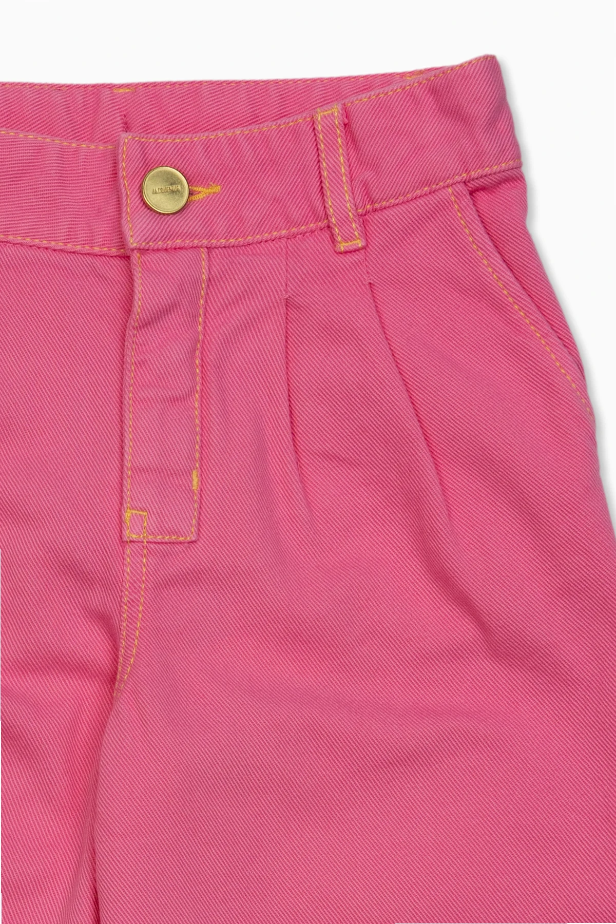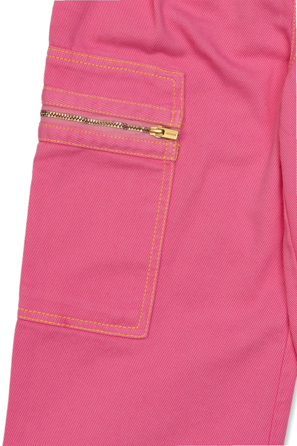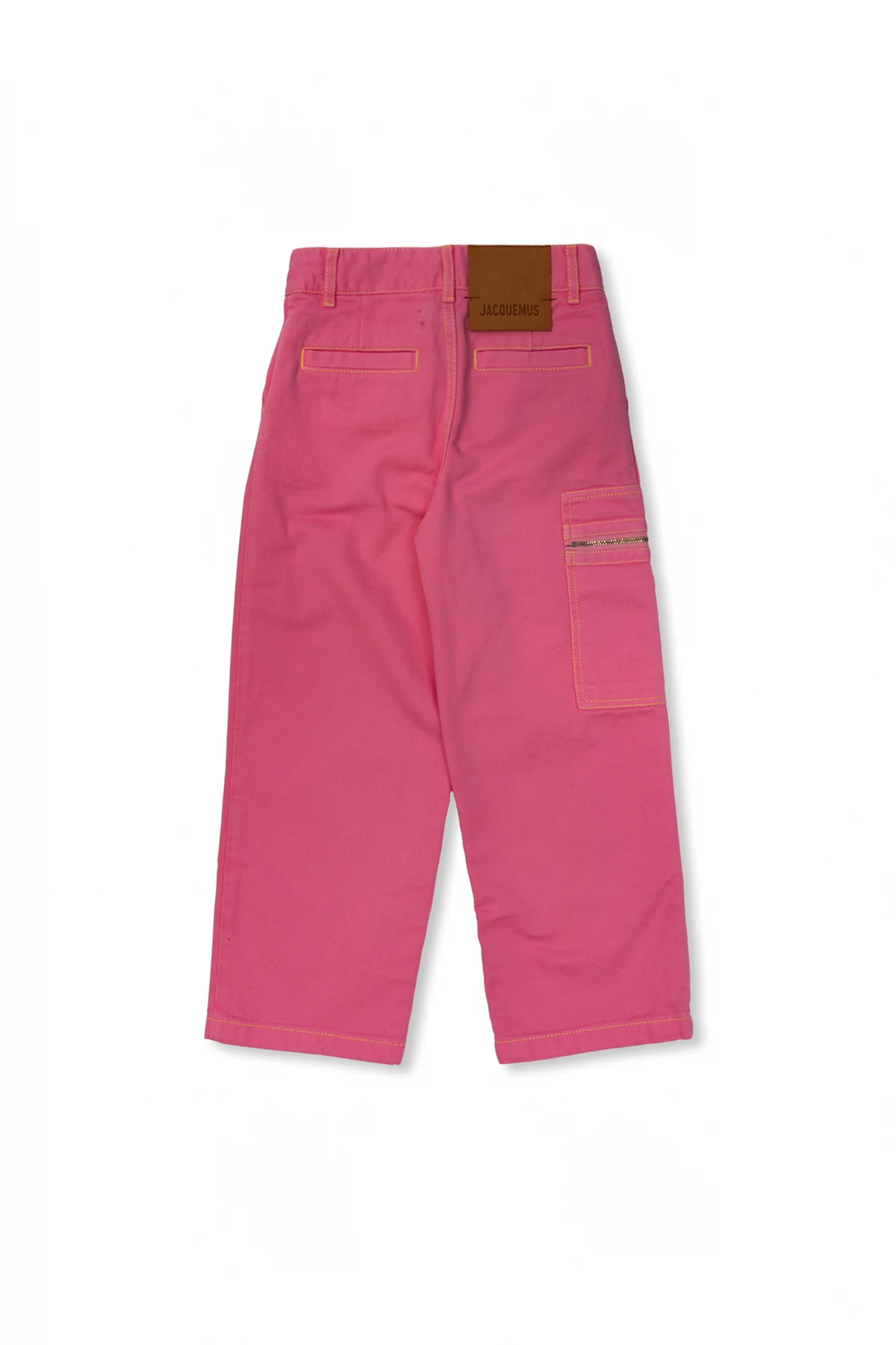 Pink jeans from Jacquemus Kids. Cut with a high-rise waist, this pair falls with wide, straight legs and features a zip fly with a button, four slip pockets, one side zip pocket and contrasting yellow stitching details.