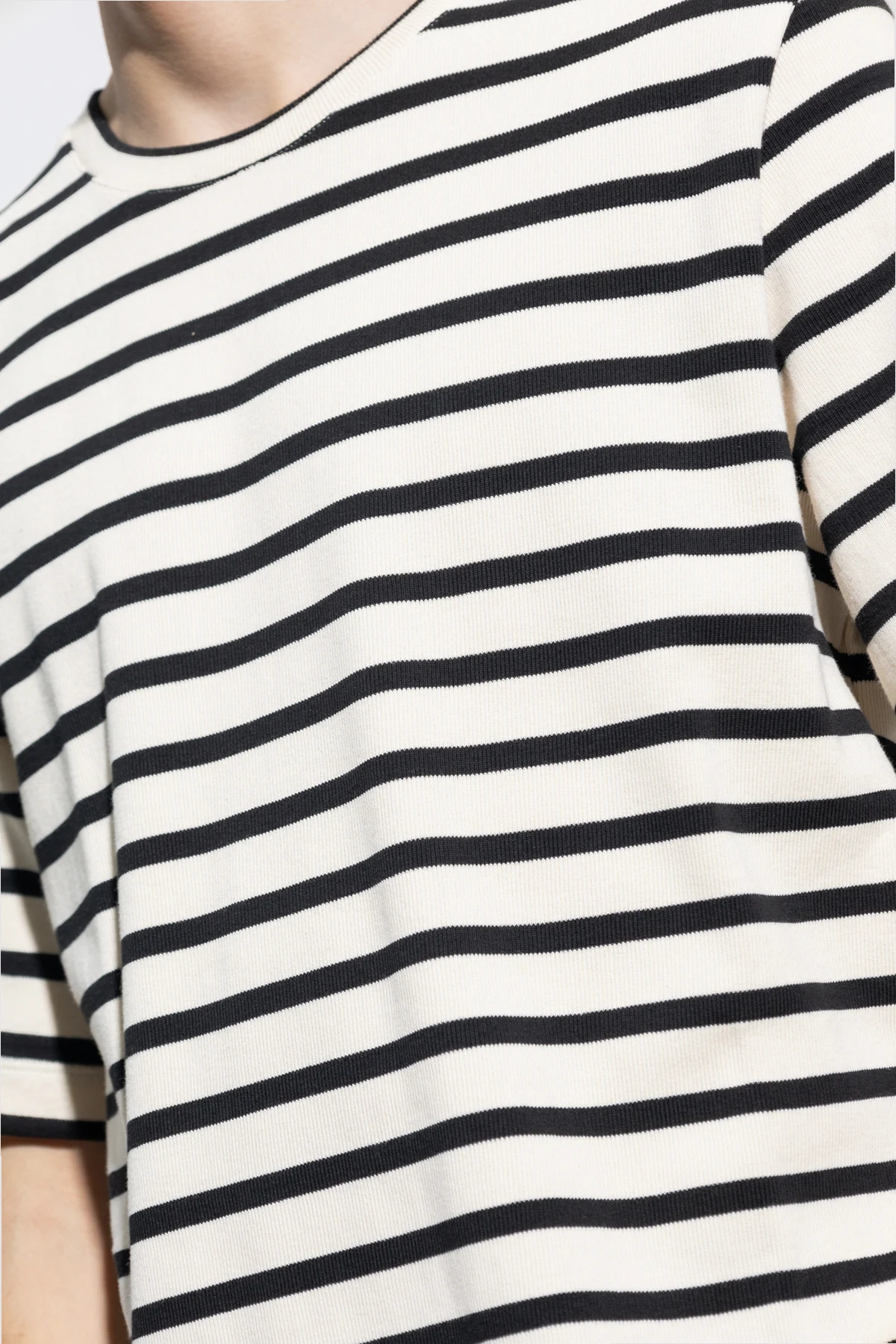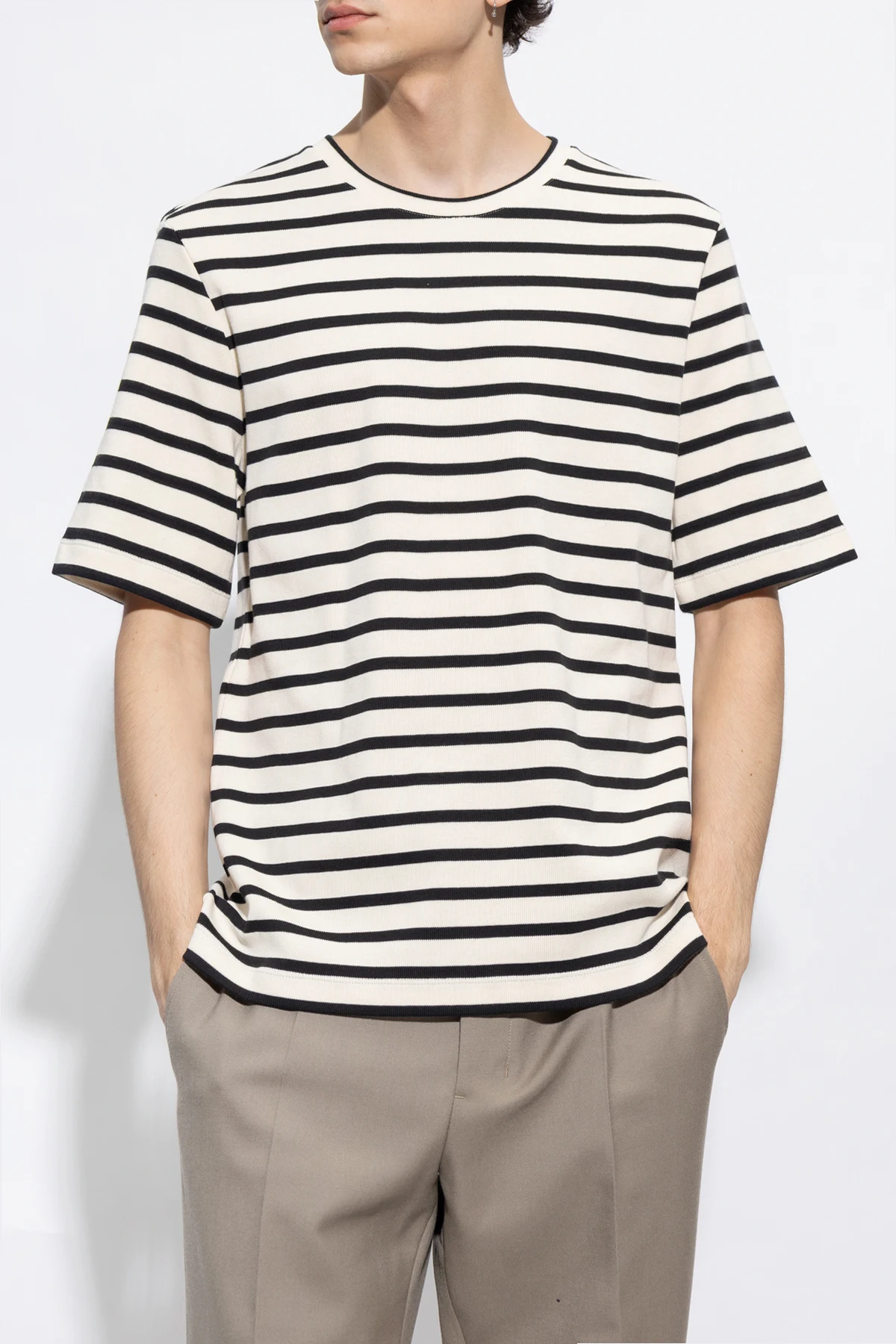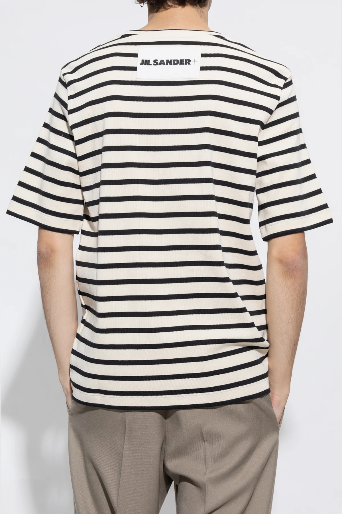 Cream and black crewneck T-shirt from JIL SANDER+. Made of cotton with a relaxed fit, this style showcases a stripe pattern, short sleeves, ribbing on the collar as well as a logo patch on the back.