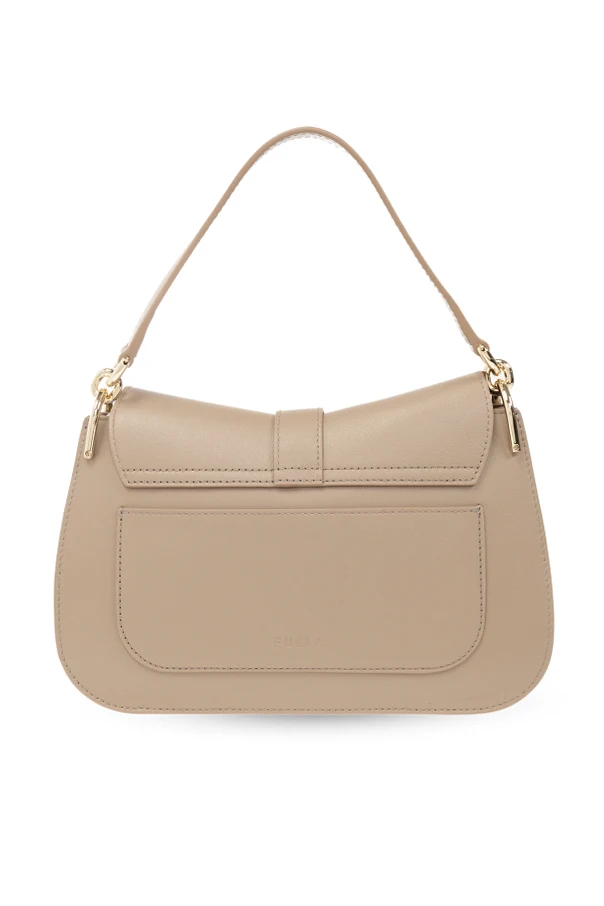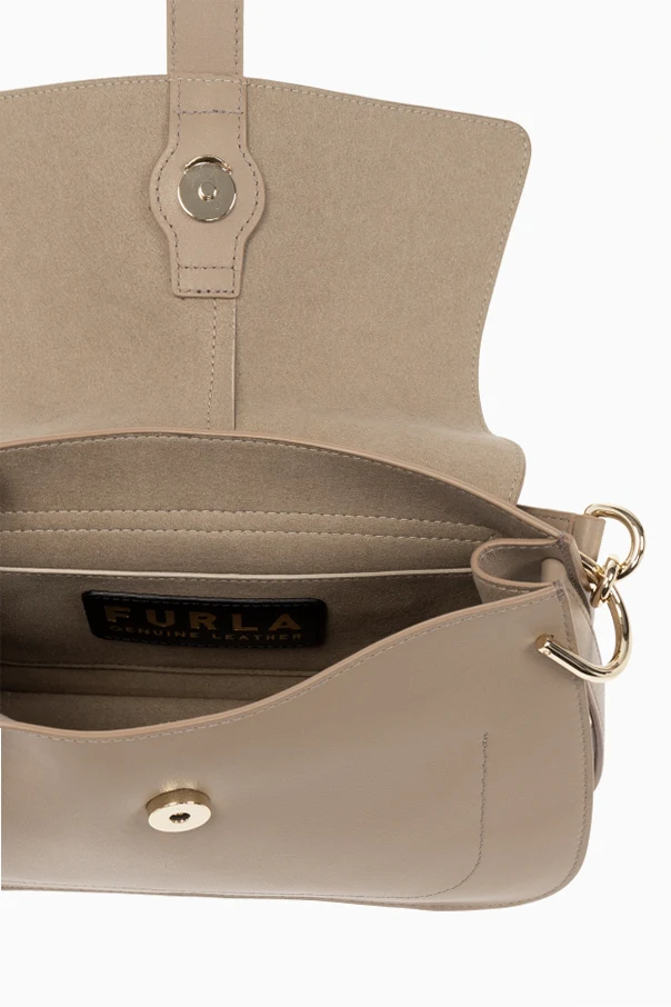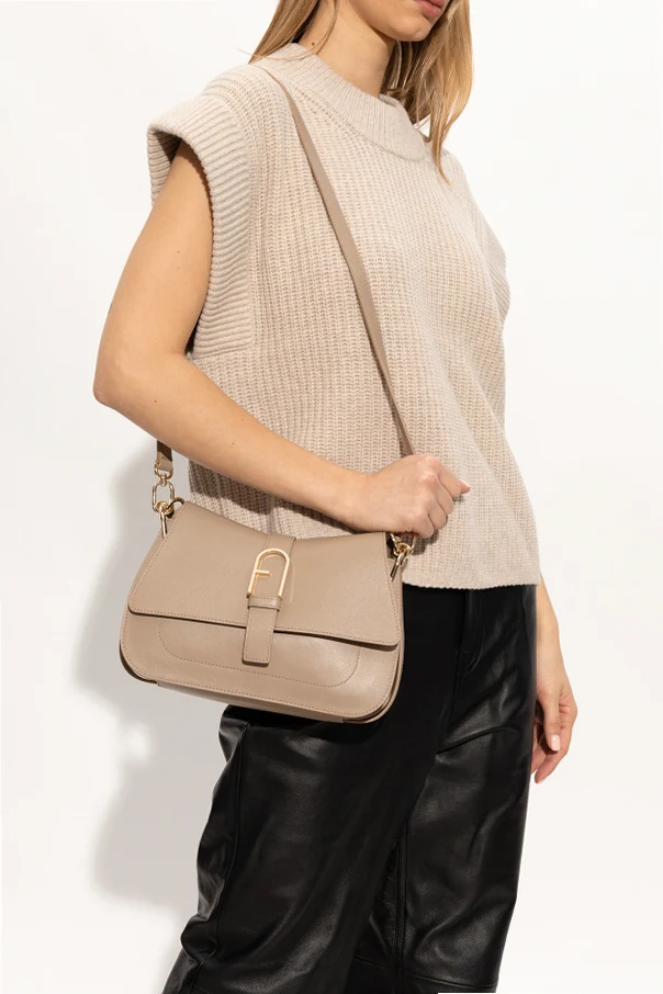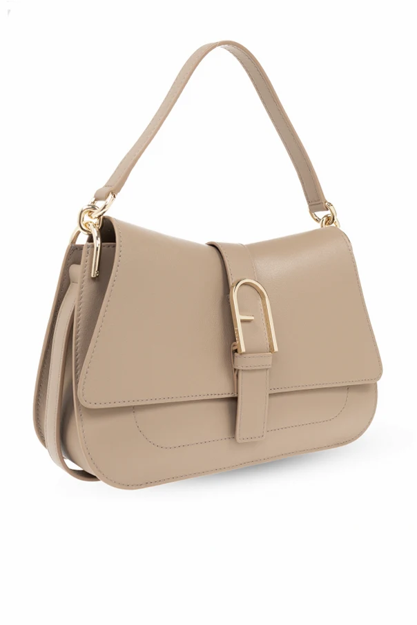 Khaki ‘Flow Medium’ shoulder bag from Furla. Made of leather, this model features a magnetic snap, decorative strap with a logo buckle, half-round handle, detachable and adjustable strap, gold-tone metal hardware and one internal compartment with one slip pocket.