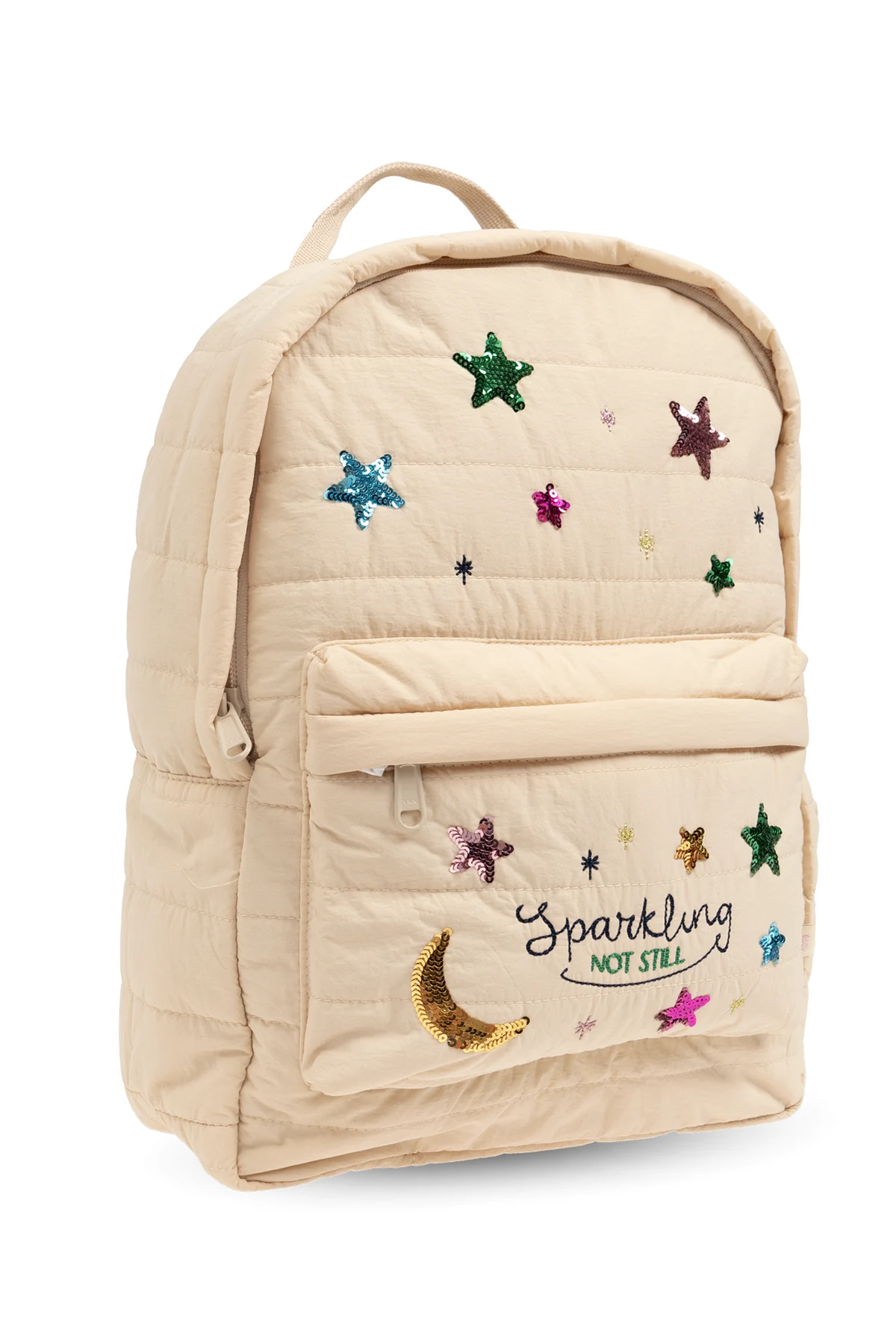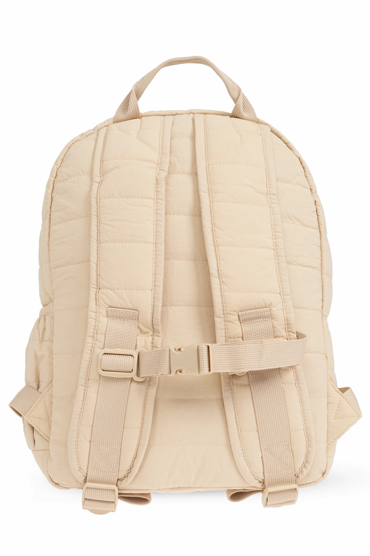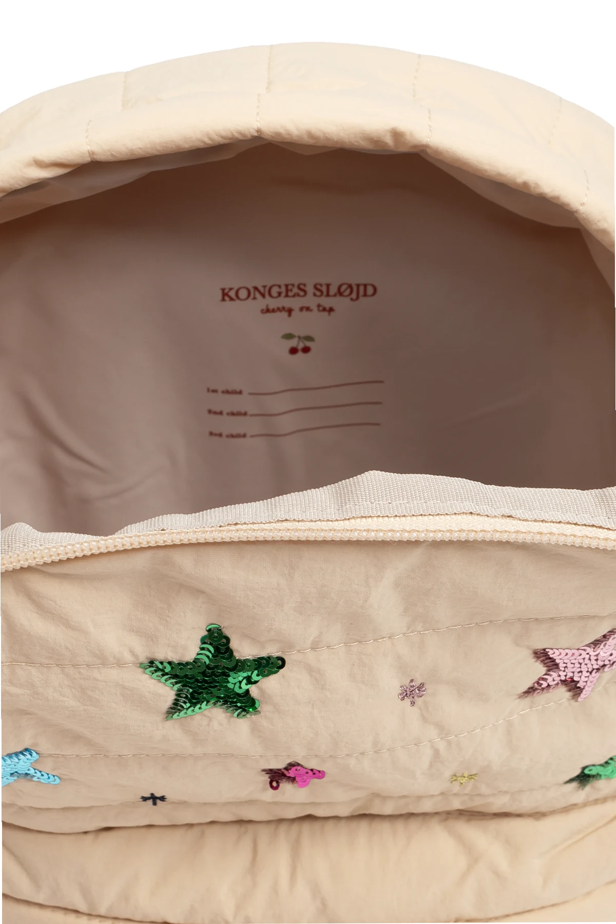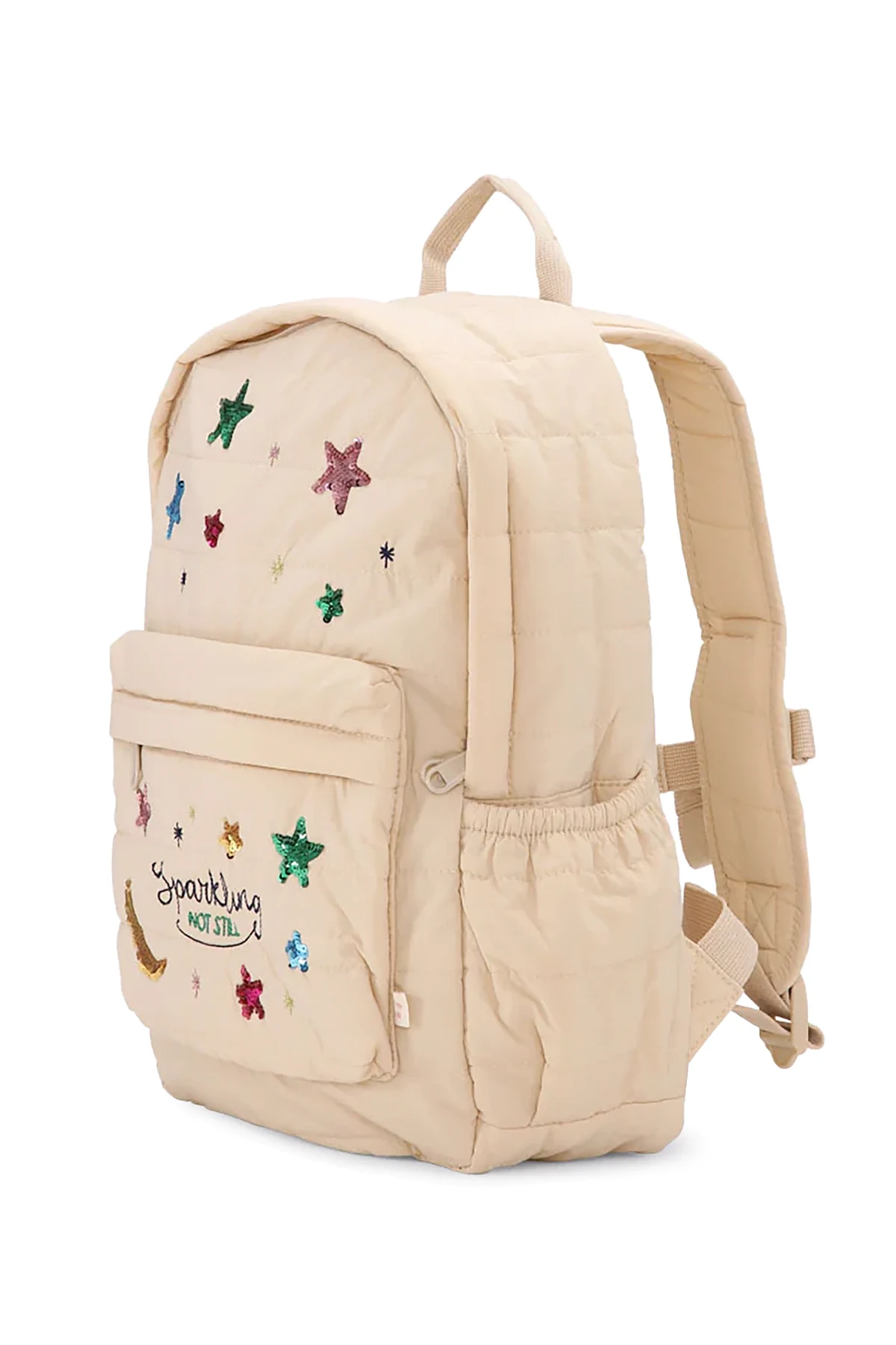 Discover the epitome of elegance and functionality with our exclusive quilted backpack for children by the renowned Danish brand, Konges Sløjd. This luxurious accessory seamlessly blends style and practicality, making it an ideal choice for your little one. Crafted from premium quilted nylon, this backpack boasts a classic rectangular shape with a rounded top. The bewitching design features colorful appliqués of stars and moons in vibrant shades of green, pink, blue, violet, and gold, adding a whimsical touch to its sophisticated beige exterior. The front pocket proudly displays the phrase "Sparkling not still," accompanied by a discreet designer label in the lower right corner. The backpack is equipped with a practical front zip pocket, a spacious main compartment, and a side pocket perfect for a water bottle. The interior is lined with durable polyester, ensuring longevity and ease of maintenance. The adjustable straps provide a comfortable fit, while the dual-zip closure offers secure storage, making it both water and wind-resistant. Why choose this product? Exquisite quilted design with colorful star and moon appliqués Durable and water-resistant nylon exterior Spacious and practical compartments for all essentials Comfortable adjustable straps Eco-friendly materials by Konges Sløjd, a leader in sustainable children's fashion