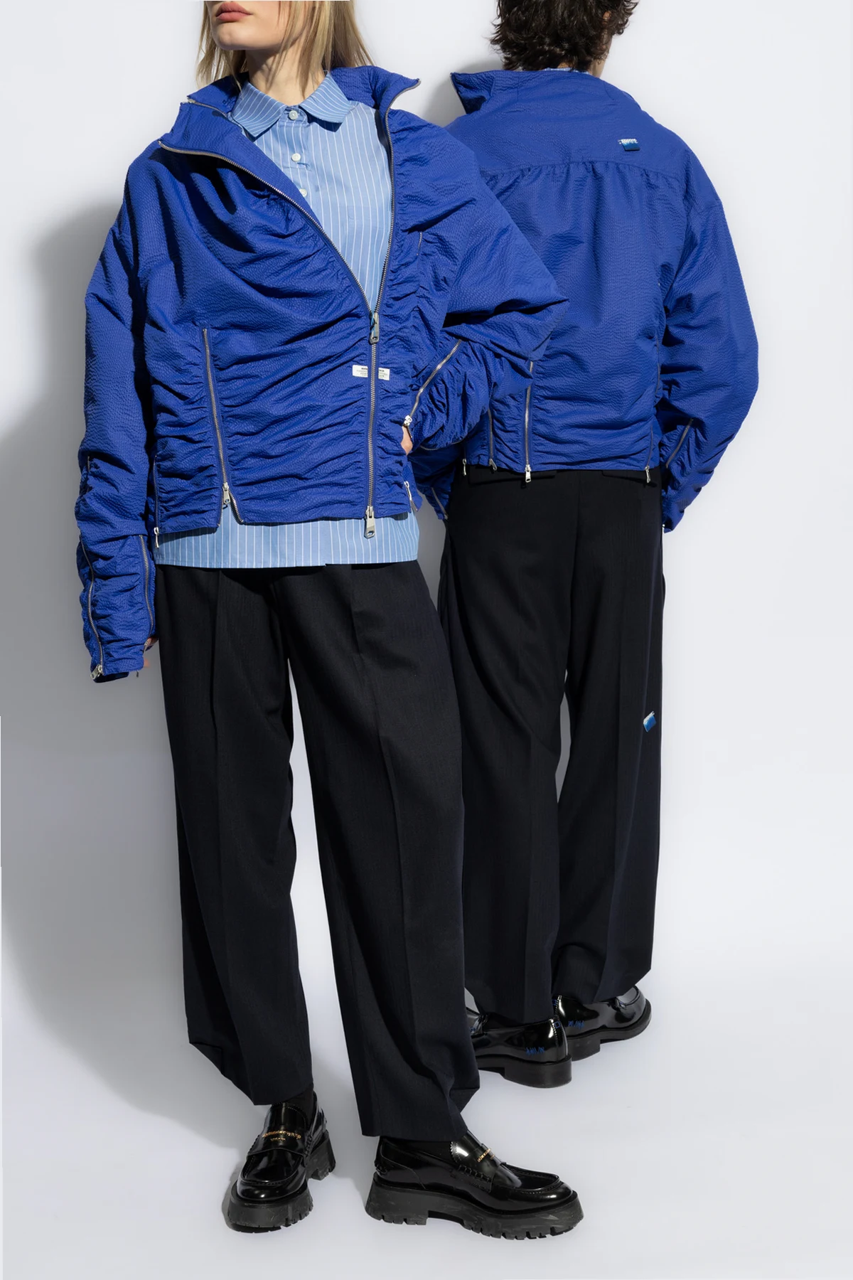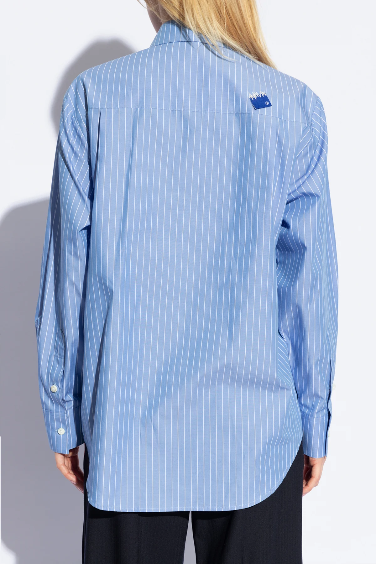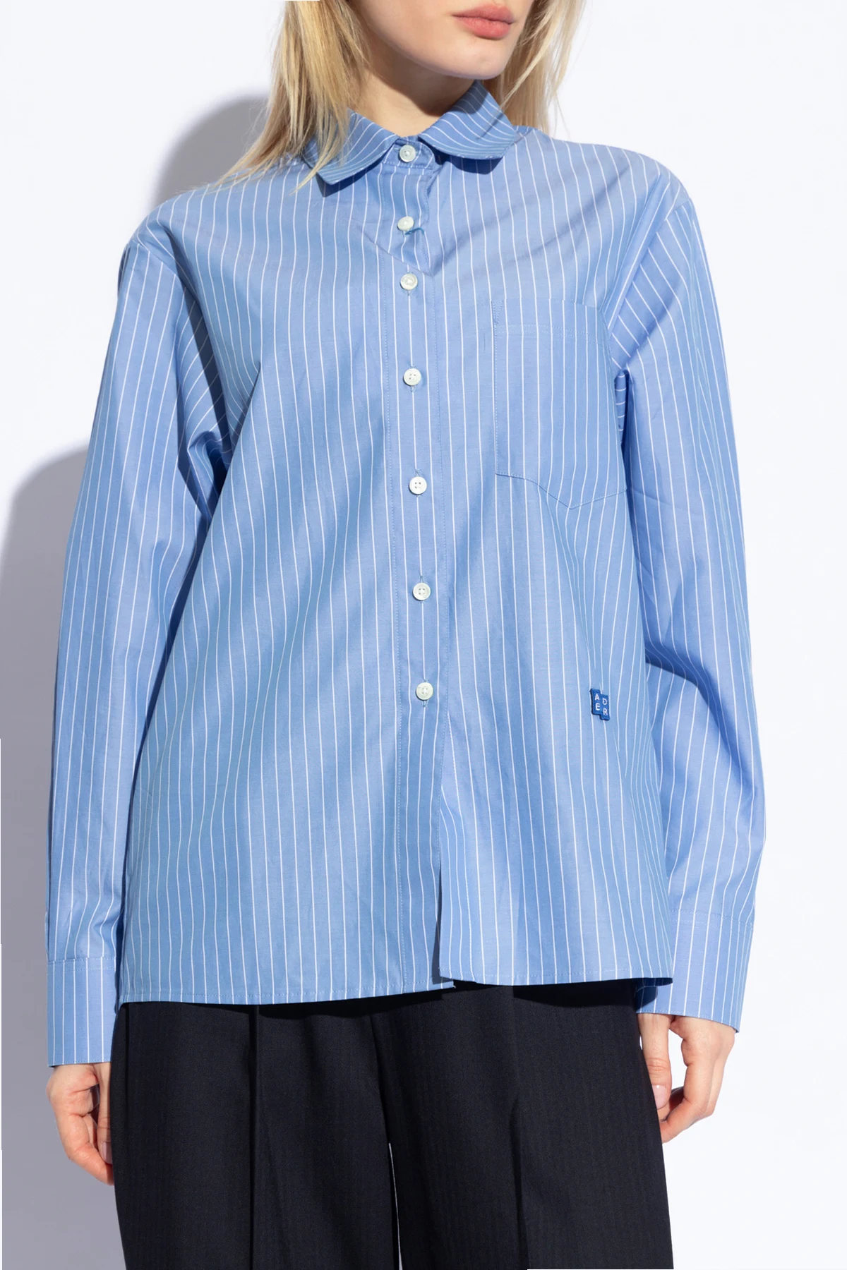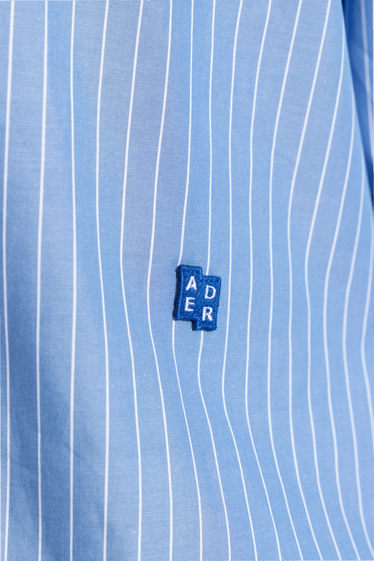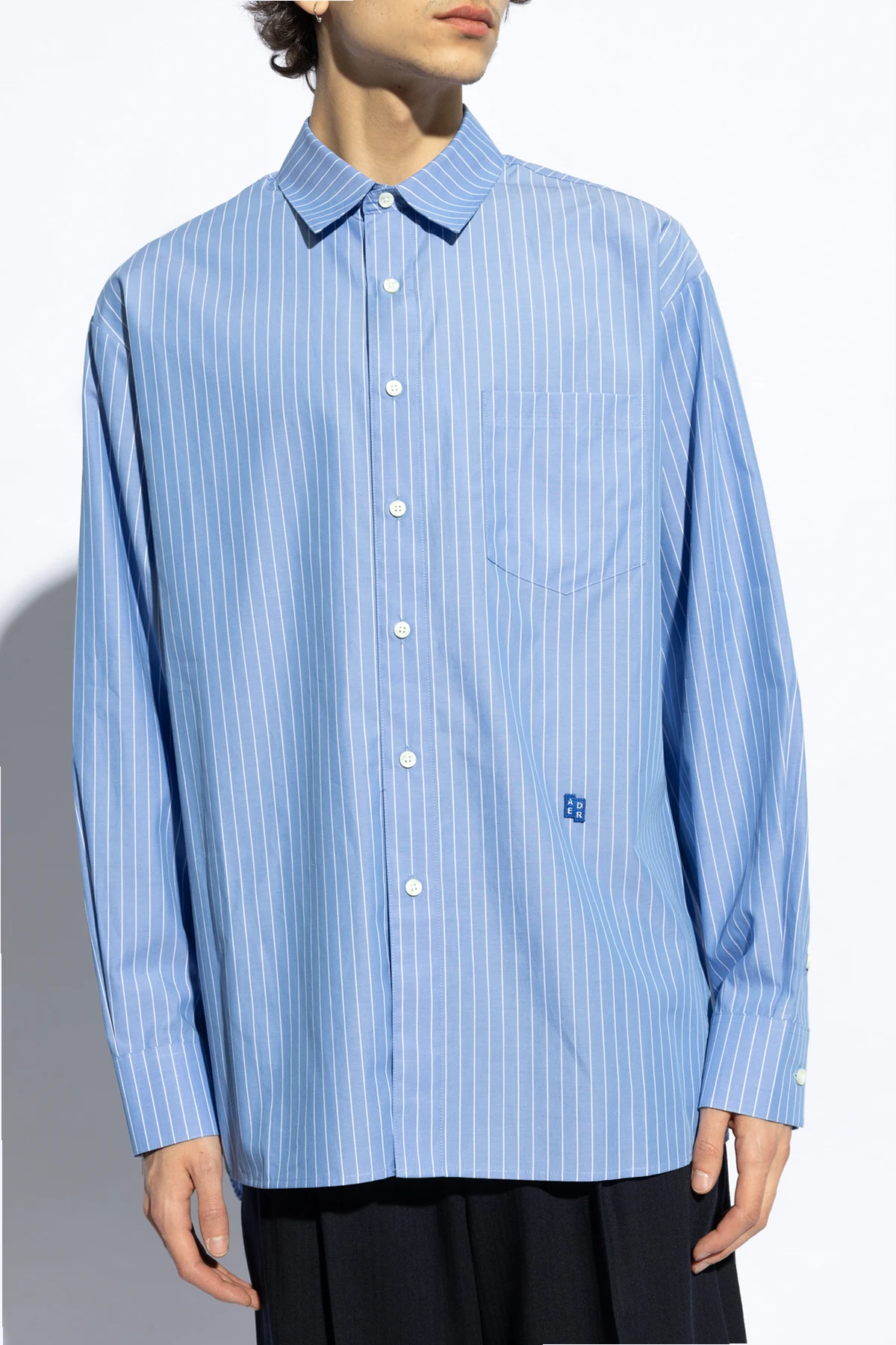Introducing the quintessence of modern elegance and comfort: the Ader Error Light Blue Striped Cotton Shirt. Crafted from the finest lightweight cotton, this piece promises not only breathability but also an unmatched softness against the skin, making it a perfect choice for warmer days. The shirt's light blue hue, accented with crisp white vertical stripes, offers a refreshing visual appeal, while its classic cut ensures a versatile fit that complements any wardrobe. The shirt features a traditional collar and is fastened with buttons down the front, culminating in a polished look. Long sleeves, finished with buttoned cuffs, add a touch of sophistication. A discreet pocket on the left breast, adorned with a small, blue, rectangular designer logo patch, subtly enhances its uniqueness without overwhelming its minimalist charm. An identical logo patch graces the rear collar, echoing the designer's attention to detail and commitment to quality. Why Choose This Product? Exceptional Material: Pure cotton fabric ensures comfort and durability. Versatile Design: Classic, straightforward cut makes it suitable for various occasions and pairings. Subtle Elegance: The light blue and white striped pattern offers a sophisticated aesthetic. Attention to Detail: Designer logo patches add a touch of exclusivity.