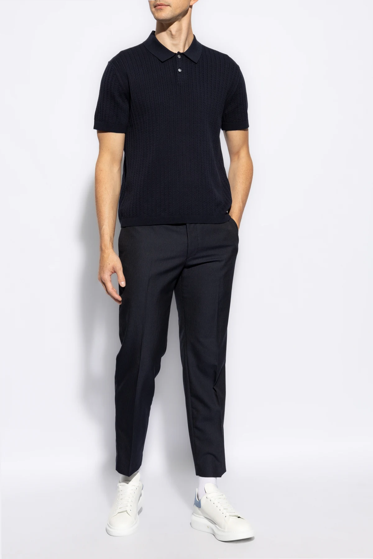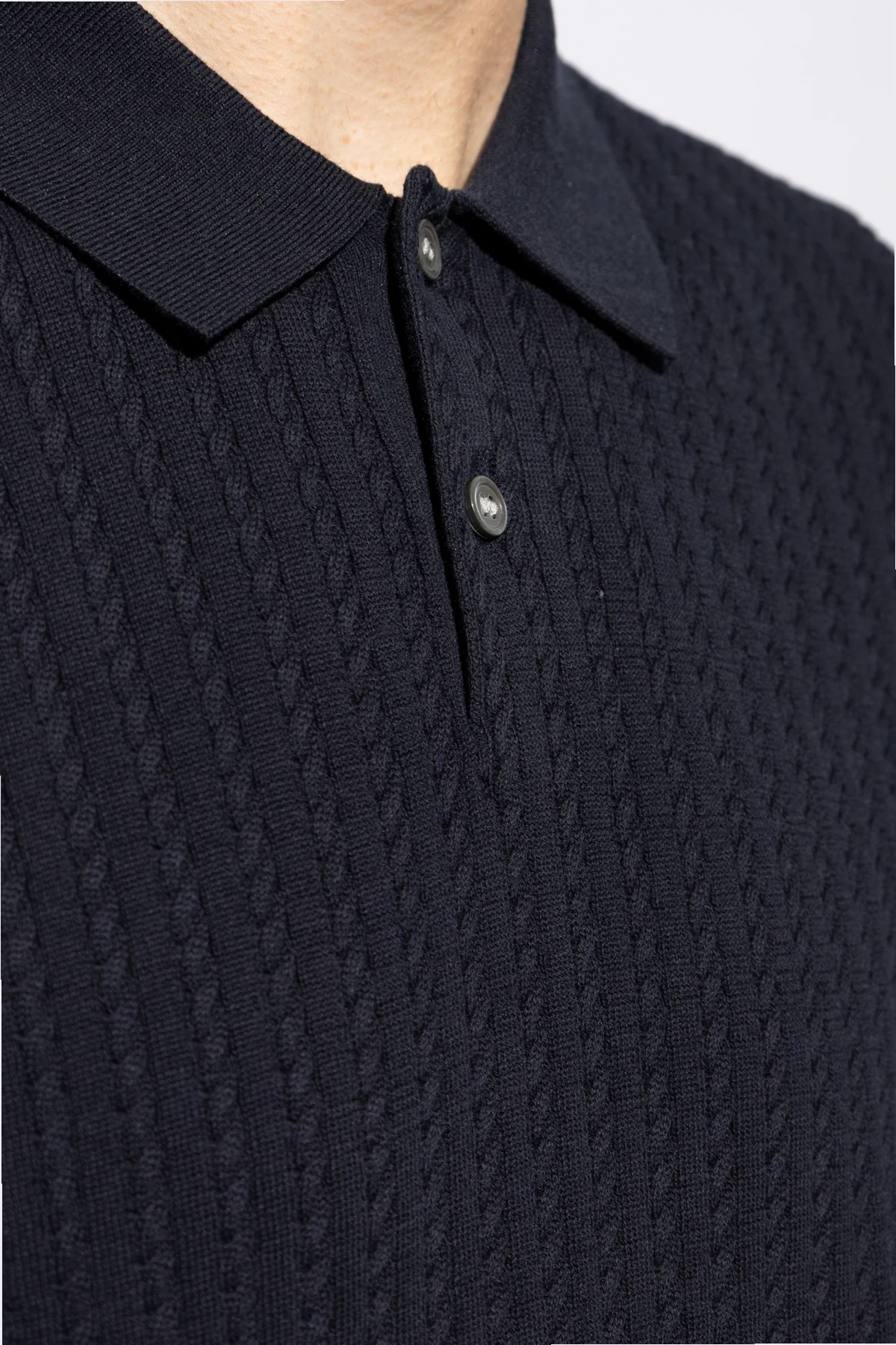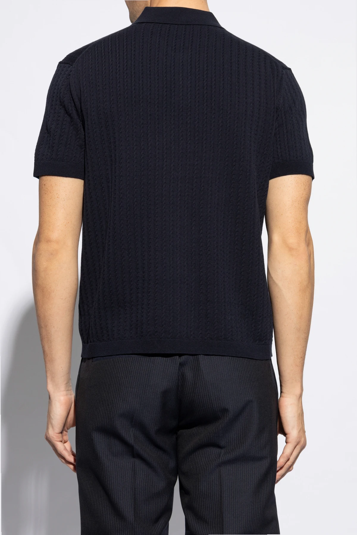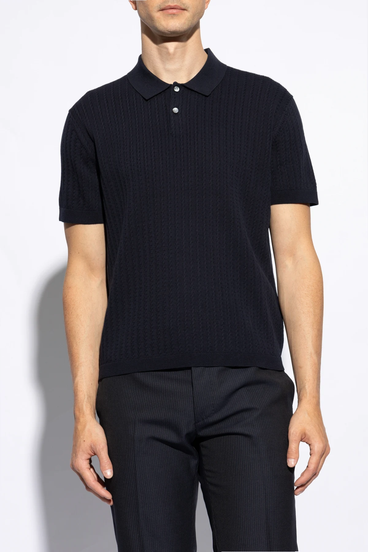 Introducing the quintessence of sophistication and comfort - our Navy Knitted Polo by Theory. Crafted with meticulous attention to detail, this polo embodies a classic silhouette with short sleeves and a traditional collar, complemented by a distinctive button placket featuring two contrasting buttons that enhance its elegance. The polo's texture is accentuated by a pronounced horizontal knit pattern, lending it a visual depth that is both refined and engaging. Made from a blend of 95% cotton, 4% recycled nylon, and 1% spandex, this garment offers unparalleled softness and flexibility, ensuring both comfort and durability. Its deep navy hue is not only universally flattering but also versatile, allowing for effortless pairing with a wide range of wardrobe staples. Absent of any overt branding or logos, this piece speaks to a minimalist aesthetic that values subtlety and sophistication above all. Why Purchase This Product? Elegant Design: Classic polo style with unique button details for a refined look. Premium Materials: High-quality blend for softness, stretch, and durability. Versatile Styling: Deep navy color easily coordinates with other apparel. Minimalist Aesthetic: No visible logos or branding, emphasizing clean lines and simplicity.