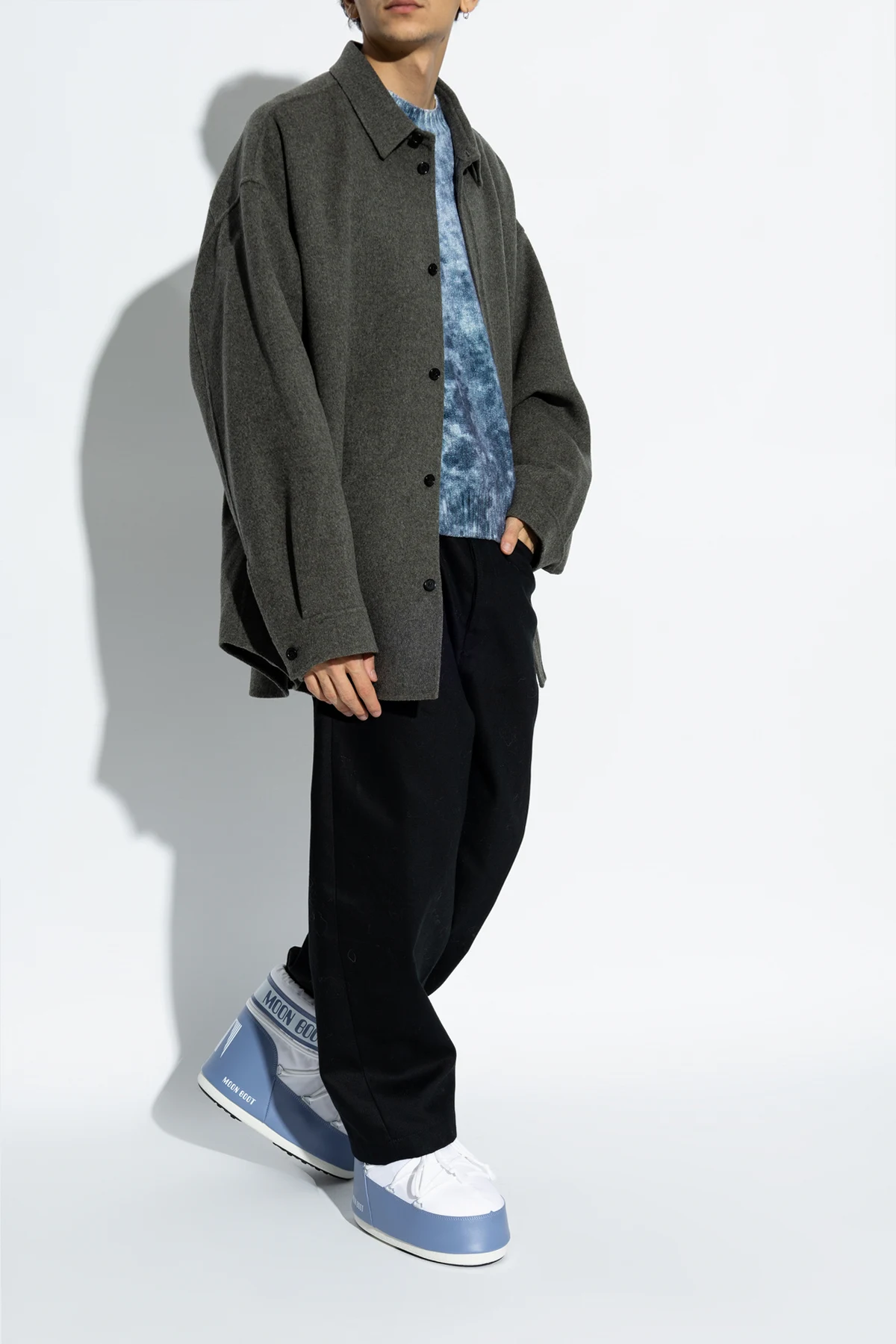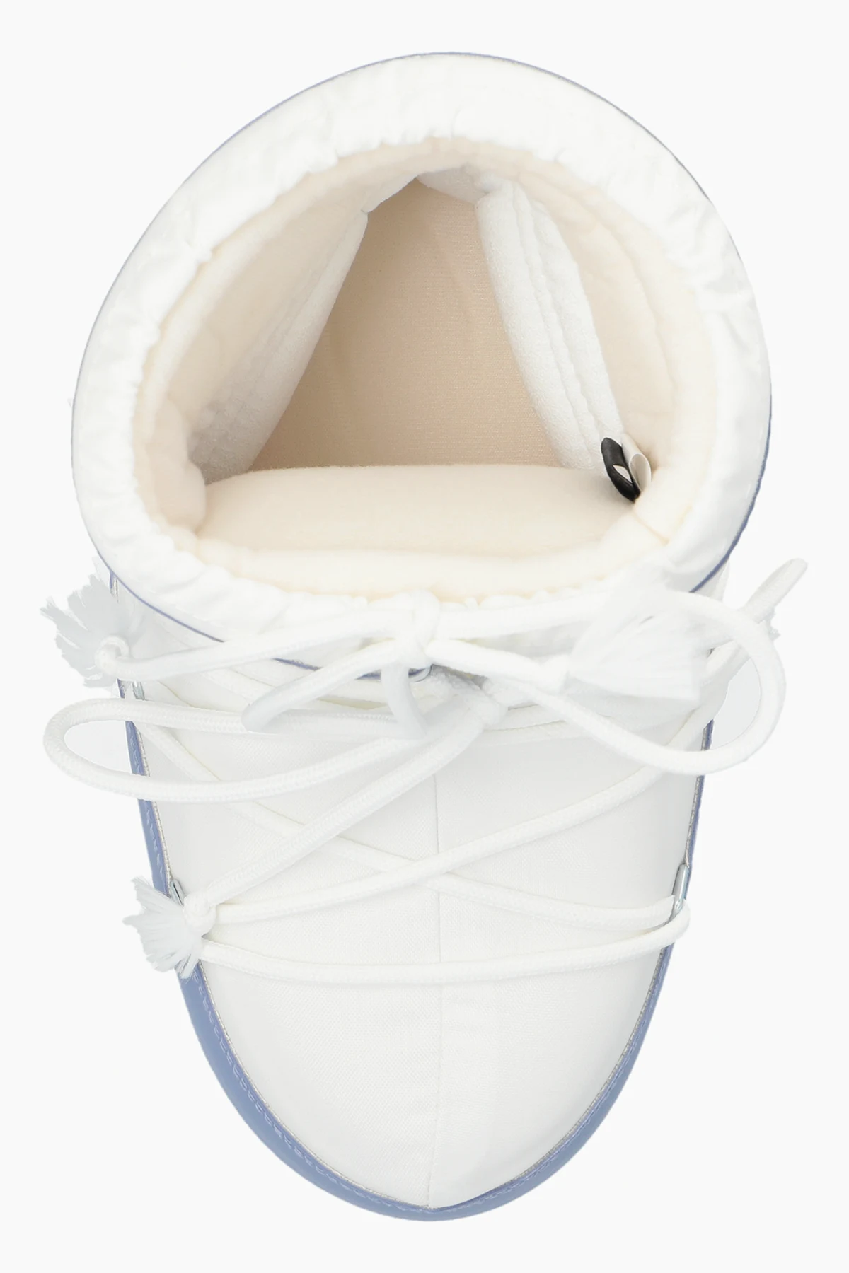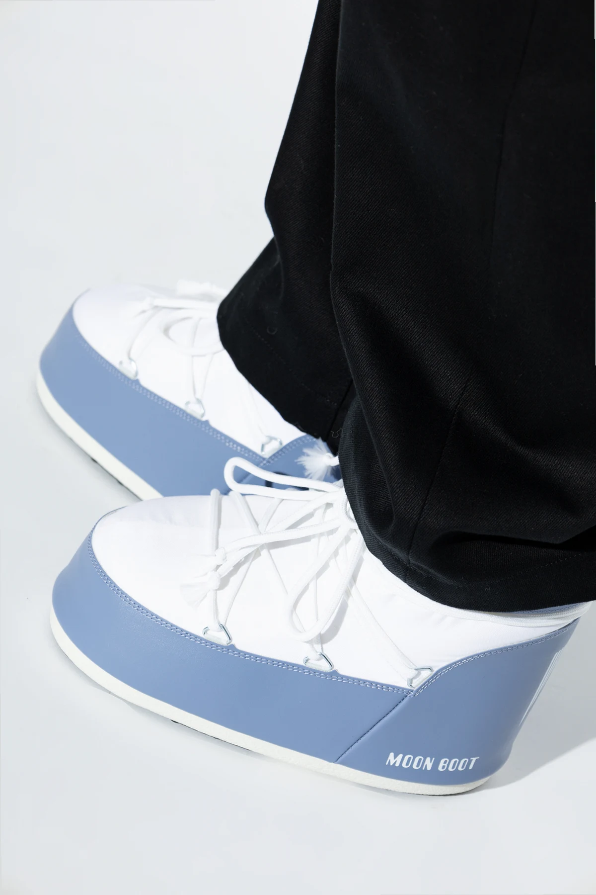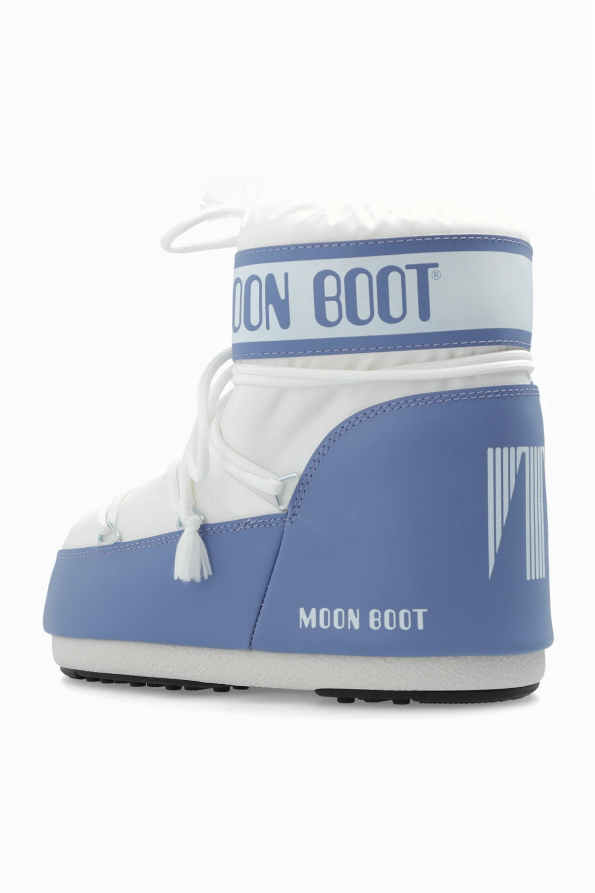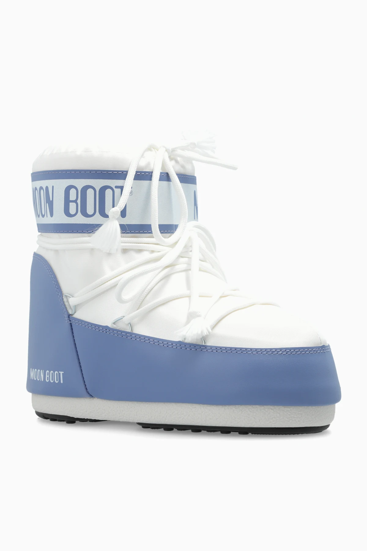 Introducing the exquisite Icon Low Nylon snow boots by the prestigious brand Moon Boot, designed exclusively for men. These boots epitomize a blend of high fashion and unparalleled functionality. Featuring a distinguished rounded shape with a high shaft, these snow boots are meticulously crafted from lightweight and water-resistant nylon. The inner lining, made from a soft synthetic material, ensures optimal warmth and comfort. The boots showcase a dominant white hue, accented with light blue elements on the lower part and a band around the ankle. The iconic "MOON BOOT" logo is prominently displayed in blue on both the side and the ankle band, complemented by white laces that seamlessly blend with the overall design. Additional stitching and strap details enhance the unique aesthetic of these boots. Engineered for winter conditions, these boots feature a robust sole providing excellent grip and thermal insulation. The high shaft and solid construction offer superior protection against snow and cold, while ensuring stability and comfort. Why Choose This Product? Exclusive design by Moon Boot Lightweight, water-resistant nylon material Soft synthetic lining for warmth and comfort Stylish white and blue color scheme Prominent "MOON BOOT" logo detailing Robust sole for superior grip and insulation High shaft for added protection and stability