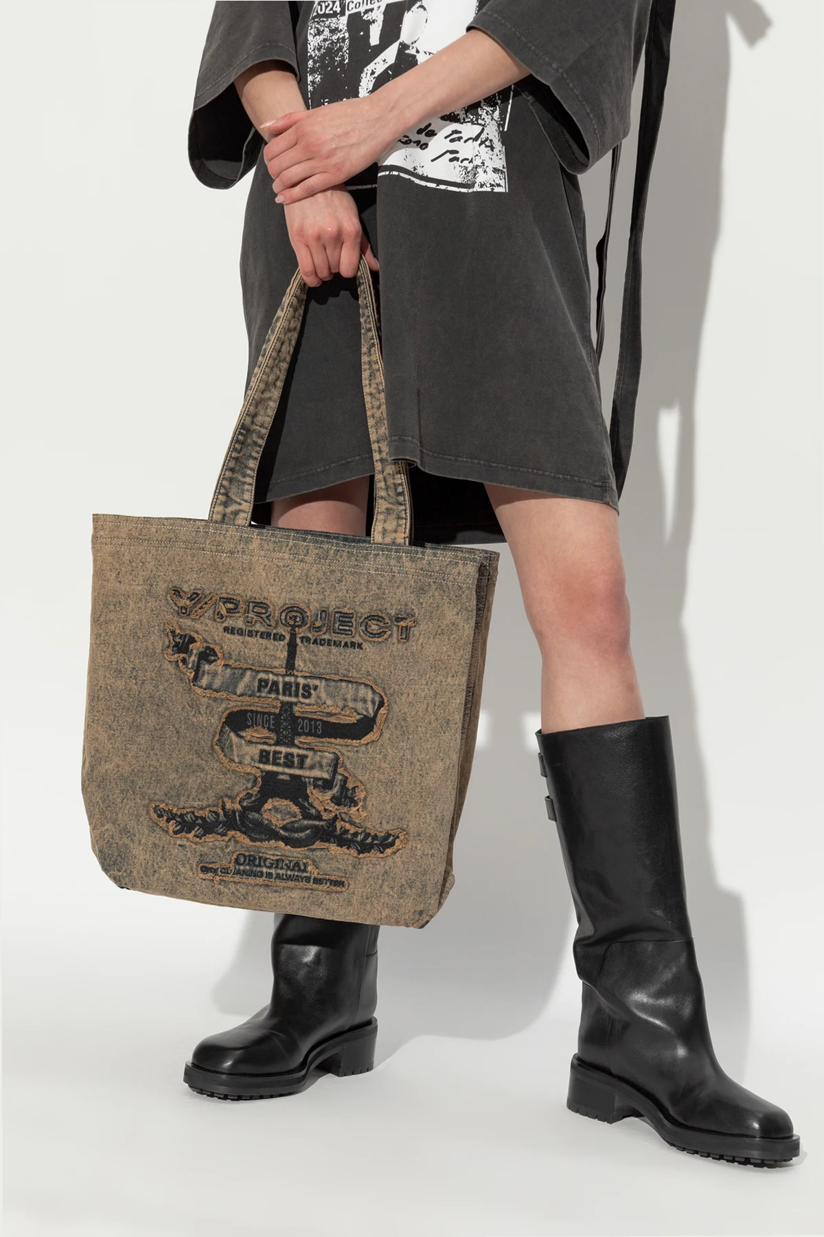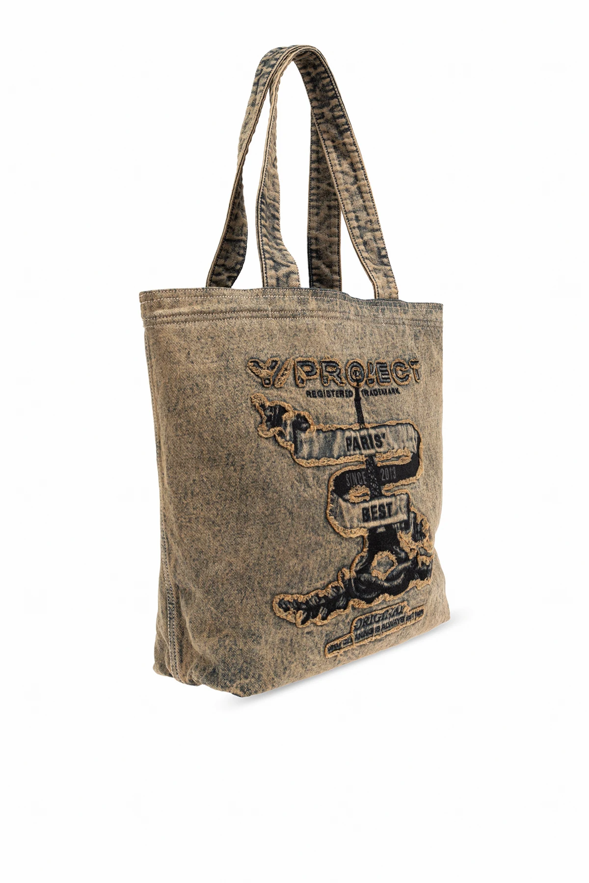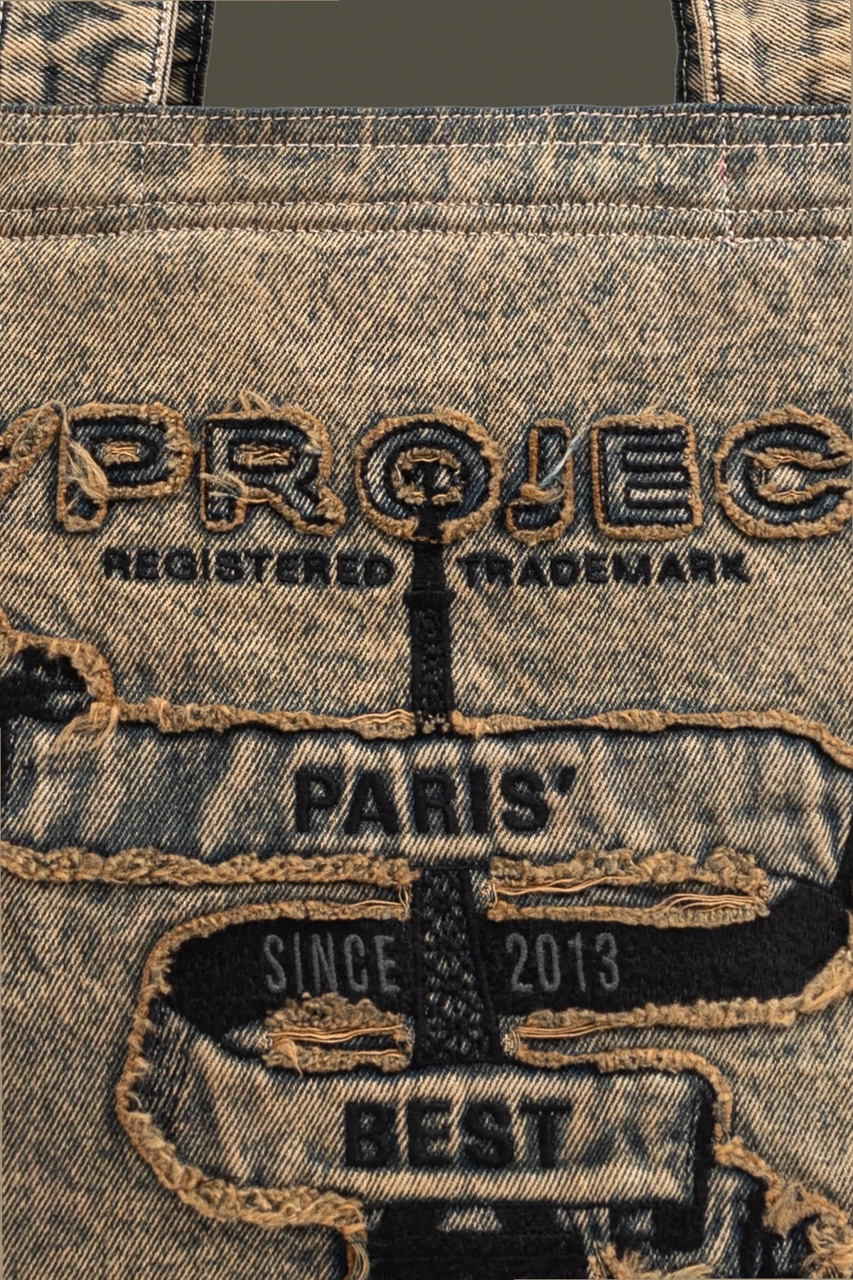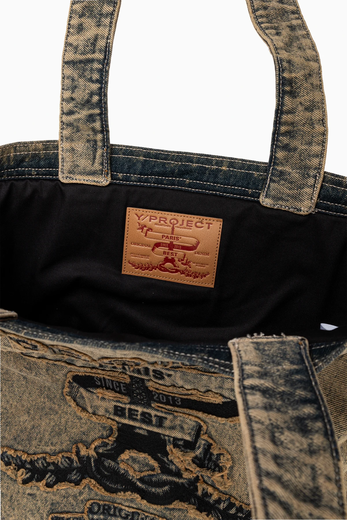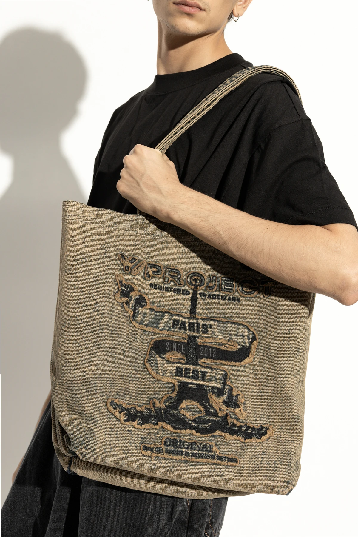 Introducing the Jeans Shopper Bag by the illustrious Y/PROJECT. This exquisite unisex accessory exudes an effortless elegance, blending practicality with distinctive design elements that make it a must-have for the discerning fashionista. Crafted from robust denim, the bag features a classic rectangular silhouette, enhanced by two sturdy handles for versatile carrying options. The front of the bag is adorned with prominent graphics, including the iconic Y/PROJECT logo, "REGISTERED TRADEMARK," "PARIS' BEST," "SINCE 2013," and "ORIGINAL," accompanied by a striking depiction of the Eiffel Tower – a nod to its Parisian roots. The meticulous stitching and high-quality finish speak to its durability and attention to detail. Inside, a leather label embossed with the Y/PROJECT logo accentuates its luxurious appeal. The bag's open-top design offers convenient access to a spacious interior lined with 100% polyester, making it an ideal companion for daily errands or spontaneous shopping sprees. Why Choose This Product? Unisex design suitable for all. Durable denim material for everyday use. Stylish Parisian-themed graphics. Spacious interior for versatile utility. High-quality craftsmanship with attention to detail.