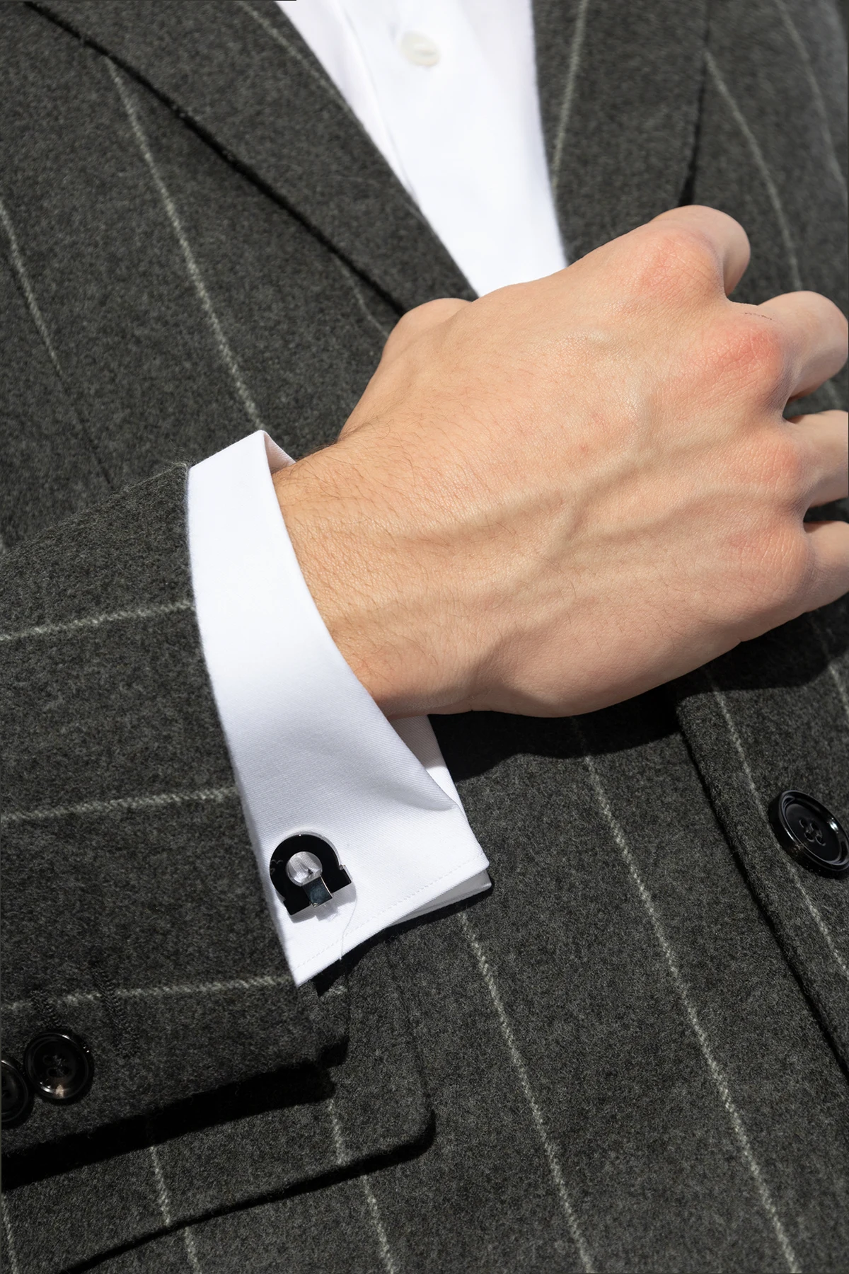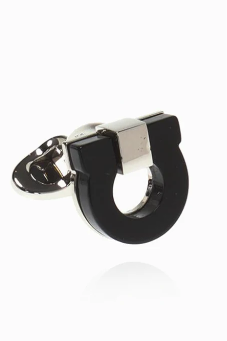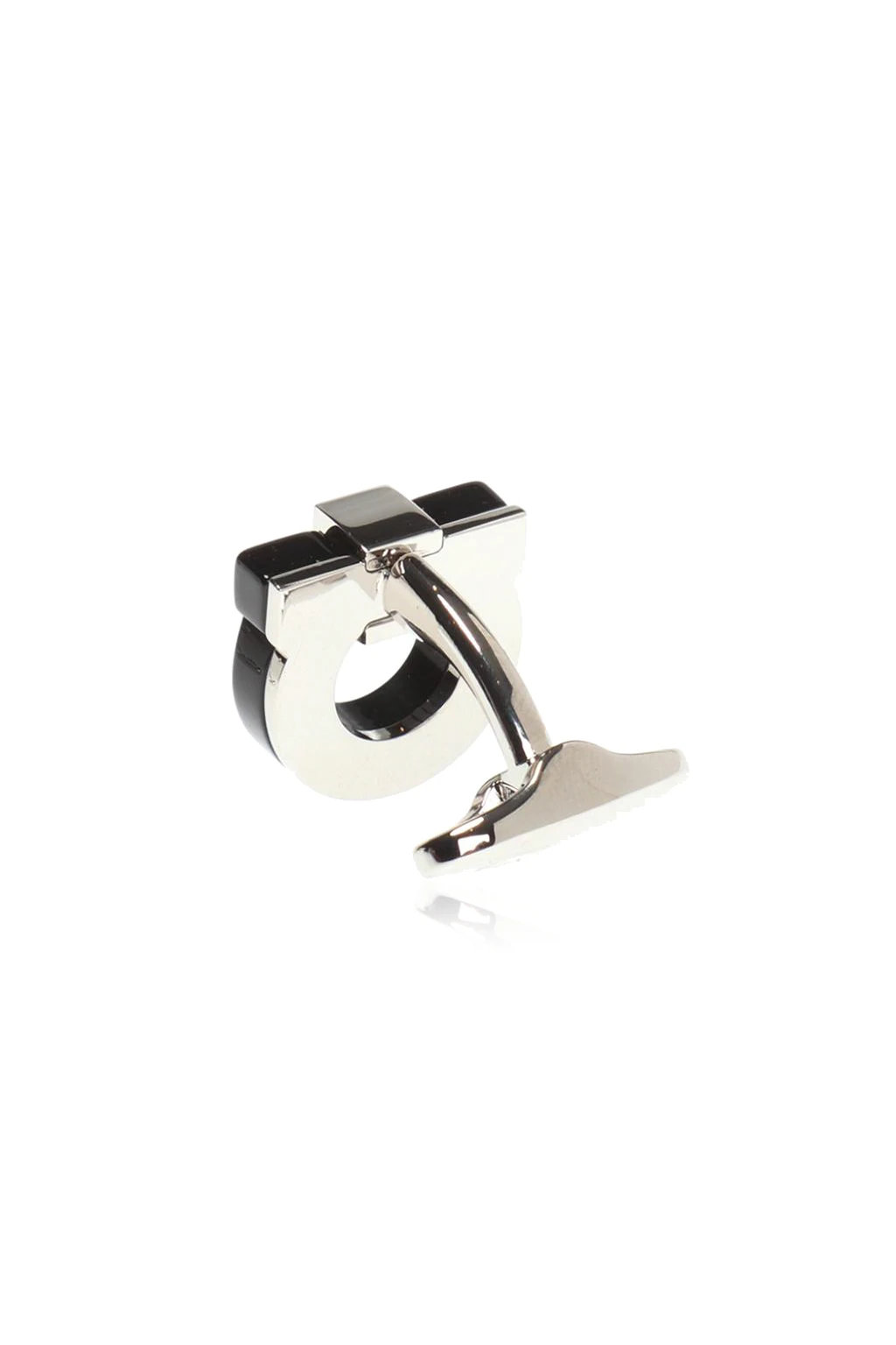 Brass cufflinks from FERRAGAMO. Decorated with a black stone featuring a logo.