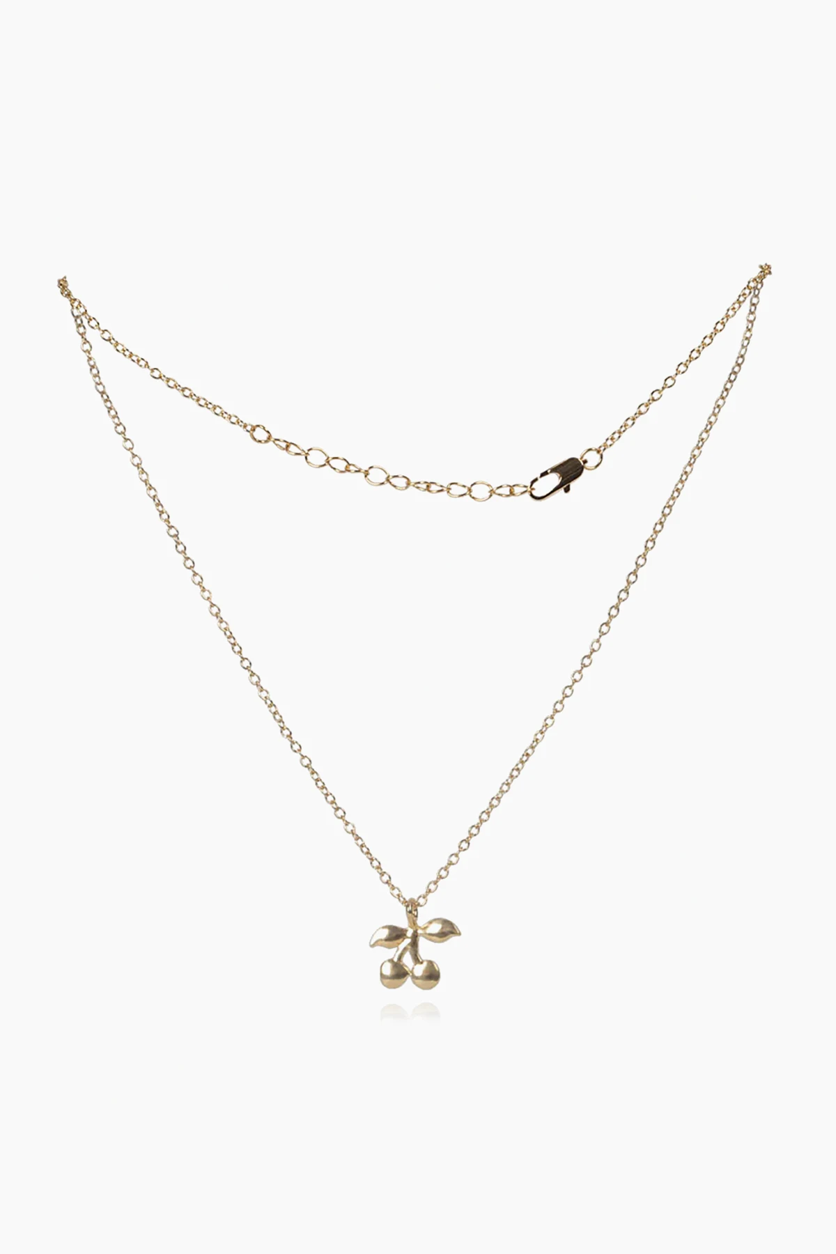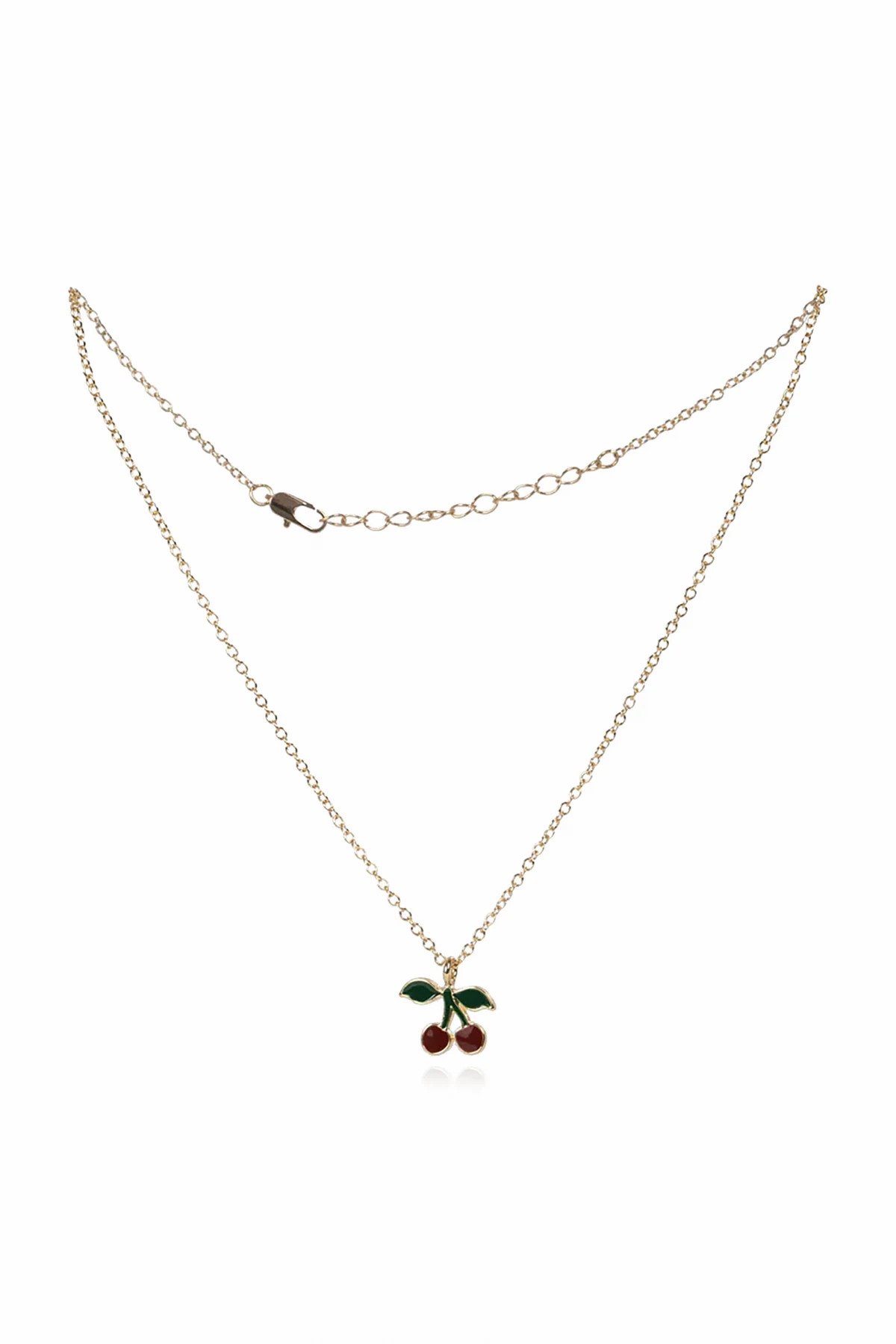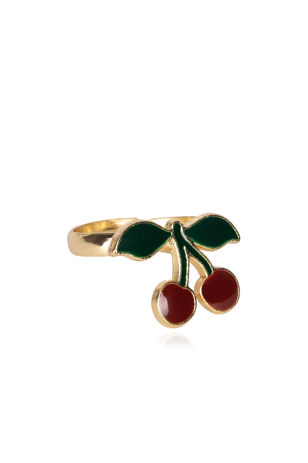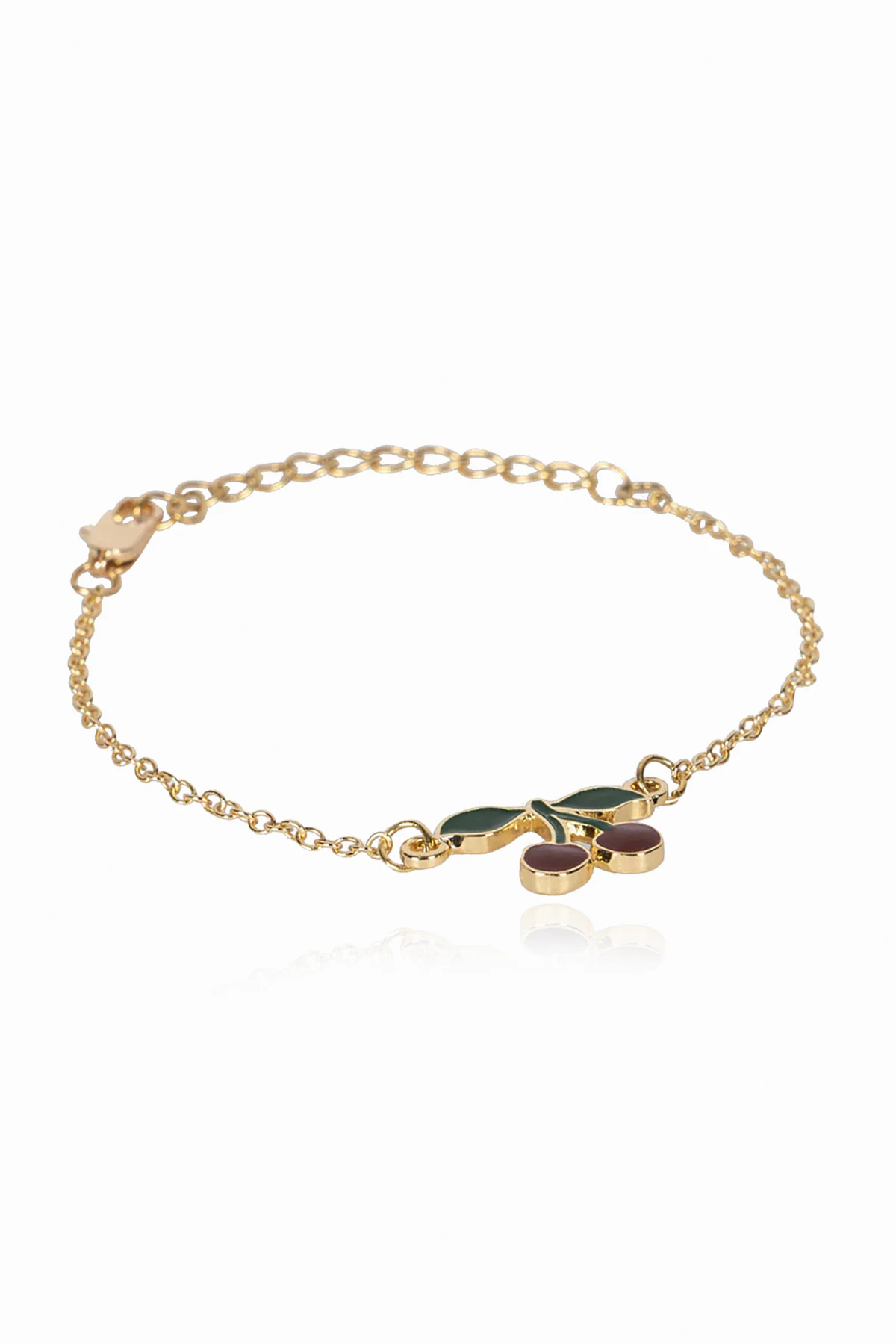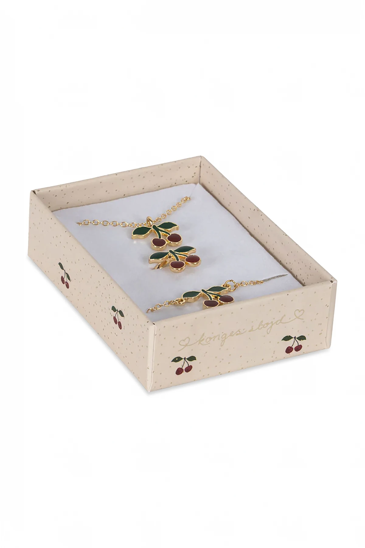 Introducing the Cherry Blossom Jewelry Set by the esteemed Danish brand, Konges Sløjd. This exquisite collection features a ring, bracelet, and necklace, each adorned with the enchanting motif of cherries, exuding an aura of elegance and whimsy. The ring is graced with two red cherries and delicate green leaves, a testament to the brand's commitment to intricate design. The bracelet showcases a similar cherry charm, elegantly suspended from a thin chain with a secure clasp. Completing the trio, the necklace presents a cherry pendant on a dainty chain, adding a touch of subtle sophistication. Crafted from zinc and bathed in golden hues with vibrant red and green accents, this jewelry set is a celebration of nature's beauty. Presented in an elegant box adorned with cherry motifs, it is as delightful to behold as it is to wear. Why Choose This Product? Charming cherry motif across each piece. High-quality zinc construction for durability. Designed by the renowned Konges Sløjd. Elegant packaging, perfect for gifting.