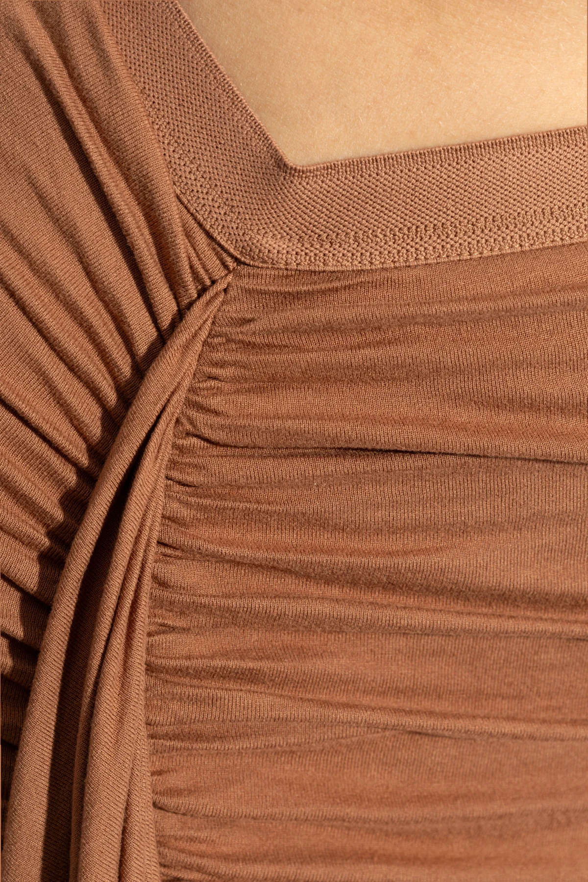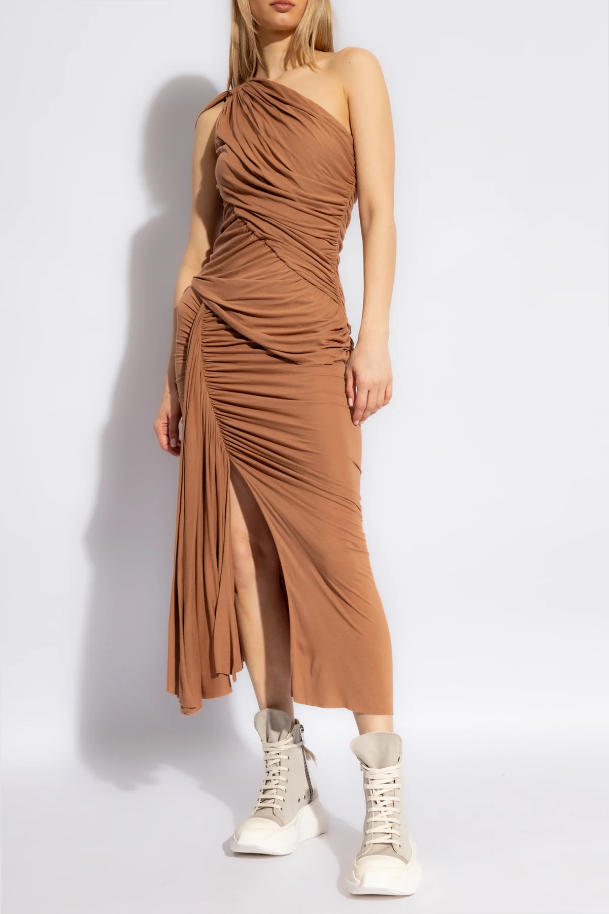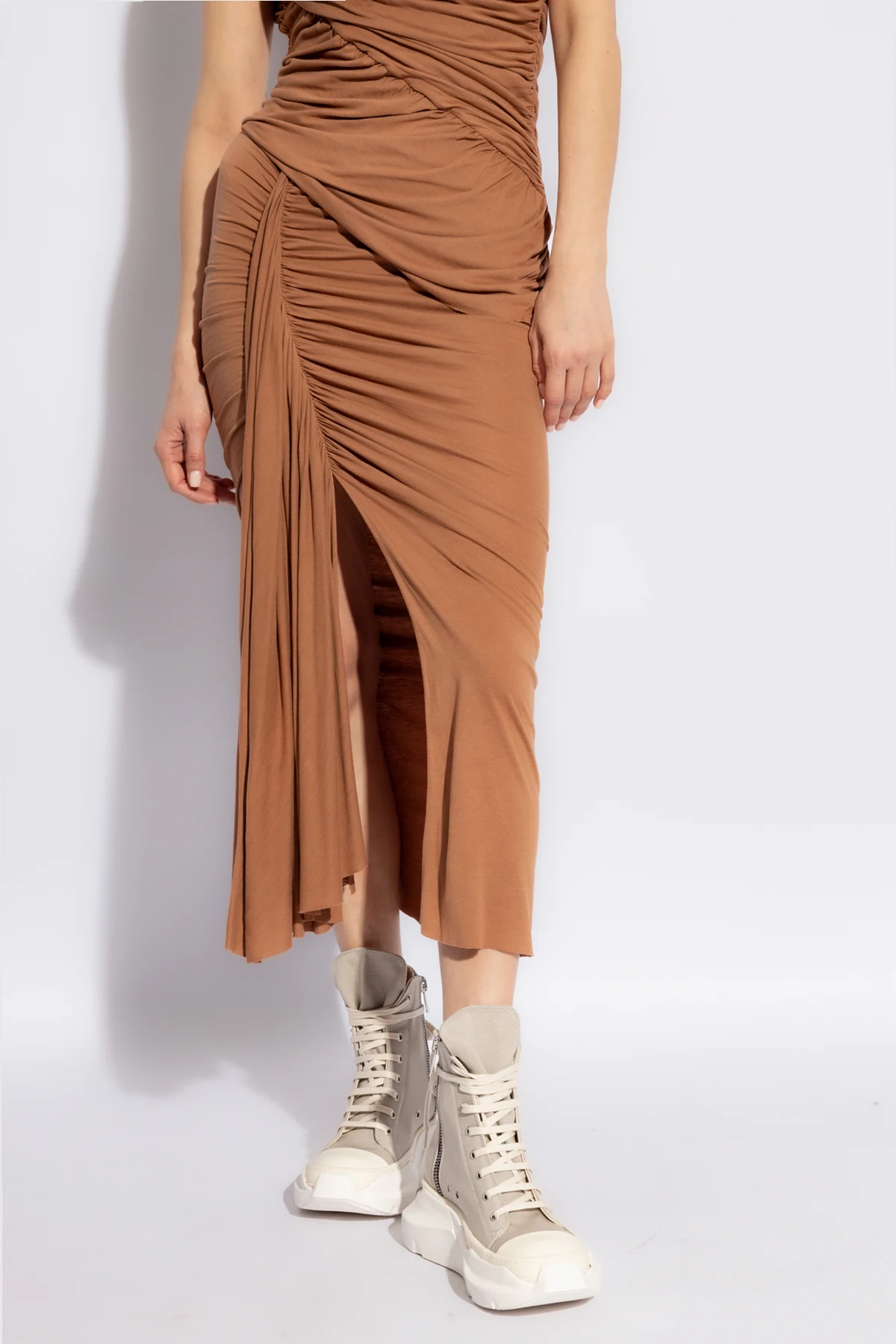 Introducing the 'Fog' Skirt from the exclusive collection by Rick Owens Lilies, a garment that epitomizes the essence of avant-garde elegance. Crafted from 100% viscose, this piece offers a harmonious blend of softness and flexibility, ensuring a flattering fit that accentuates the natural contours of your body. The 'Fog' skirt is distinguished by its asymmetrical cut and dynamic, concentrated ruching on one side, creating an irregular, rippling hem that exudes modernity and uniqueness. Its smooth texture, subtly striped with a delicate sheen, accentuates the high-quality material, while the absence of visible branding maintains its sleek and sophisticated aura. The incorporation of an elastic waistband and decorative draping at the front, along with a raw finish, further refine its contemporary appeal. Rendered in a rich brown hue, this skirt stands as a testament to Rick Owens Lilies' commitment to creating pieces that are both innovative and timeless. Why Purchase This Product? Exquisite material blend for ultimate comfort and fit. Unique asymmetrical design and ruching detail for a modern look. Elegant and versatile brown color, perfect for various occasions. High-quality craftsmanship from renowned designer Rick Owens Lilies.