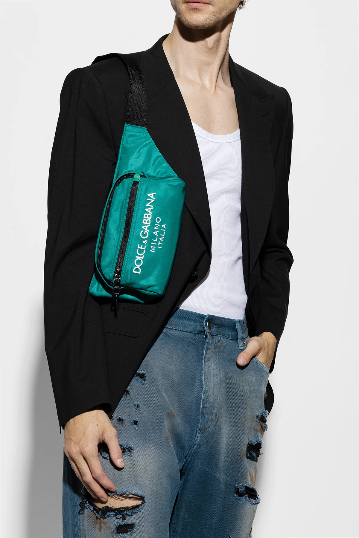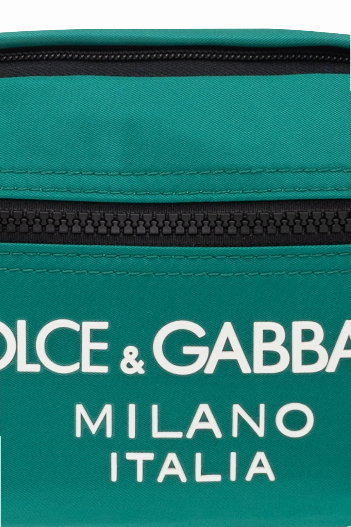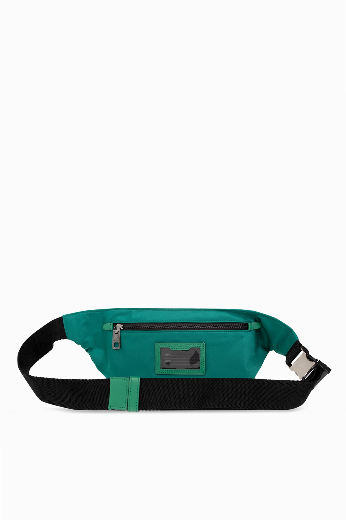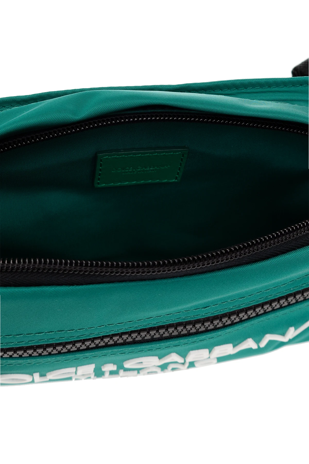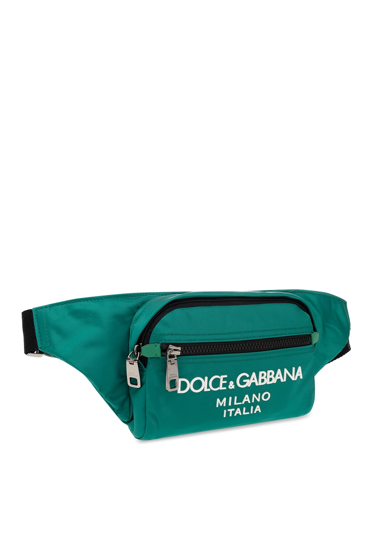 Green and black belt bag from Dolce & Gabbana. Crafted from fabric, this design secures with a zip and showcases a white rubber logo accompanied at front with a zip pocket, one zip pocket and ID slot at the back and one internal compartment with a slip pocket.