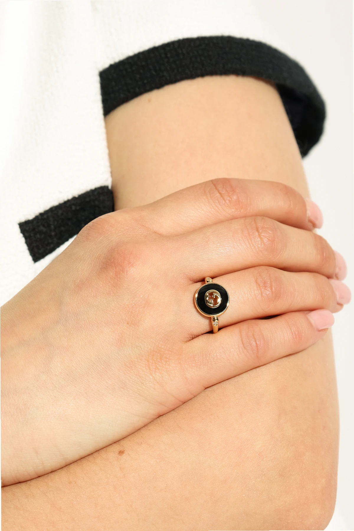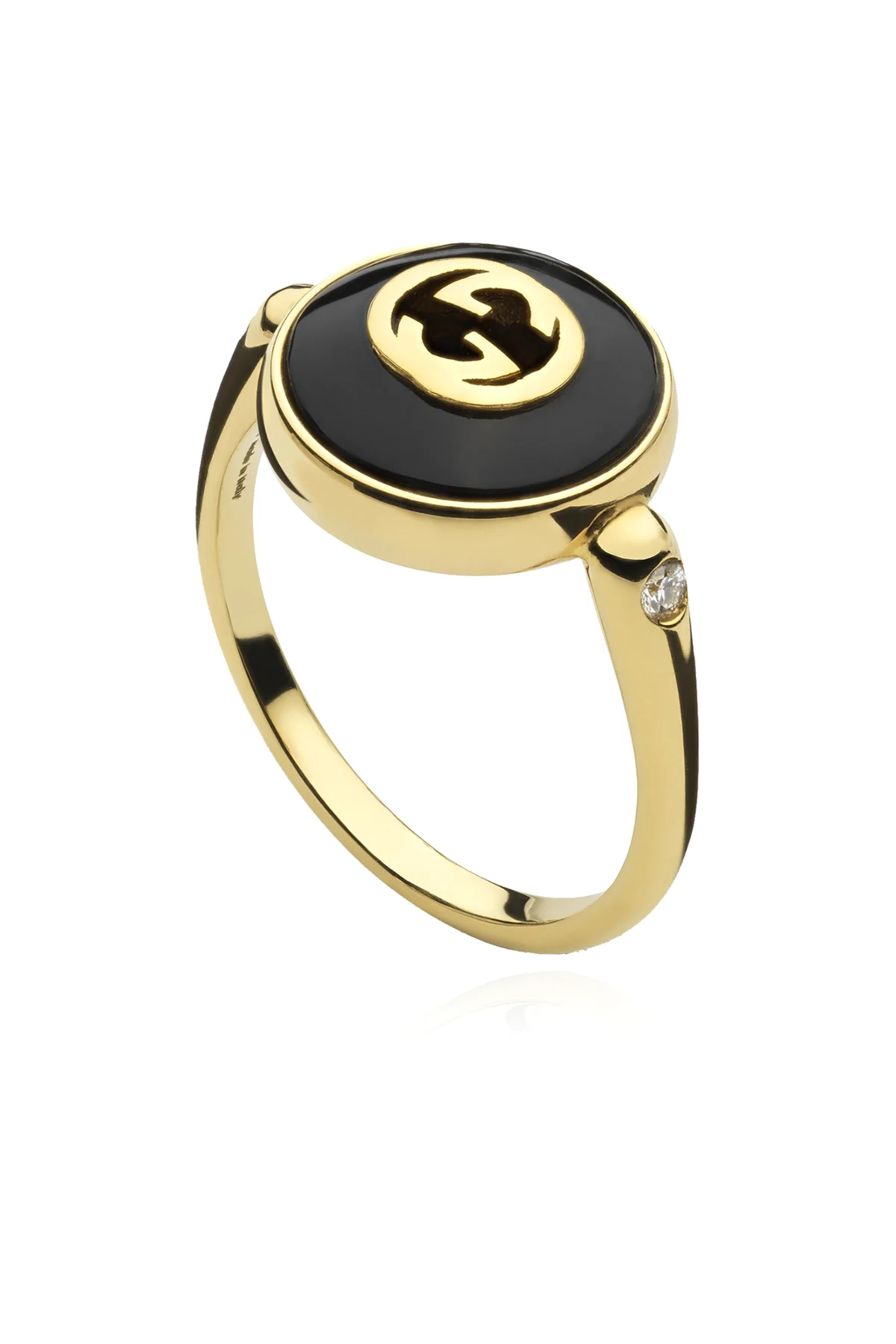 Introducing the Gucci Golden Ring, a masterclass in luxury and sophistication. Crafted from 18kt rose gold, this exquisite piece melds impeccable craftsmanship with avant-garde design. Its slender, smooth band gracefully transitions into dual convex lines that frame the central disk, showcasing Gucci's iconic, intertwined logo in a striking green enamel finish. The ring's elegance is further accentuated by a single, meticulously set diamond, adding a touch of opulence to its side. This detail not only enhances the ring's luxurious appeal but also subtly complements the emblematic green and gold color scheme, creating a harmonious contrast that is both eye-catching and timeless. Designed as a non-adjustable, closed-circle band, the Gucci Golden Ring promises a comfortable fit, ensuring that it sits perfectly on the finger without being overly imposing. This feature speaks volumes about its thoughtful design, aimed at providing an effortless wearability that matches its aesthetic allure. Why Purchase This Product? Made from premium 18kt rose gold for enduring beauty and value. Features a striking green enamel with Gucci's signature intertwined logo, offering a unique aesthetic. Enhanced with a sparkling diamond, adding an element of luxury. Comfortable, non-adjustable fit designed for everyday elegance. A harmonious blend of color and texture, perfect for those who appreciate fine jewelry with a distinctive character.