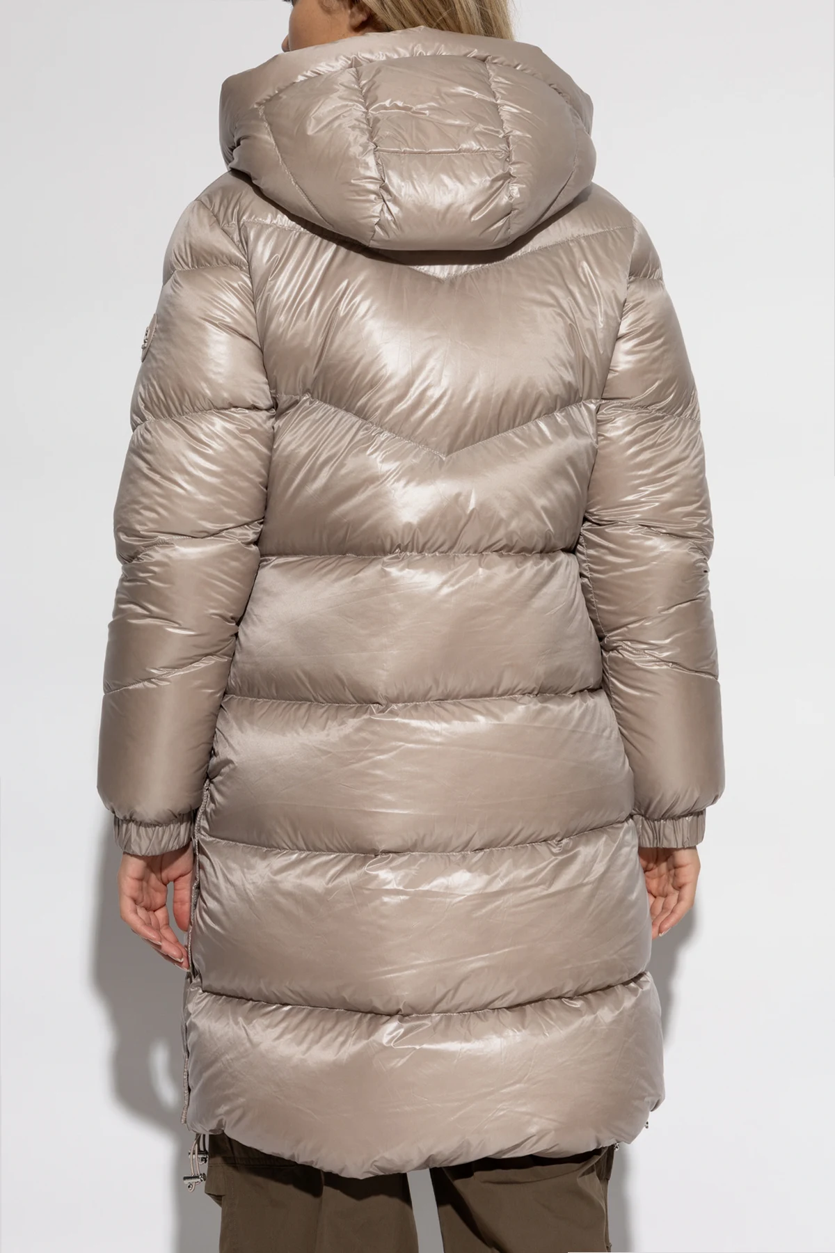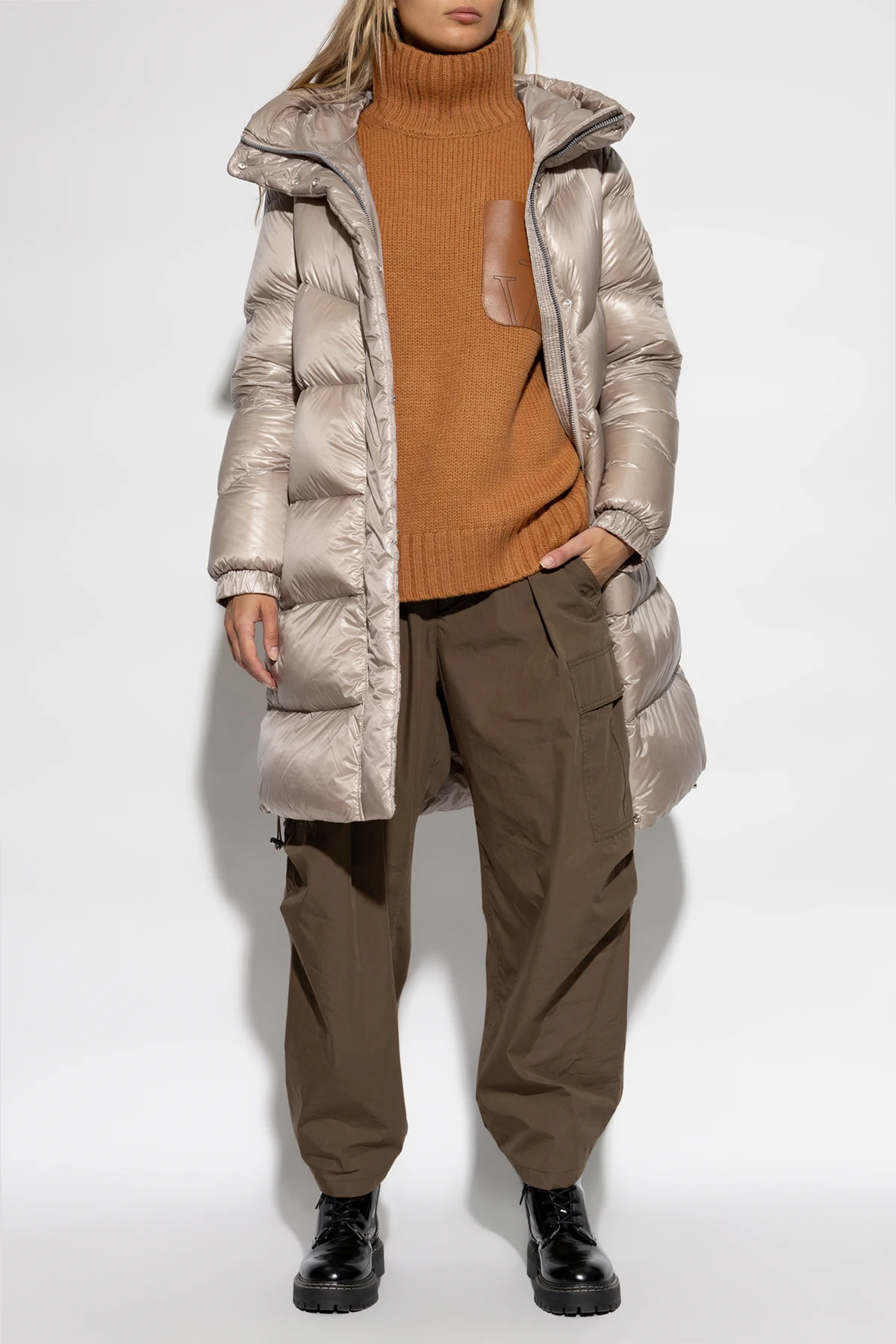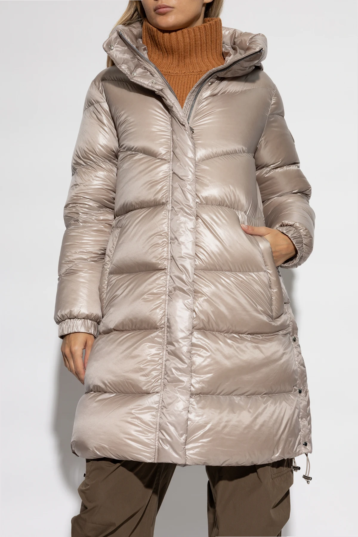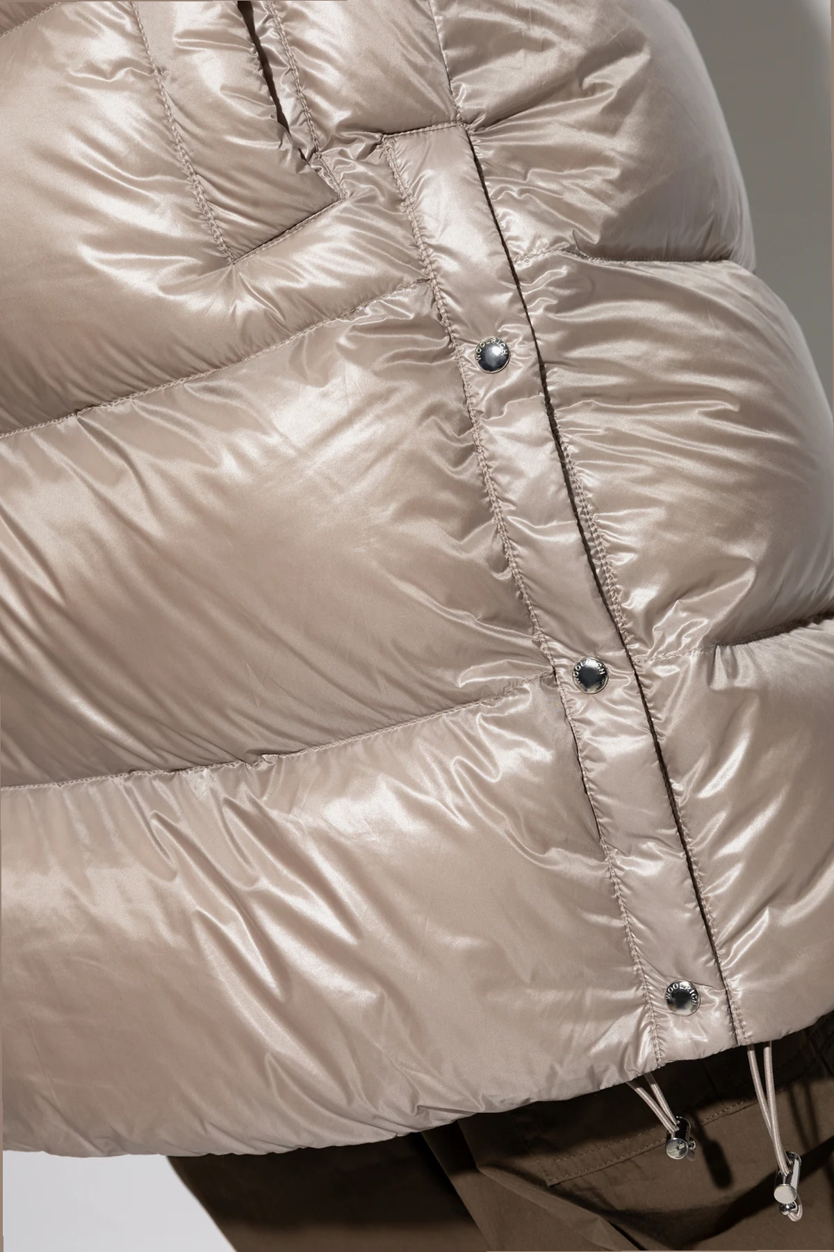 Introducing the Luxury Down Jacket with Hood by Woolrich, an epitome of winter elegance and supreme functionality. This long, knee-length jacket features a straightforward yet slightly tailored silhouette, ensuring a flattering fit. Crafted from glossy, waterproof fabric in a distinguished light beige hue, the jacket boasts quilted, horizontal stitching that forms wide, down-filled panels. The large, insulated hood offers additional warmth, providing comprehensive protection against the cold. Detailed with a concealed zipper beneath a protective placket, this jacket also includes two hip-level pockets secured with snap buttons. The sleeves end with elastic cuffs, enhancing insulation, while adjustable drawstrings at the bottom allow for a customizable fit. Furthermore, metal snaps on the side panels can be used for ventilation or to adjust the jacket's width. Inside, the jacket features a premium composition of 90% down and 10% feathers, ensuring unparalleled warmth and comfort. The exterior and interior are both composed of 100% polyamide, a testament to its durable and high-quality construction. Why Choose This Product? Superior Warmth - High-quality down filling offers exceptional insulation. Elegant Design - Glossy, waterproof fabric in a chic light beige color. Functional Details - Concealed zipper, snap-button pockets, and adjustable features for comfort and versatility. Renowned Brand - Woolrich is synonymous with luxury and meticulous craftsmanship.