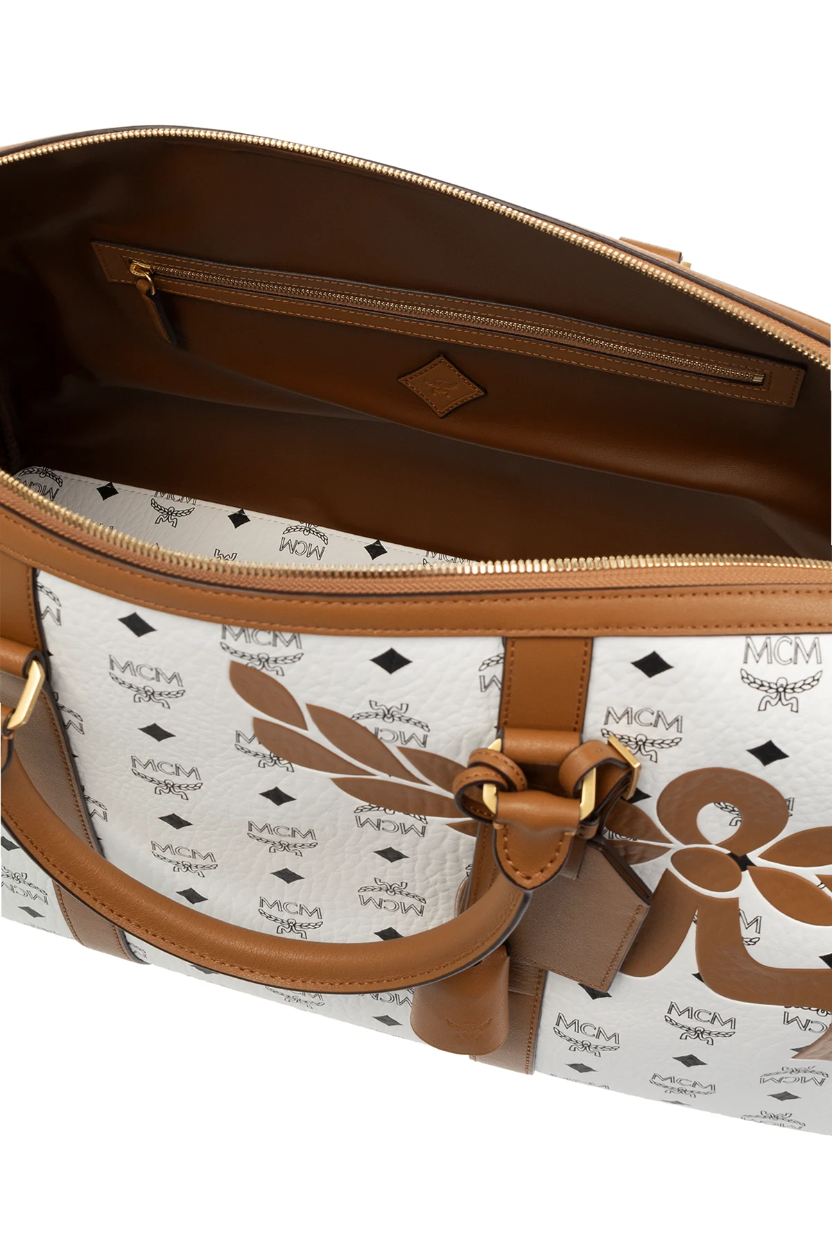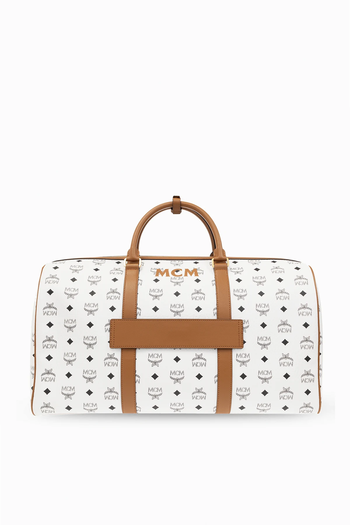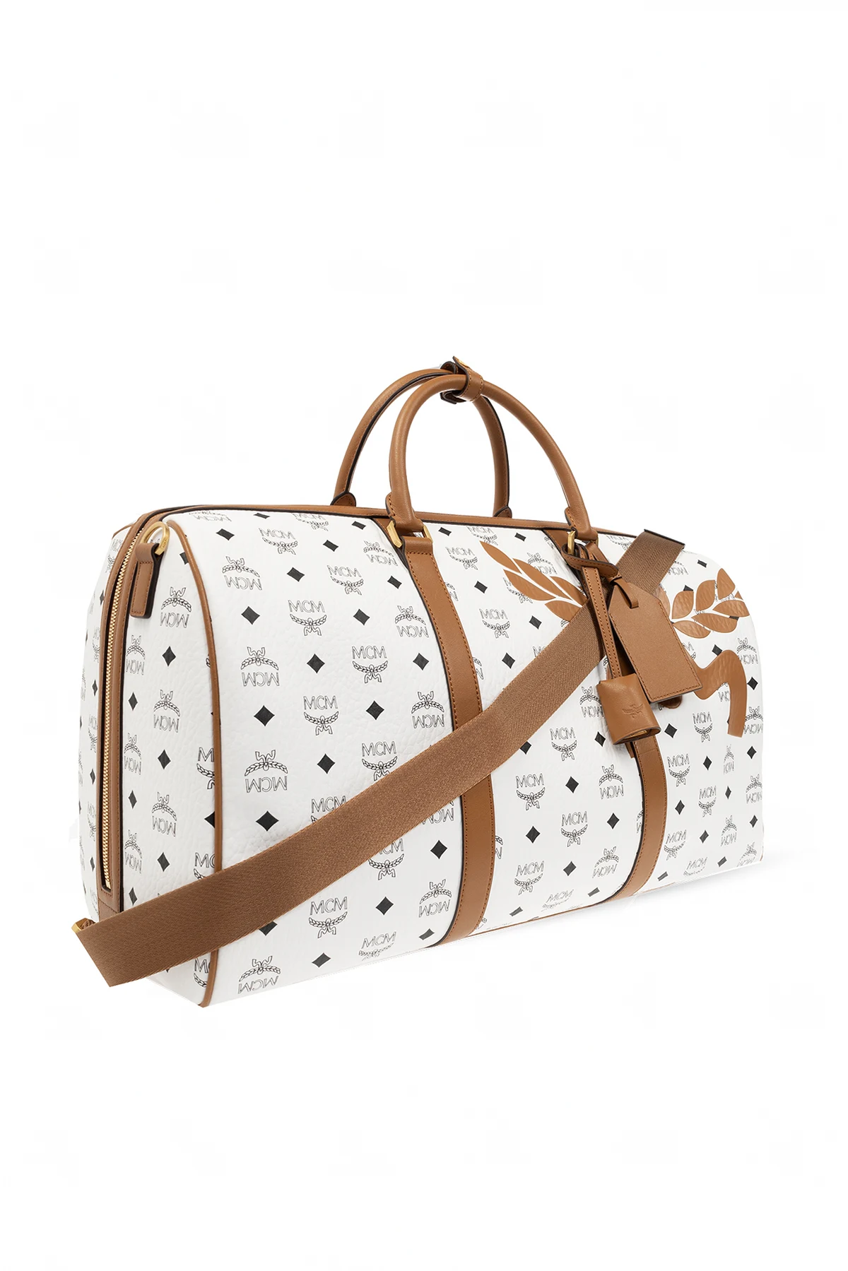 White and brown ‘Ottomar’ travel bag from MCM. Made of coated canvas with a black Visetos monogram and leather trims, this model fastens with a two-way zip and is decorated with a logo print. It is complete with a handle at the back, ID tag, padlock with keys, two half-round handles with a snap fastening, detachable and adjustable shoulder strap, metal hardware plated with 24k gold and one internal compartment with two slip pockets and one zip pocket.
