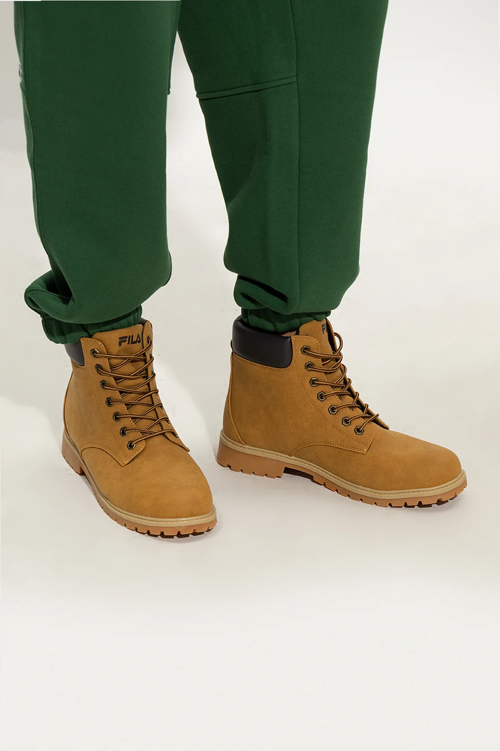 Brown ‘Maverick’ boots from Fila. Crafted from faux suede and faux leather, this lace-up model sits on a beige rubber sole and showcases an embroidered logo.