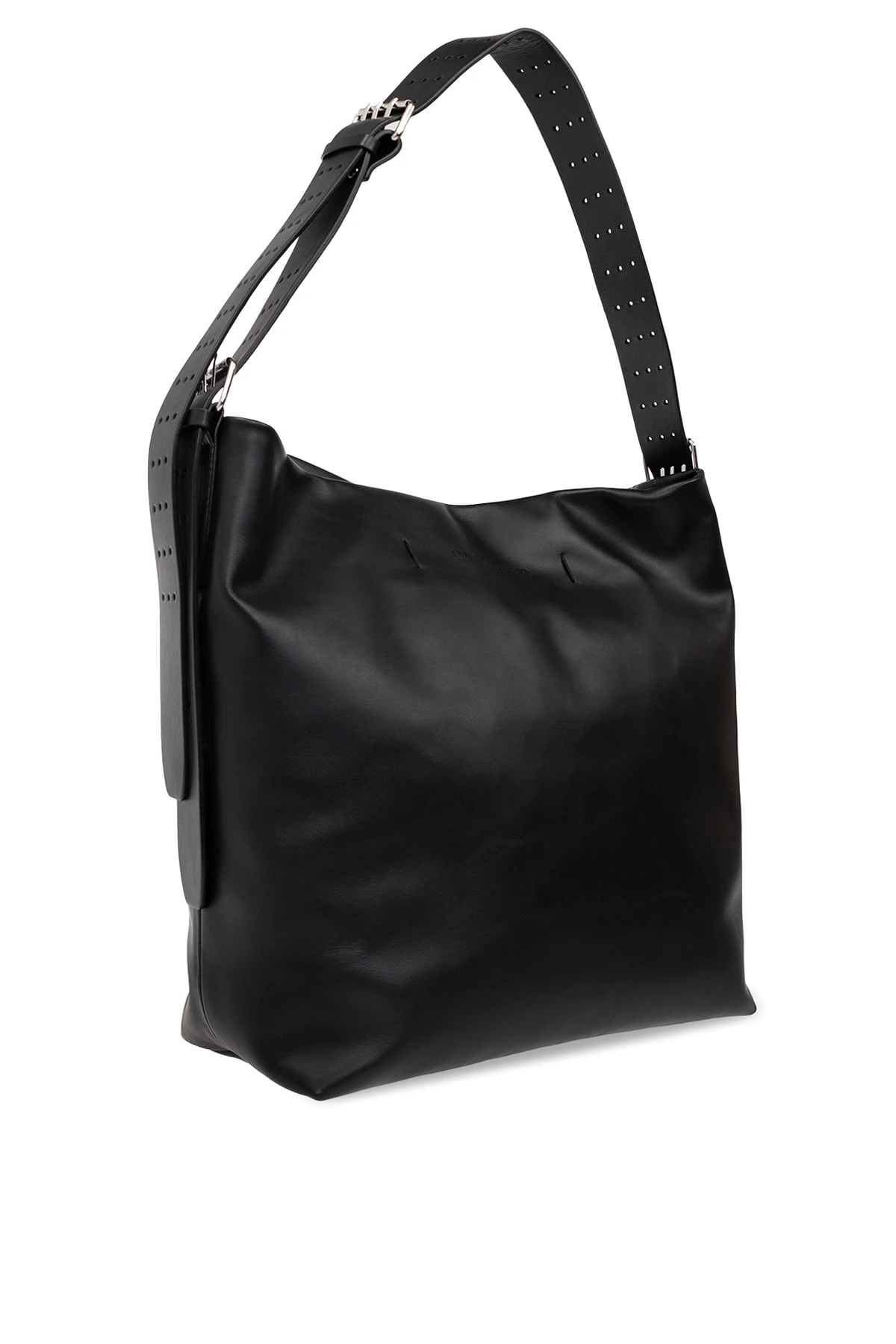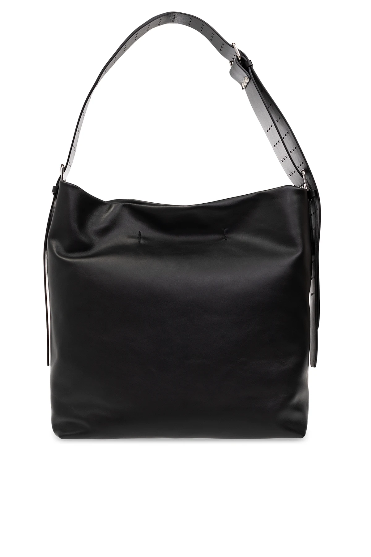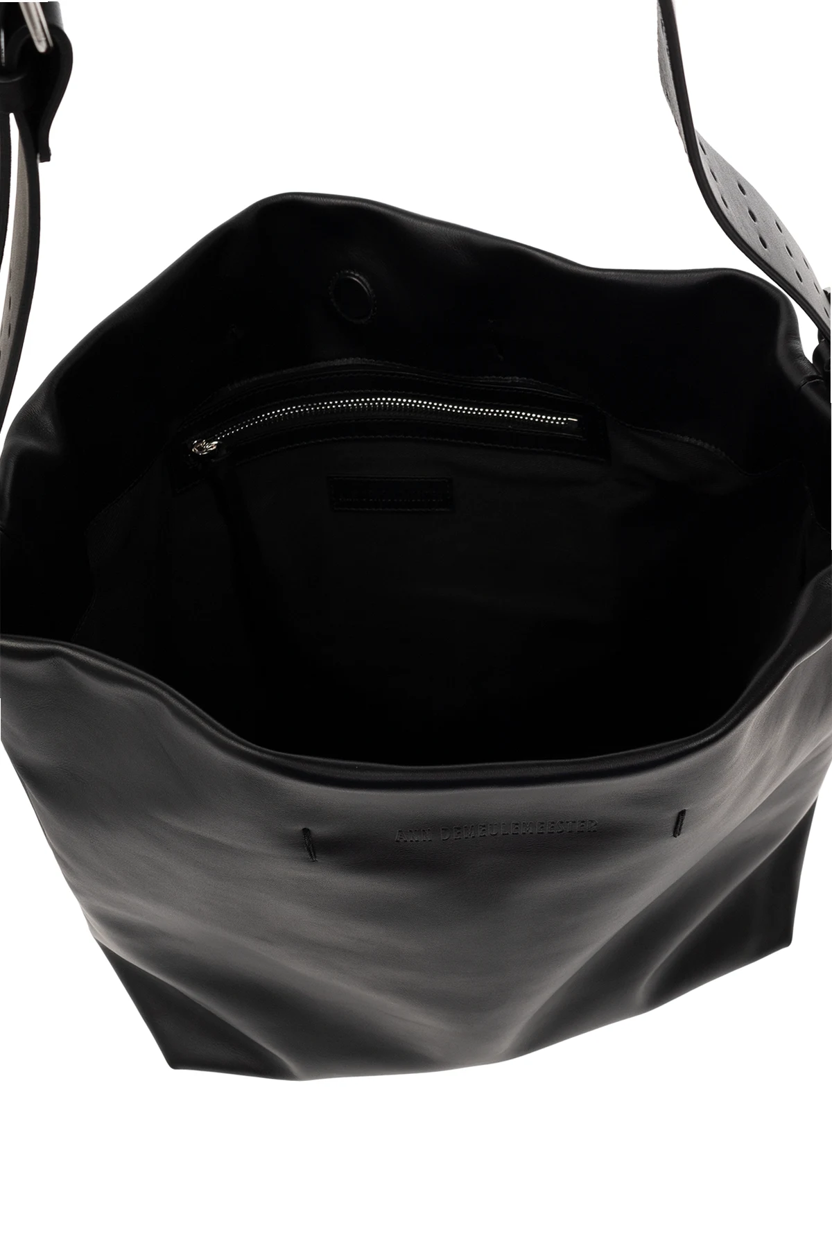 Black shopper bag from Ann Demeulemeester. Made of calf leather, this design features a magnetic snap closure, embossed logo, adjustable shoulder strap, silver-tone metal hardware and one internal compartment with one zip pocket.