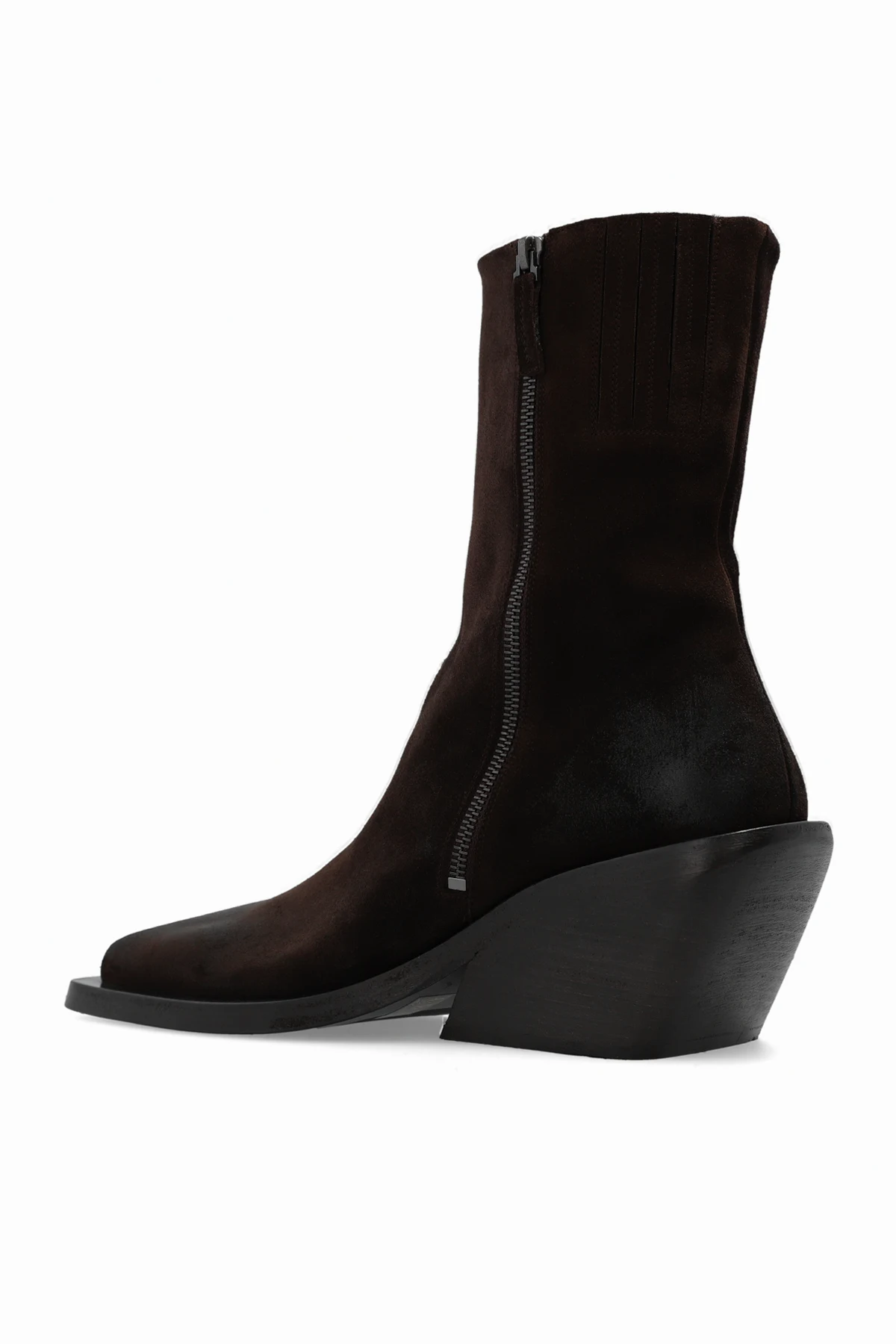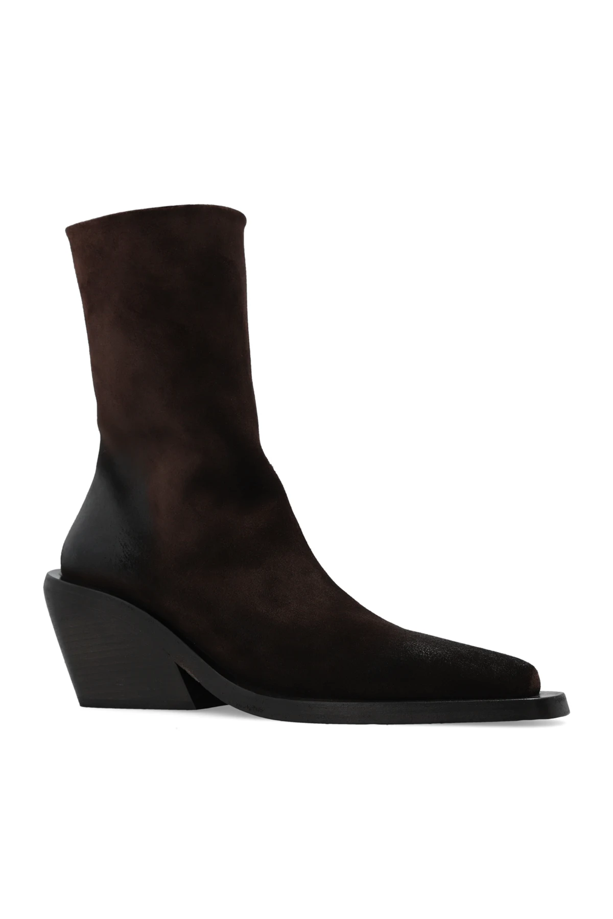 Dark brown ‘Gessetto’ heeled ankle boots from Marsell. Made of suede with a pointed toe silhouette, this model sits on a black leather sole and features a side zipper.