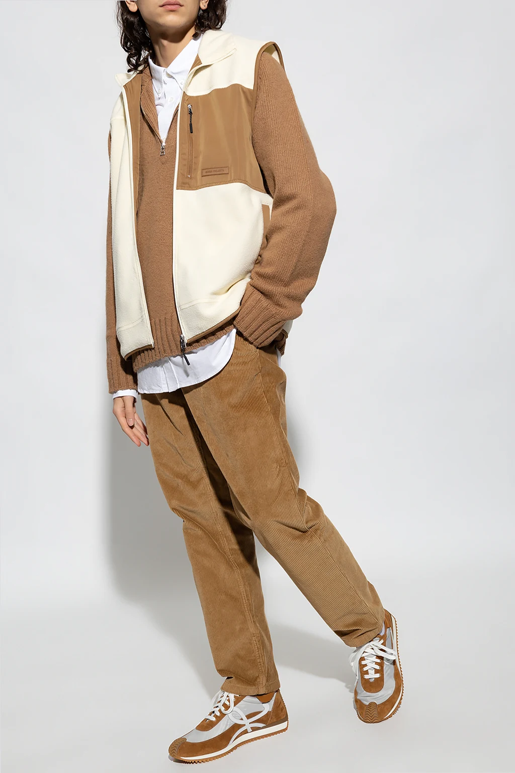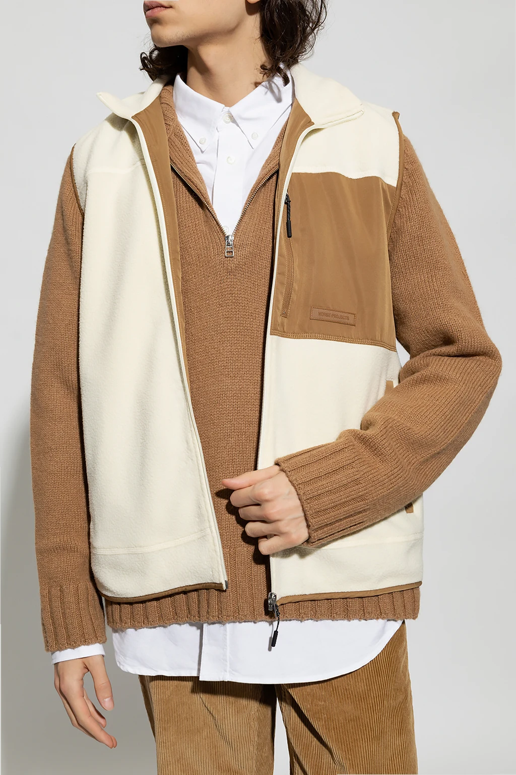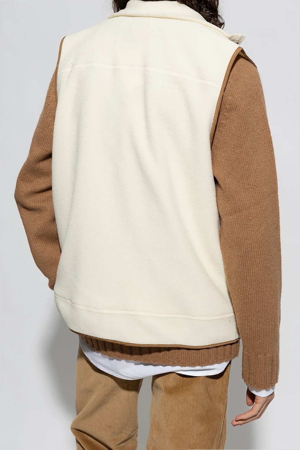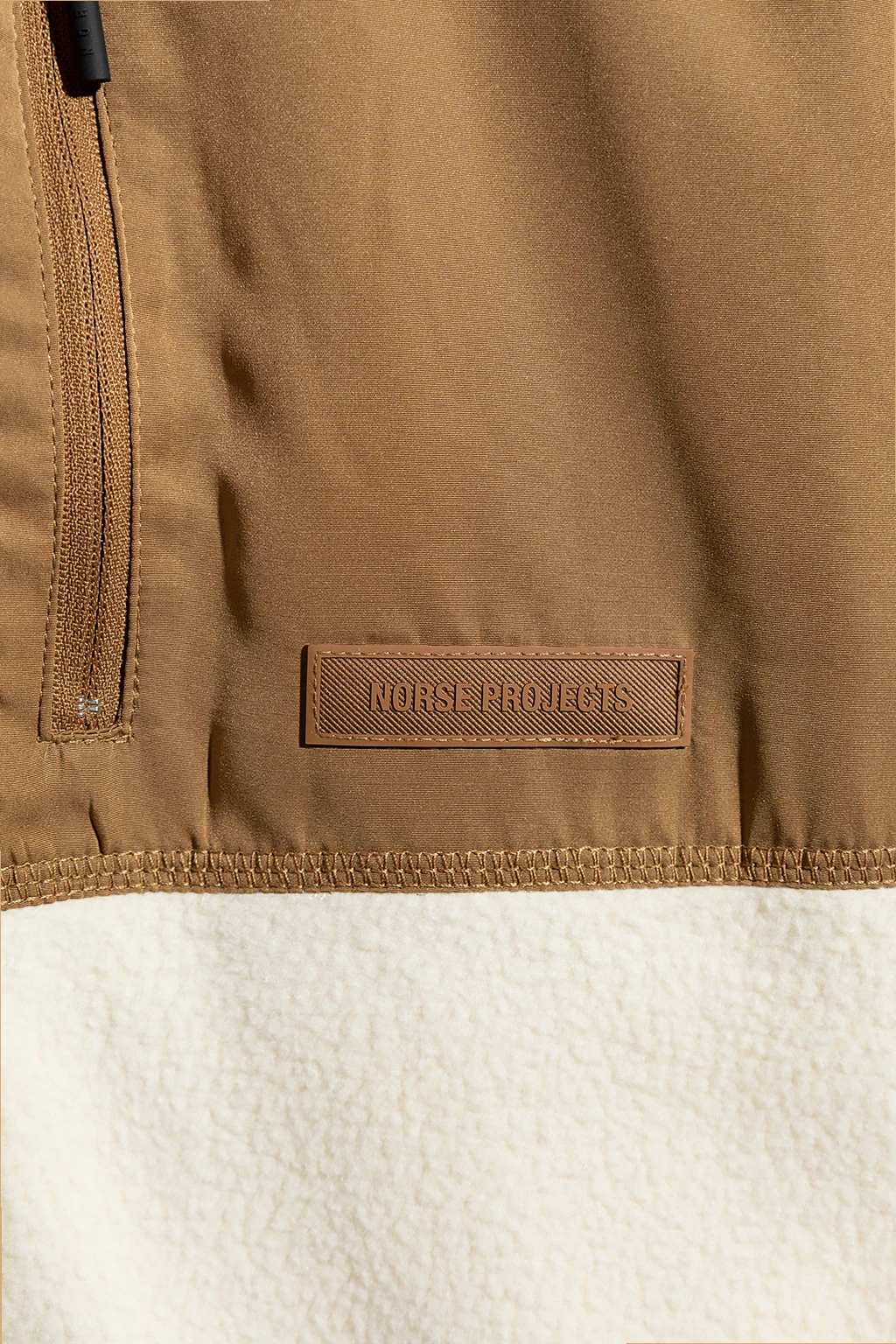 Cream and brown 'Frederik’ fleece vest from Norse Projects. Crafted using an insulating fleece Polartec® Thermal Pro®, this style features a standing collar, a zip fastening, a logo patch, three frontal pockets – one with a zipper, and a mesh lining.
