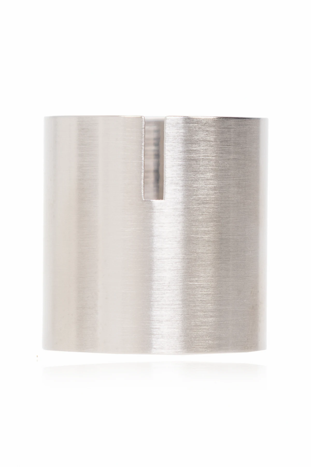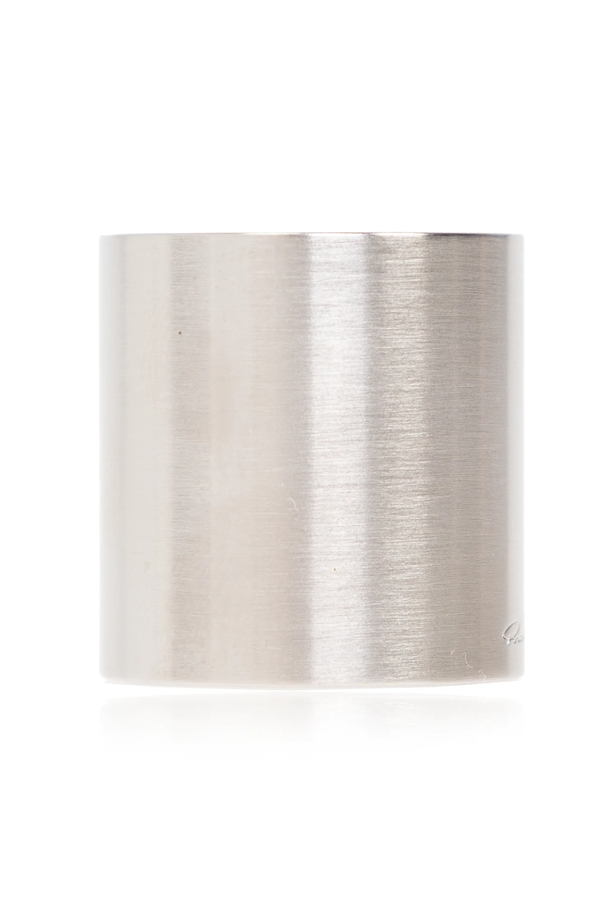 Silver-tone ring from Rick Owens. Made of brass, this item features an engraved logo and a cut-out.