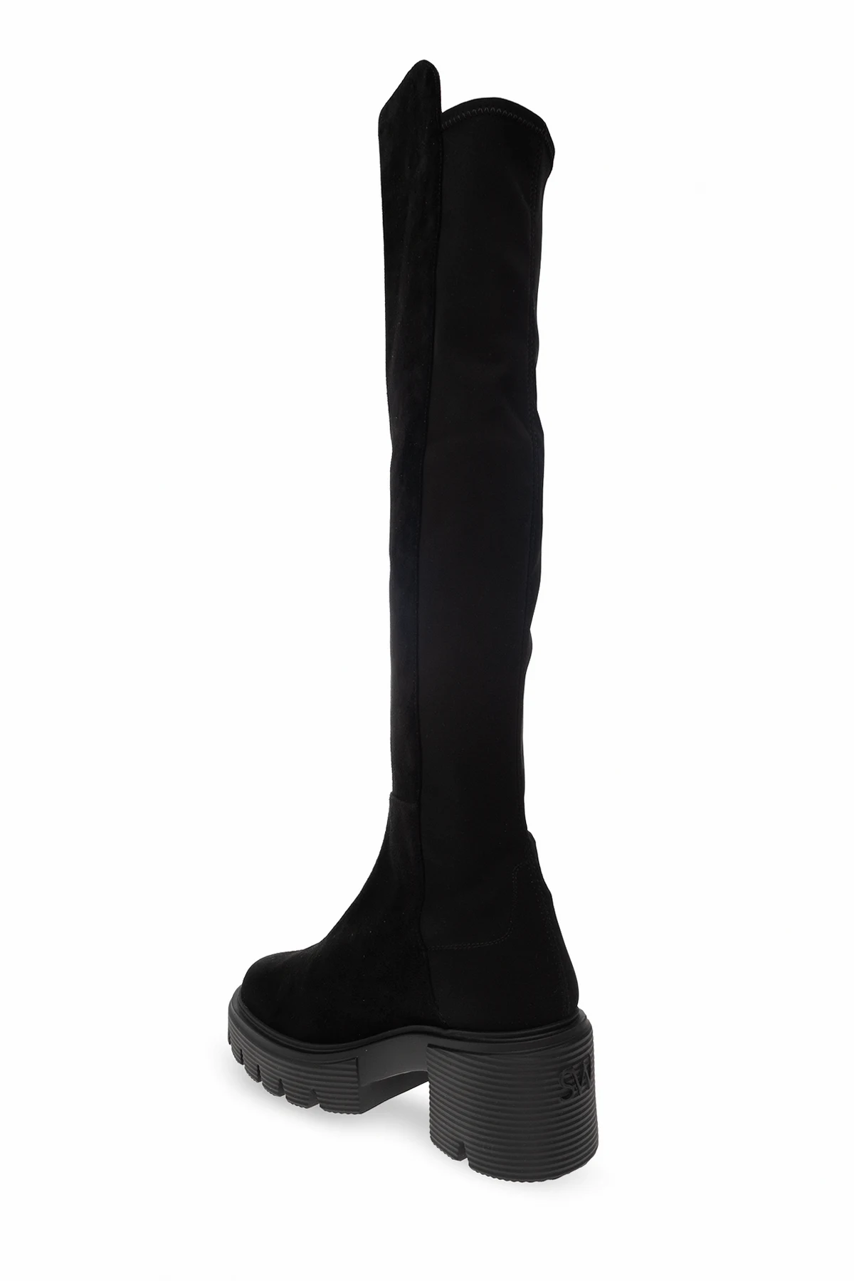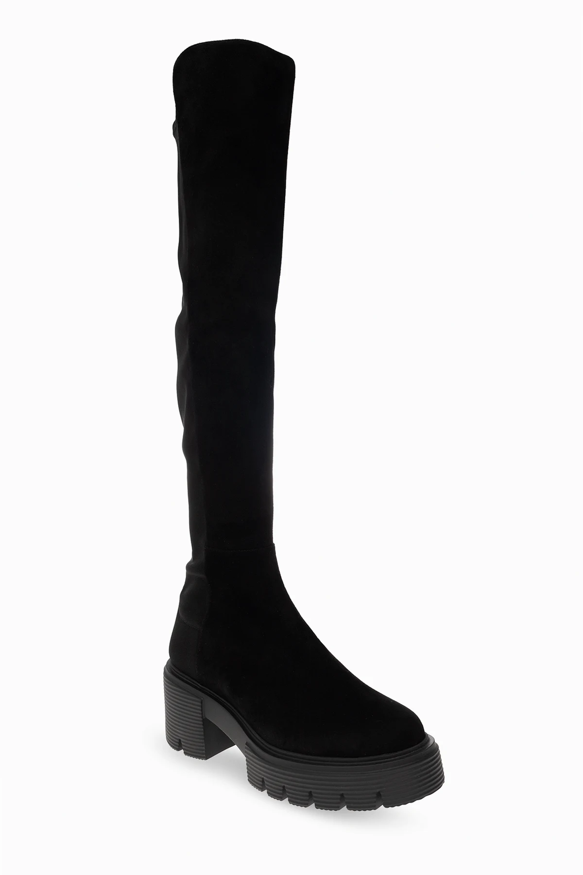 Black ‘5050’ over-the-knee boots from Stuart Weitzman. Made of suede with a slip-on silhouette, this model sits on a black rubber sole and features stretch detailing.