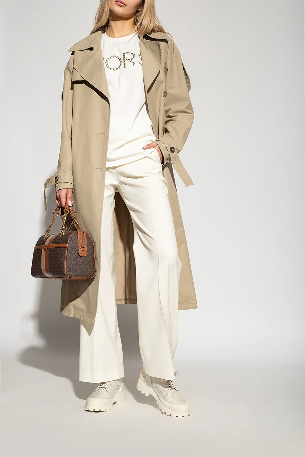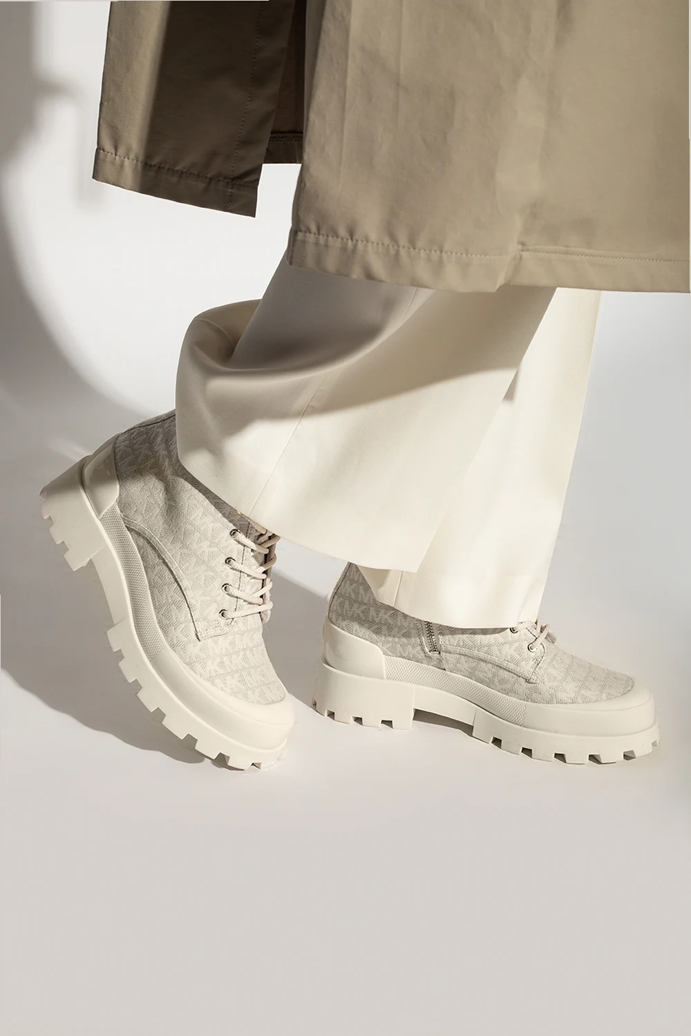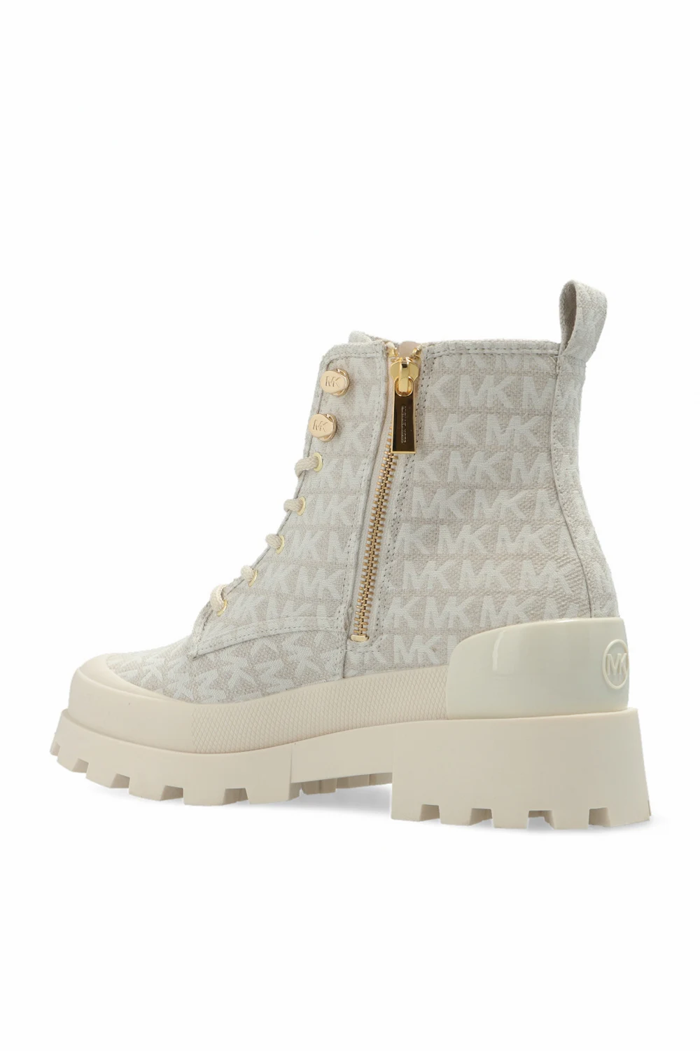 Cream ‘Payton’ combat boots from Michael Michael Kors. With an upper made of a cotton and linen blend, this lace-up model showcases a monogram pattern, rubber trims, a side zip closure, gold-tone metal hardware and a cream rubber sole.