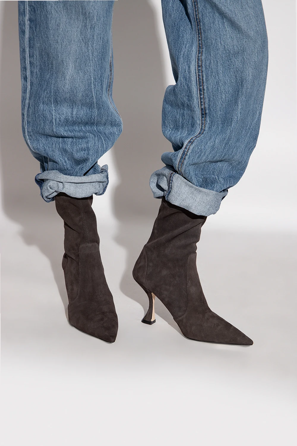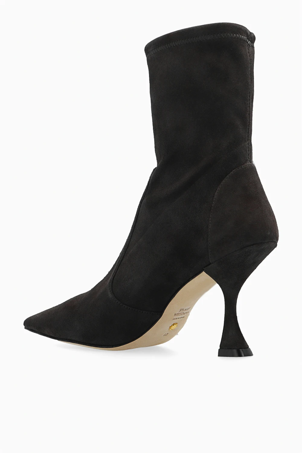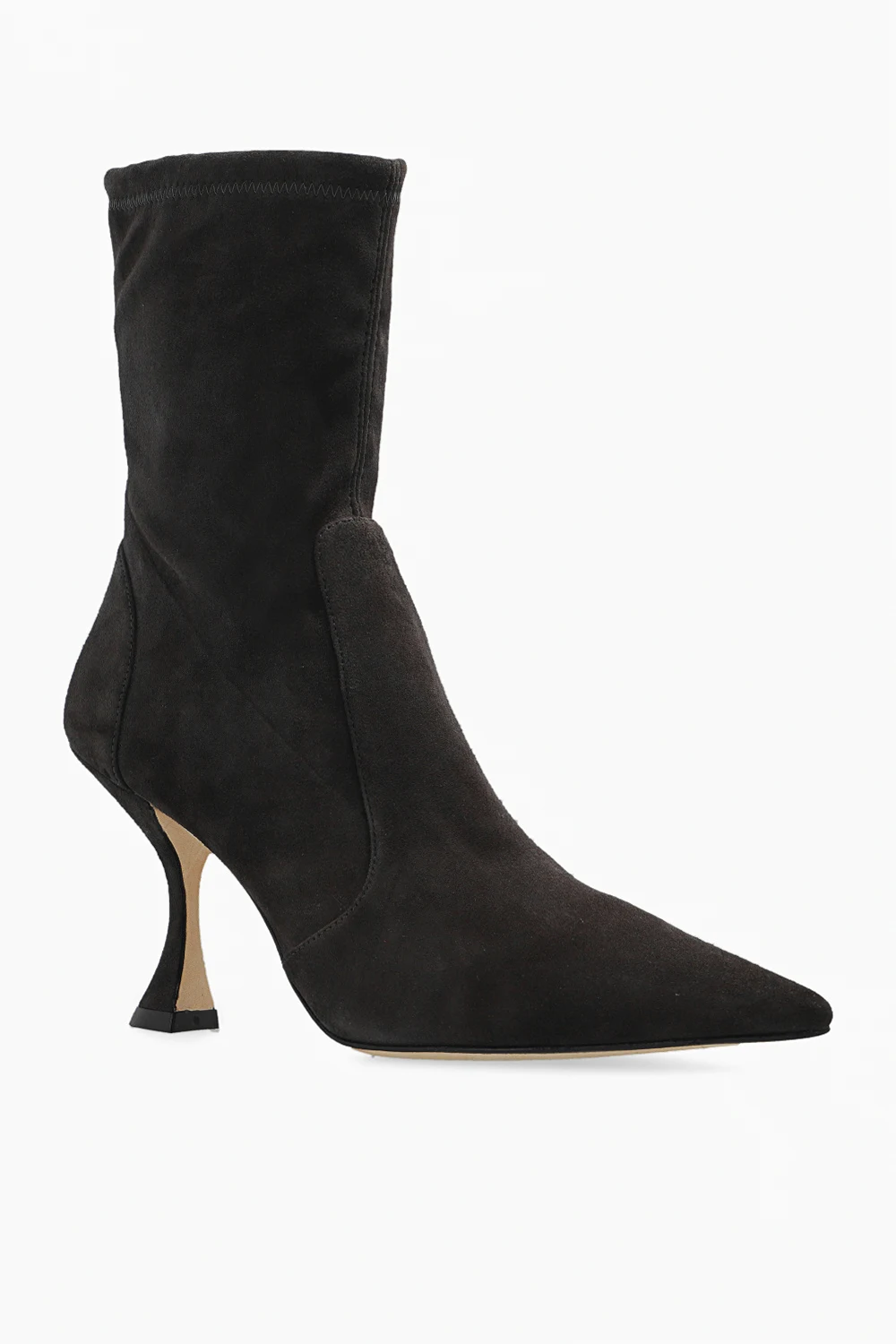 Dark brown ‘X Curve’ heeled ankle boots from Stuart Weitzman. Crafted from suede with a slip-on silhouette, this model features a distinctive heel and a cream leather sole.