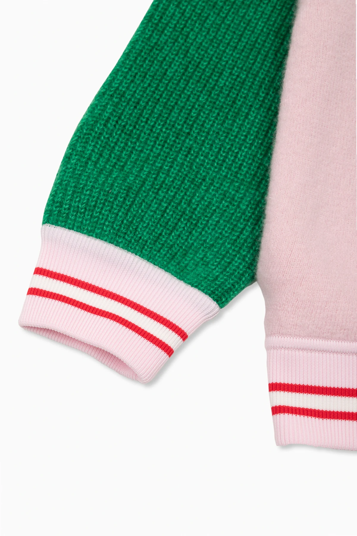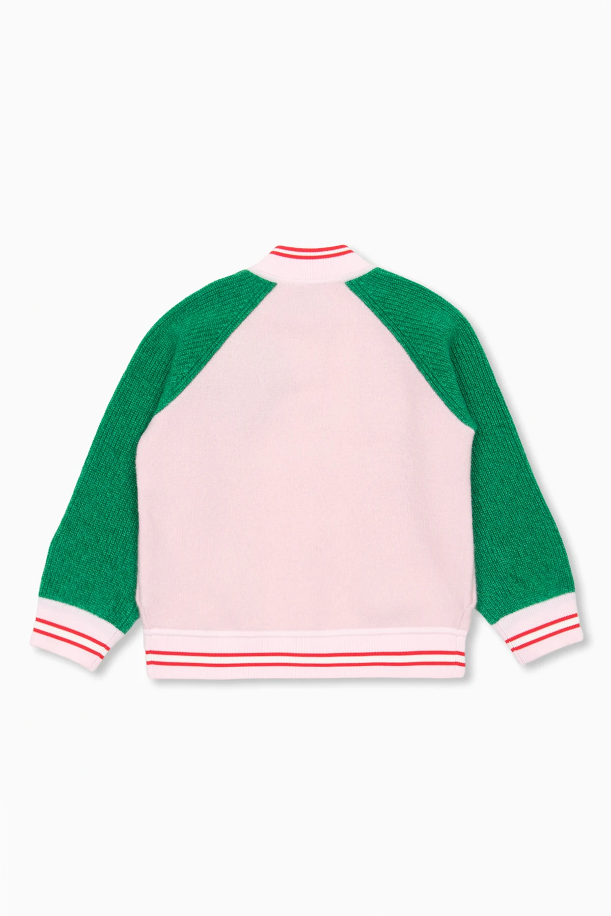 Pink and green jacket from Burberry Kids. Made of wool, this garment is complete with a snap closure, embroidered logo pattern, two slip pockets and ribbed trims at the stand collar, hem and cuffs.