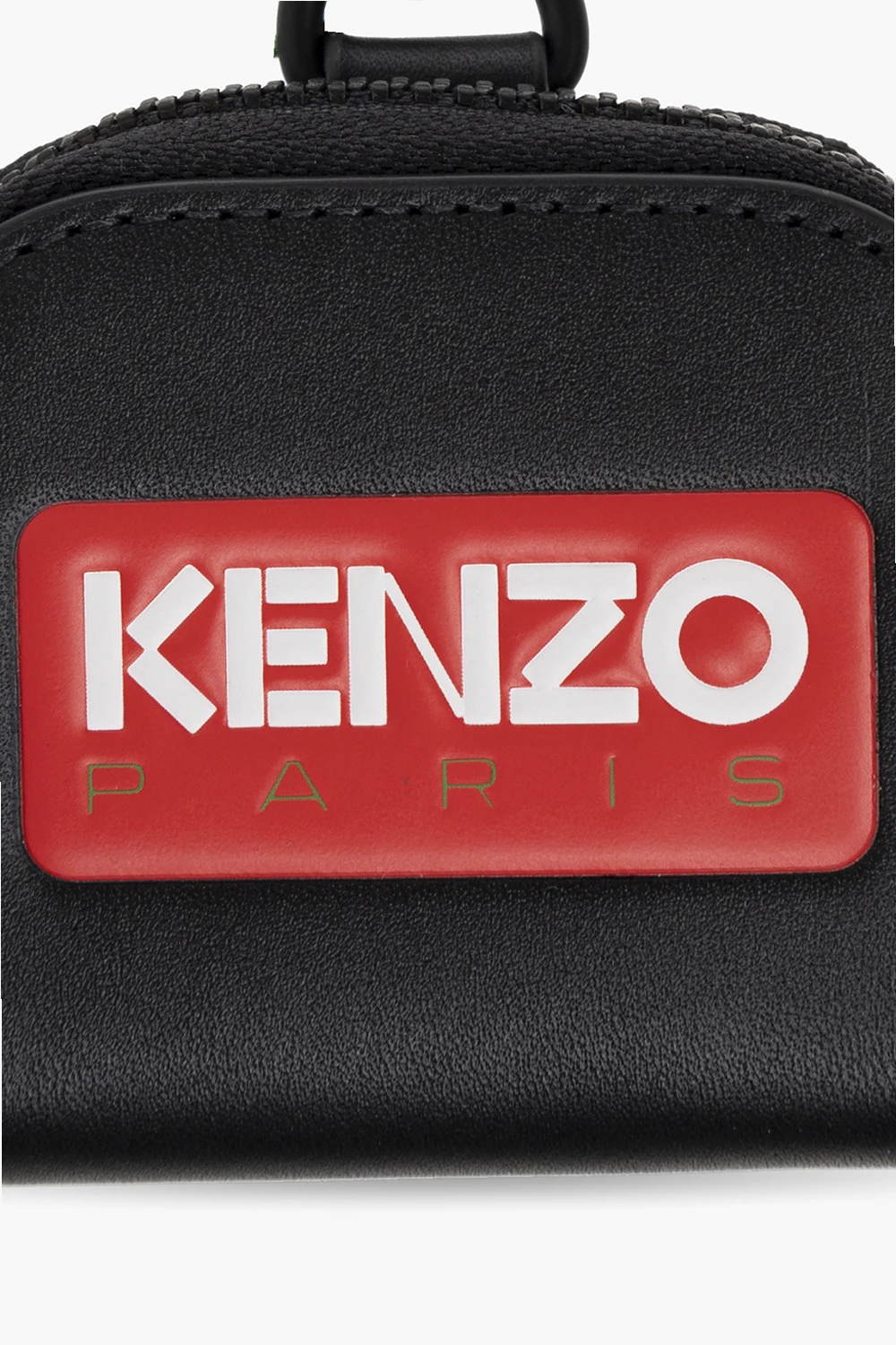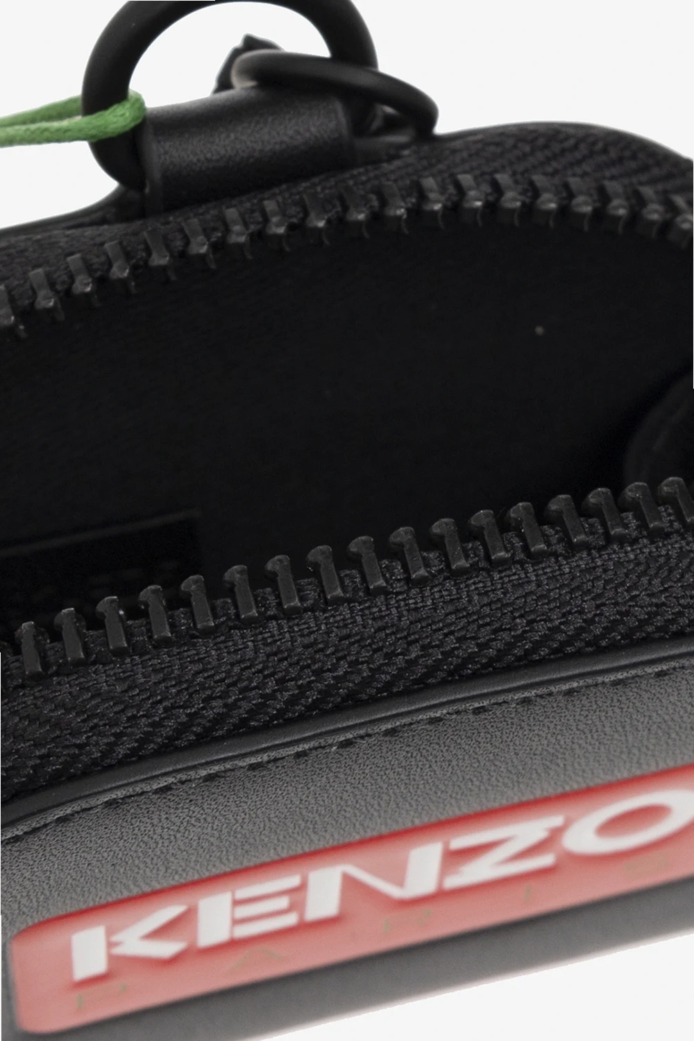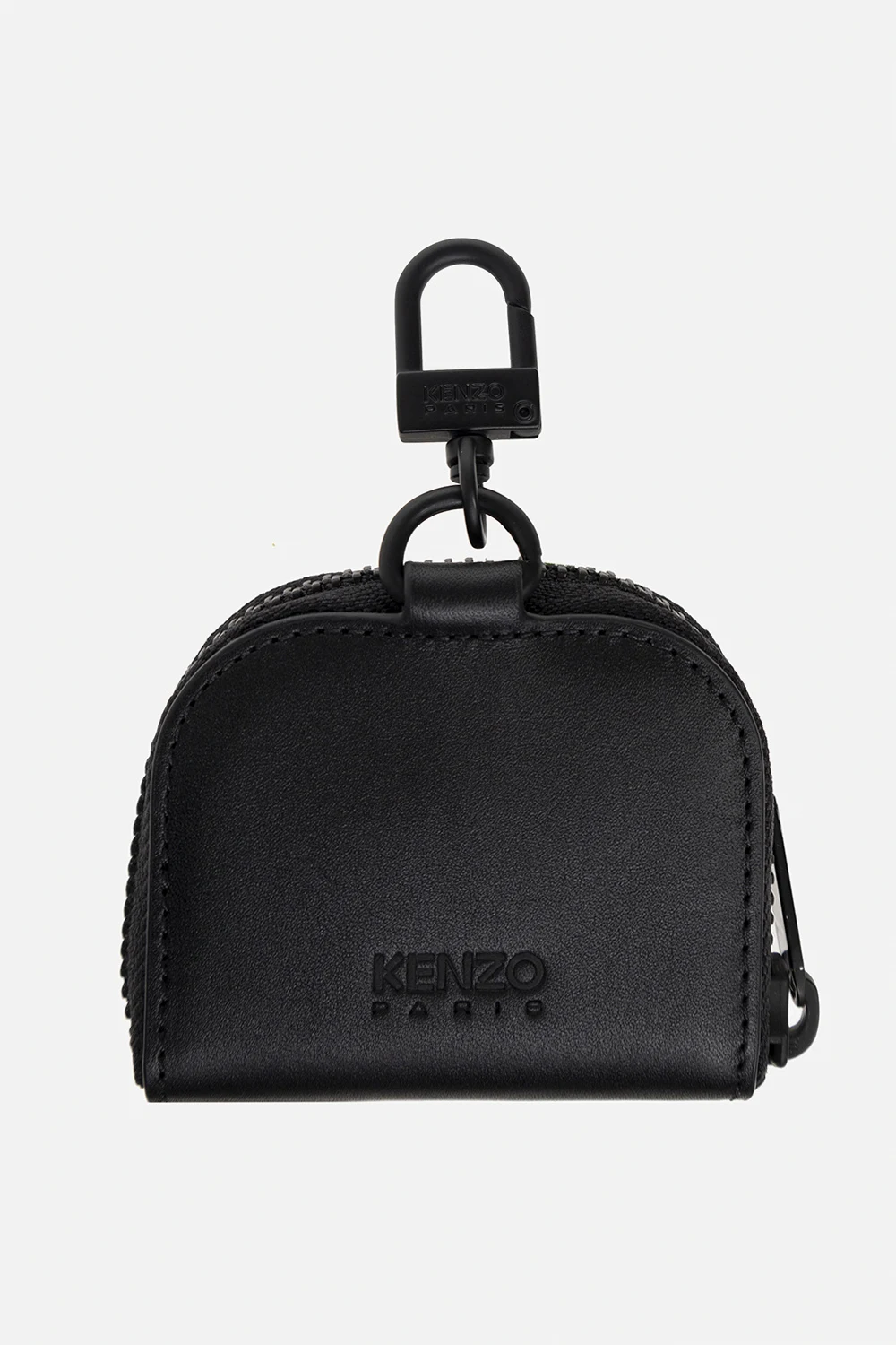 Black AirPods case from Kenzo. Crafted from leather, this item features a zip fastening, red, white and green logo print and logo-embossed carabiner clip.