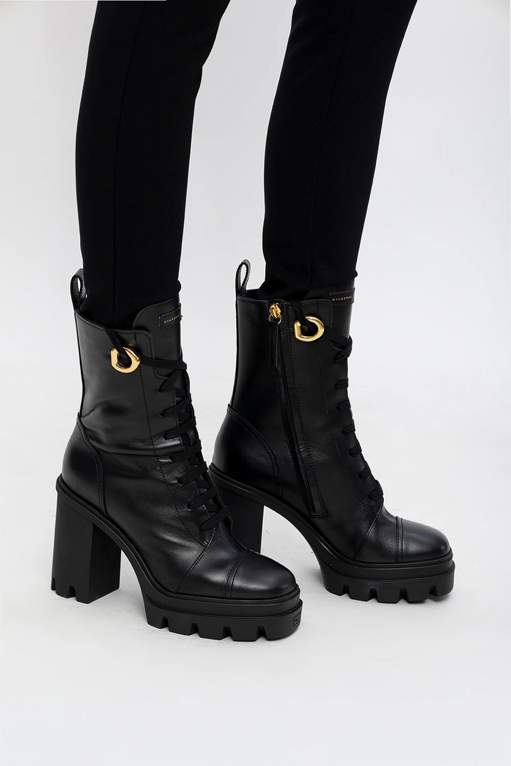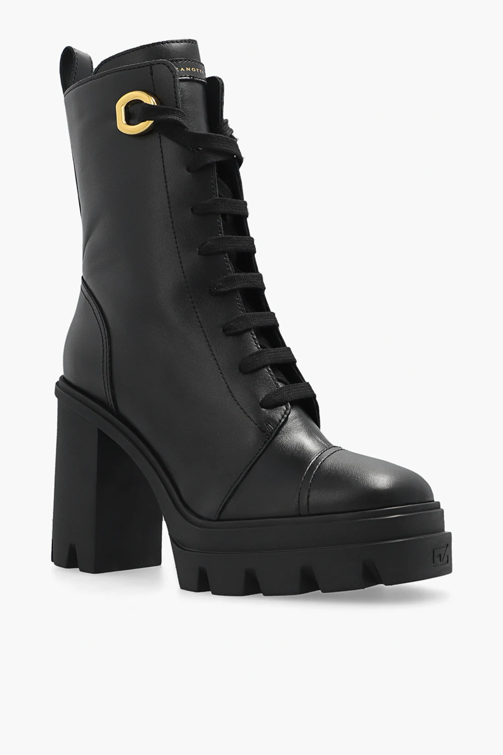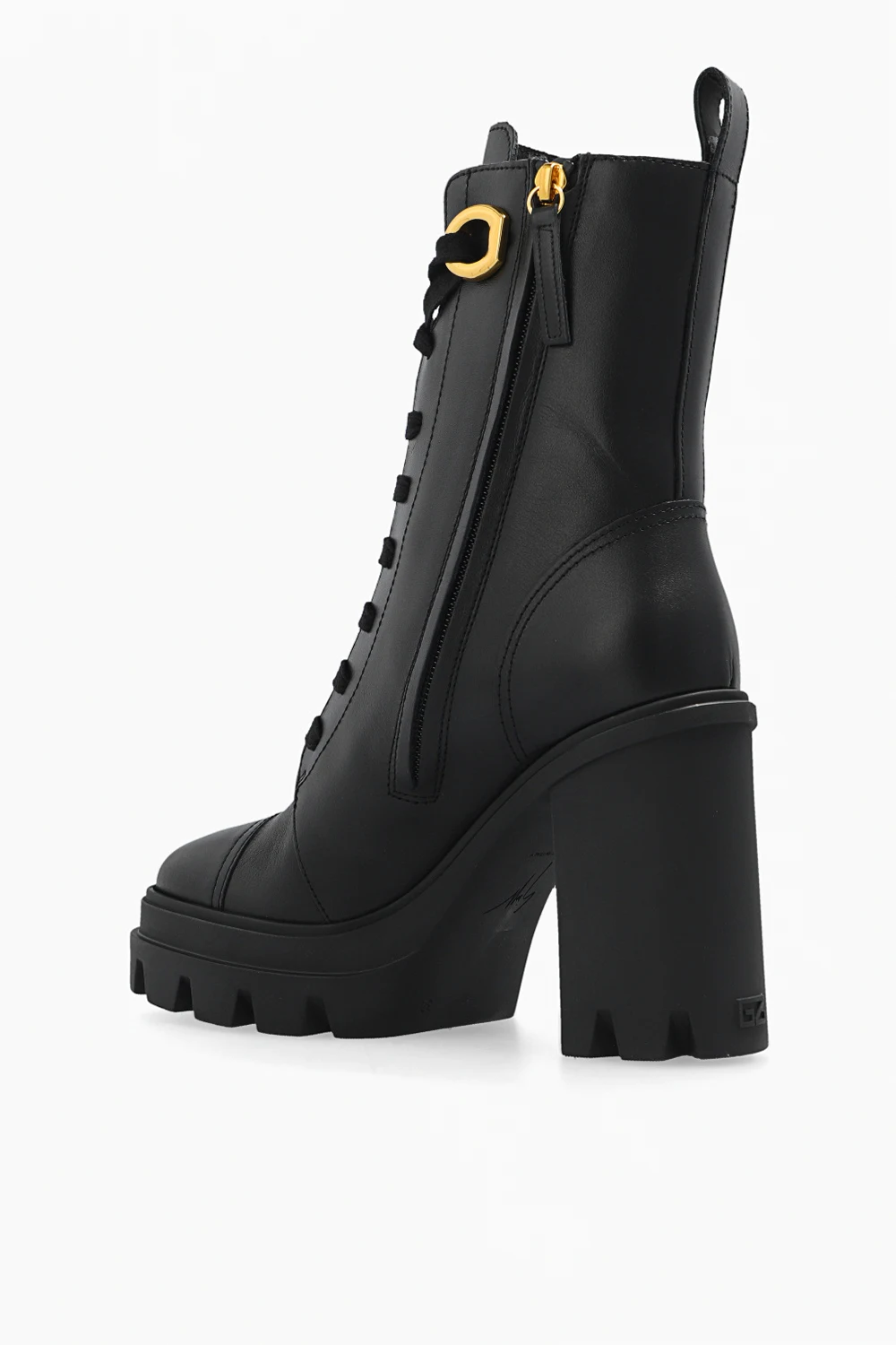 Black ‘Cubalibre’ heeled ankle boots from Giuseppe Zanotti. Made of leather, this lace-up pair features a side zip, decorative metal eyelet in gold-tone and black rubber sole.