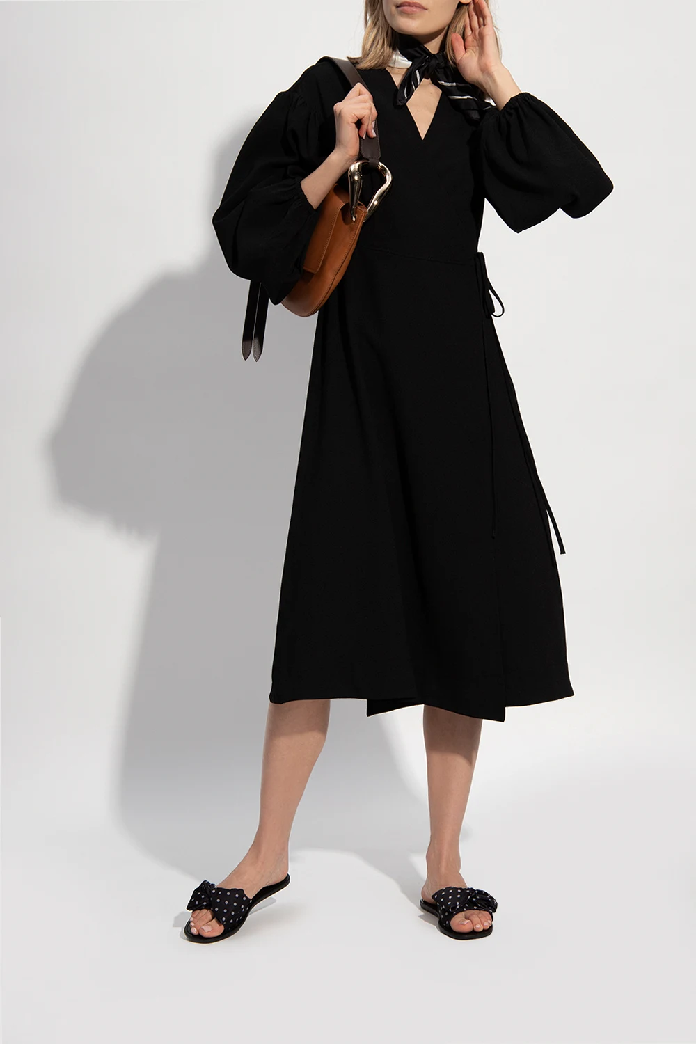 Black 'Bikini' slide sandals from Kate Spade. Set on a black rubber sole, this pair showcases leather trims, the brand's logo, white polka dots and a decorative bow.