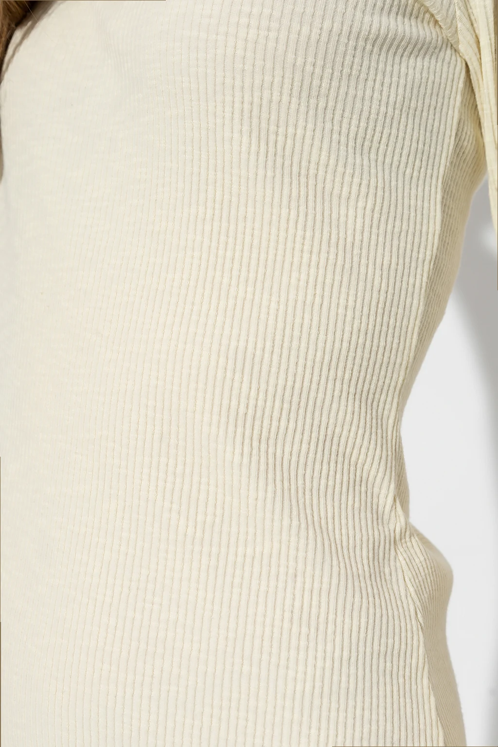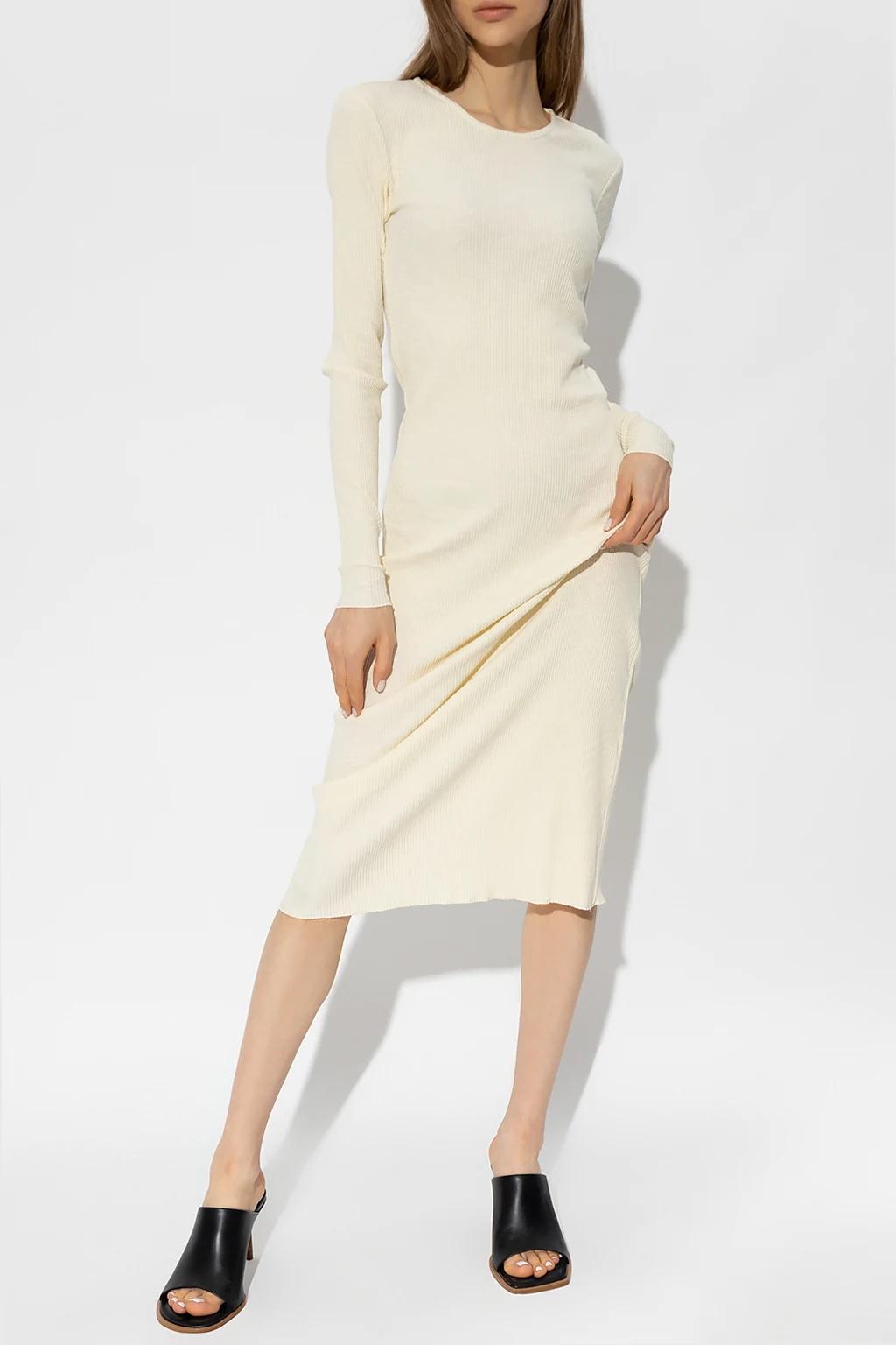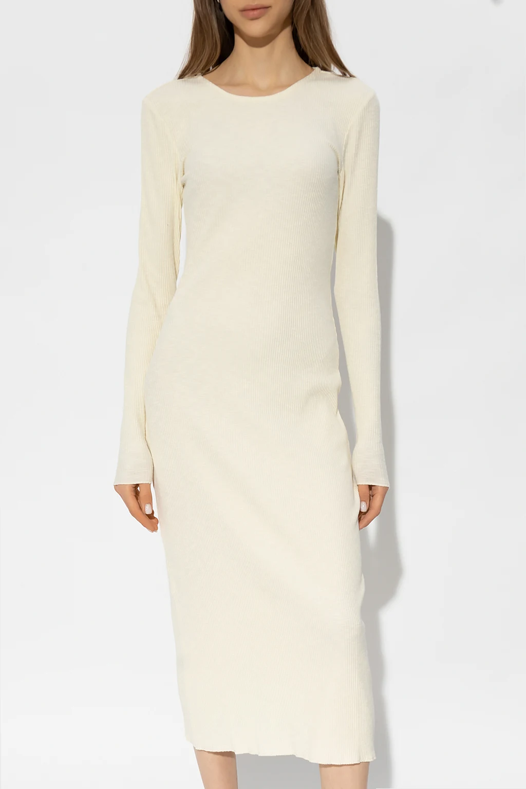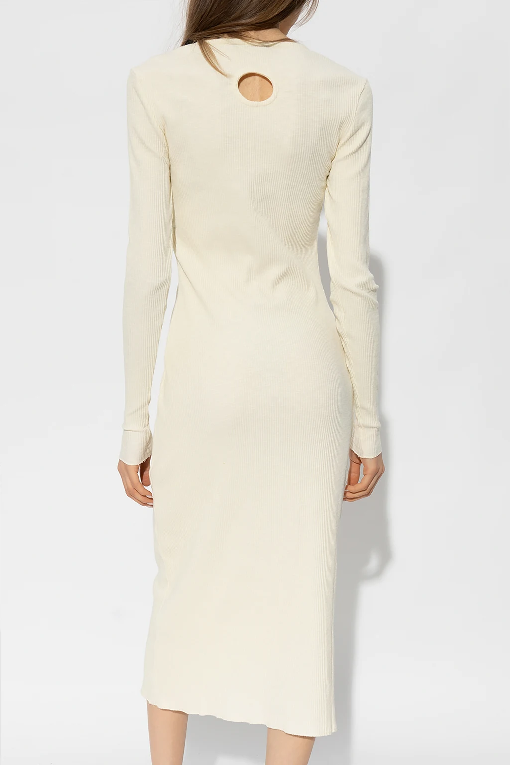 Cream 'Tora' dress from Holzweiler. Crafted from ribbed cotton with a form-fitting silhouette, this style features a round neck, long sleeves and round cutout detailing at the back.