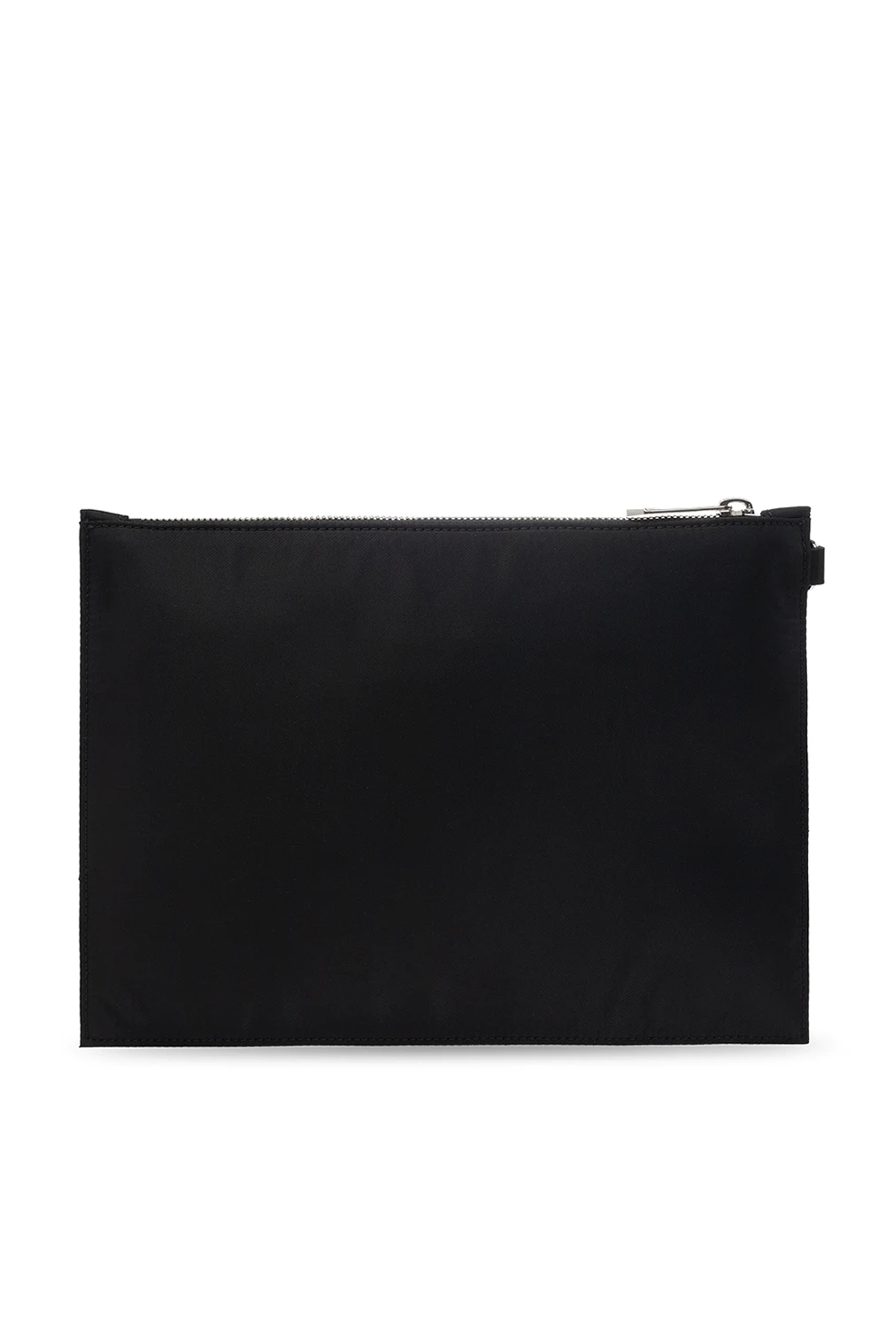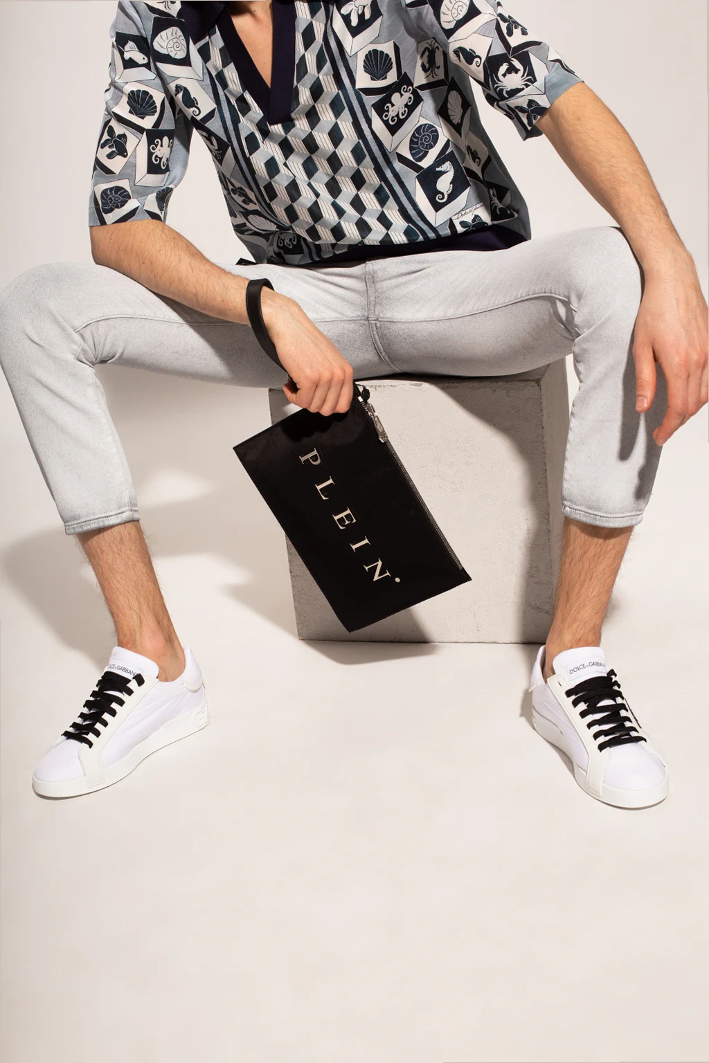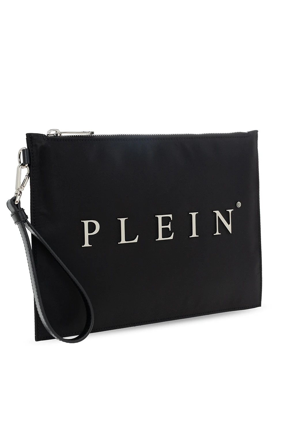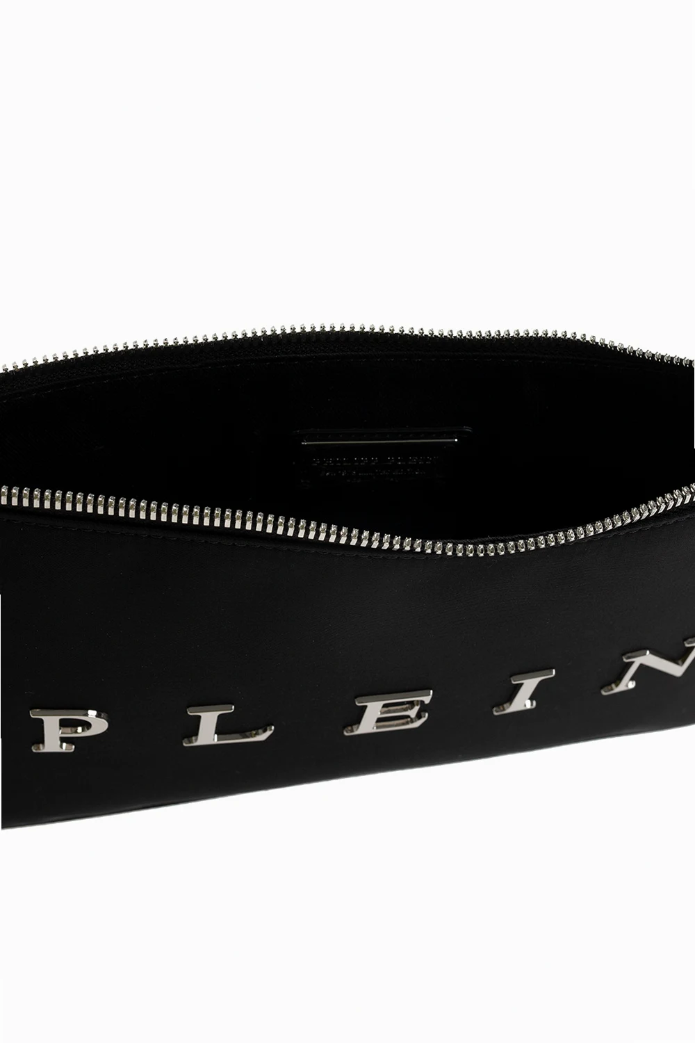 Black clutch from Philipp Plein. Fastened with a zip, this design features a raised logo in silver-tone, detachable leather wrist strap and one internal compartment with two card slots.