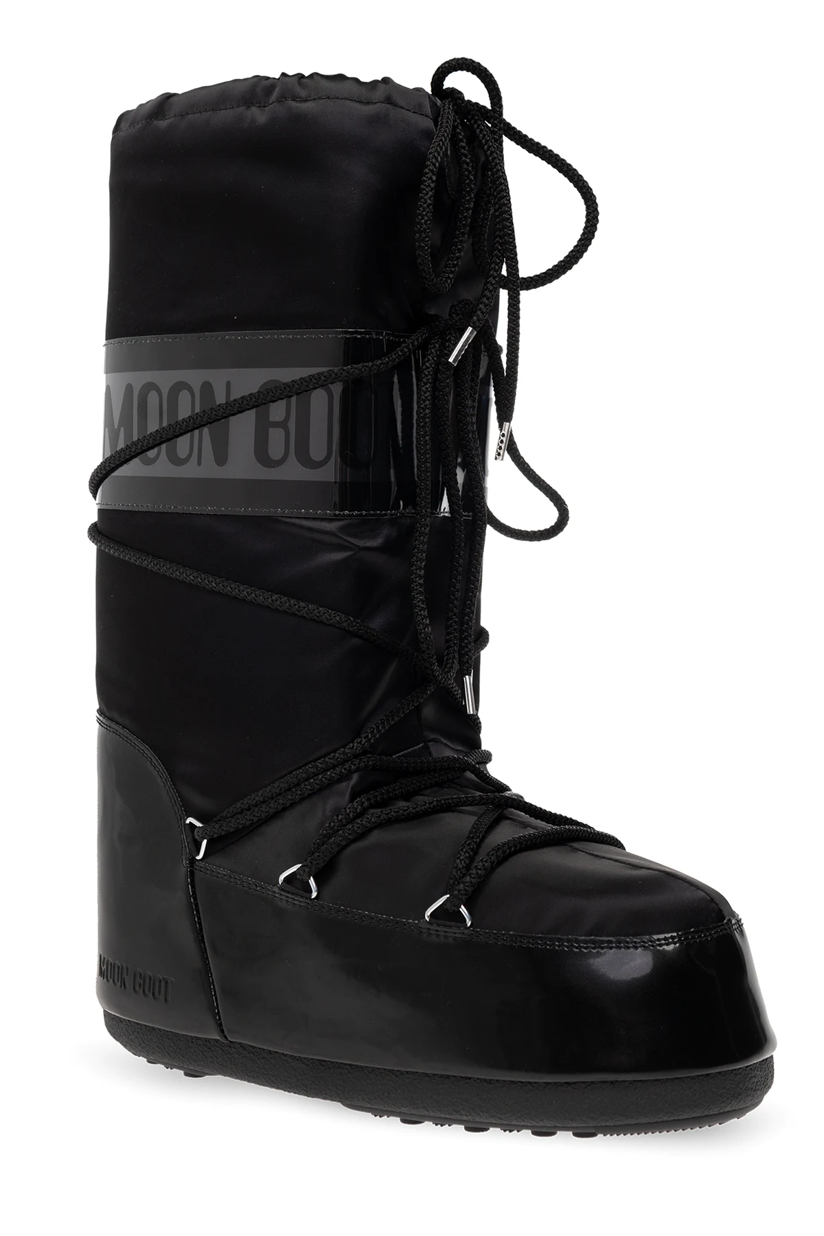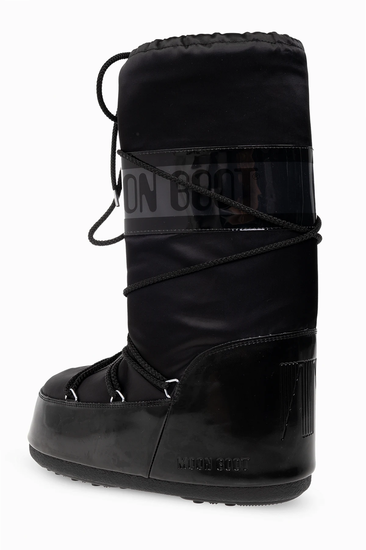 Black ‘Icon Glance’ snow boots from Moon Boot. Made of satin material, this model sits on a black rubber sole and features silver-tone metal hardware and double lace-up detailing on the front. Inspired by the peculiar shape and technology of the astronauts’ boots, the iconic style was designed in 1969 after the first Moon landing.