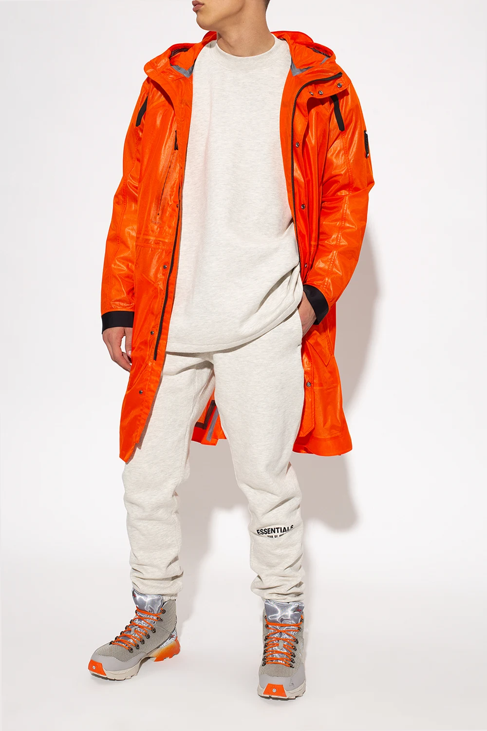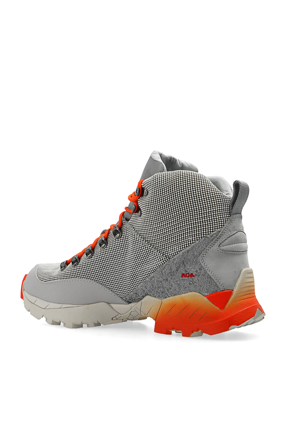 Grey, orange and black hiking boots from A-COLD-WALL* X ROA Andreas. This lace-up model features a synthetic panelled upper, a padded tongue with a leather storm weatherproof gusset, a suede-leather heel counter with a woven pull strap as well as the brand's logotype and hand-applied paint spray. It sits on a black Vibram sole.