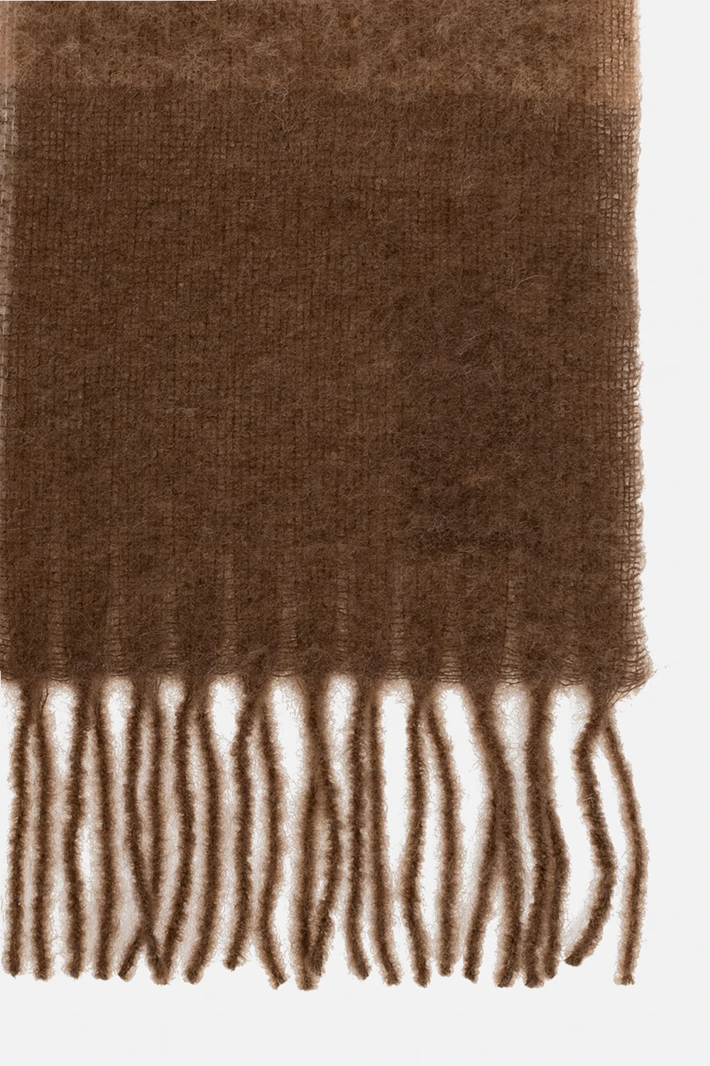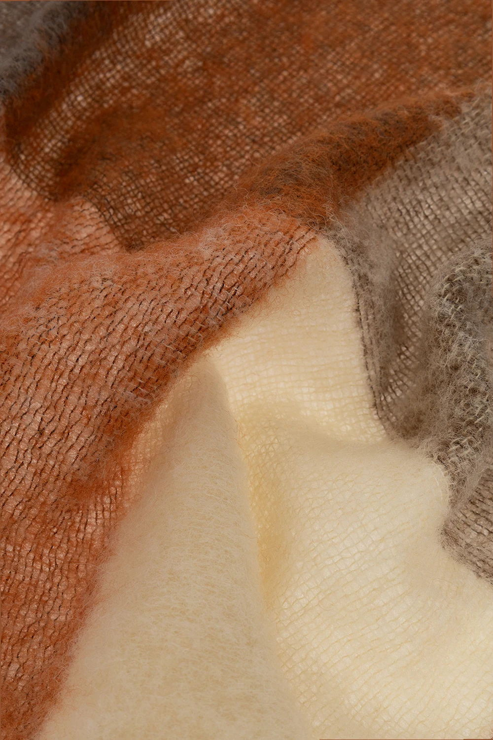 Beige, orange and brown ‘Fresia’ scarf from Holzweiler. Crafted from a blend of alpaca, mohair and wool, this design features a check pattern and fringe edges.