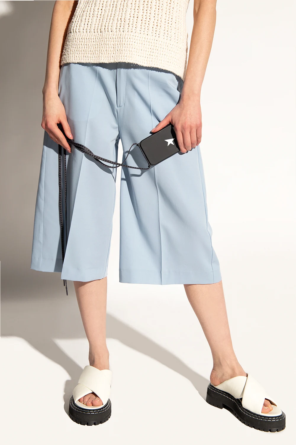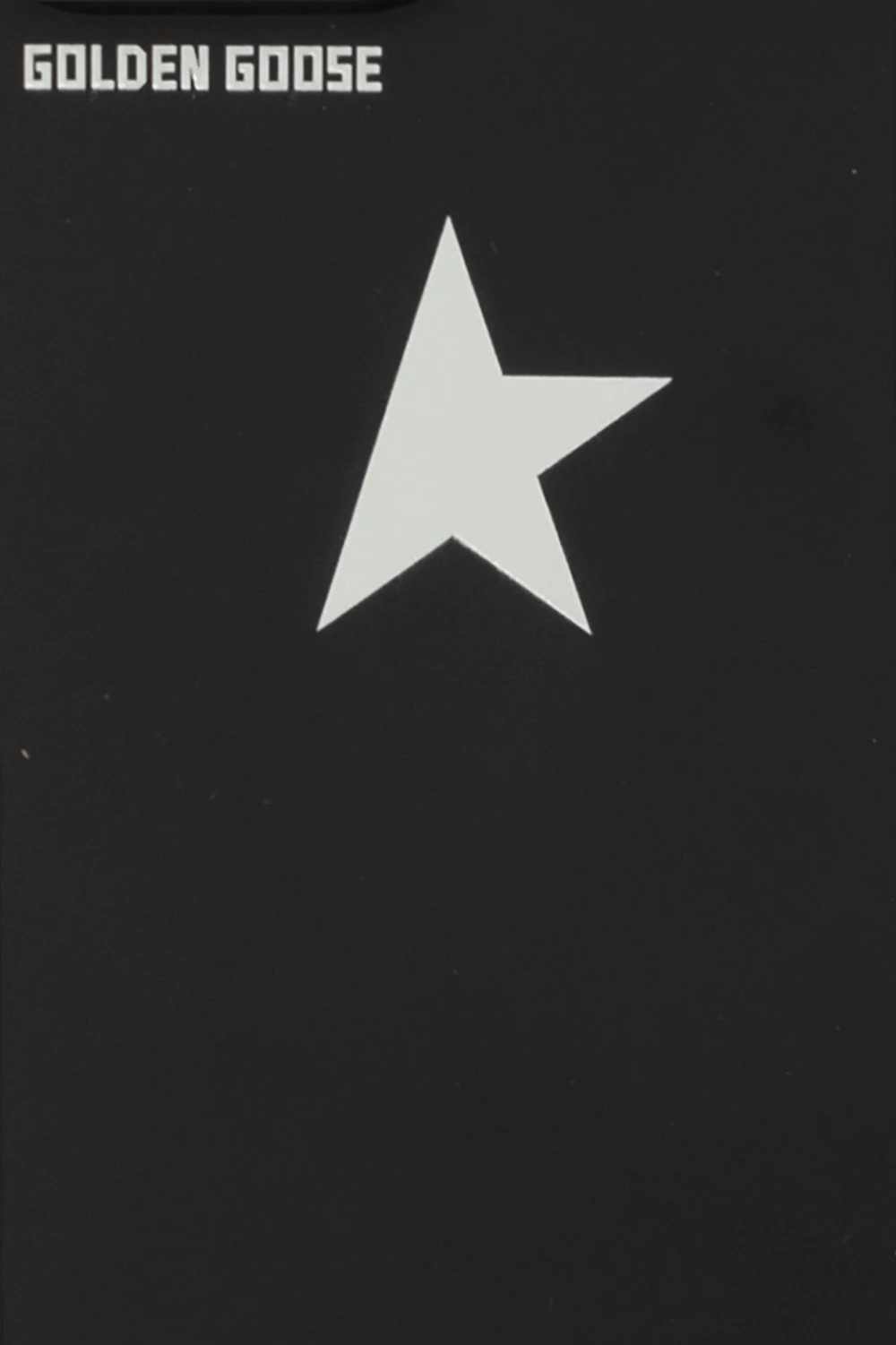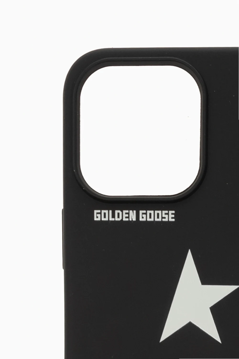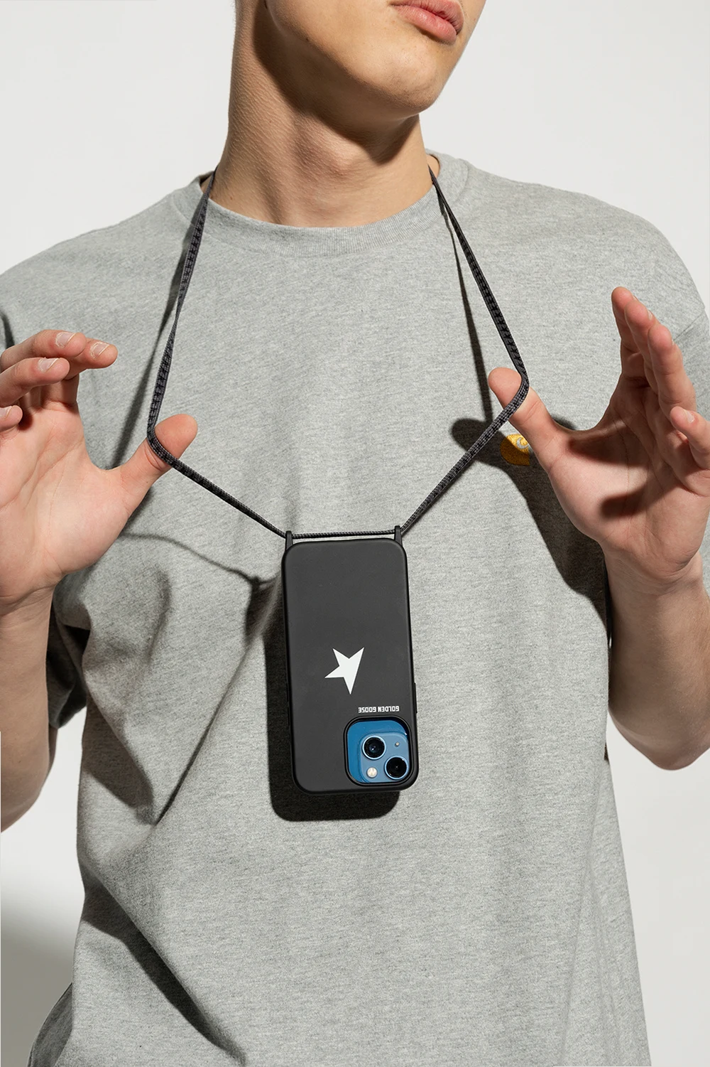 Black iPhone 13 Pro case from Golden Goose. Arriving with an adjustable white strap, this item showcases a printed grey logo and signature star.