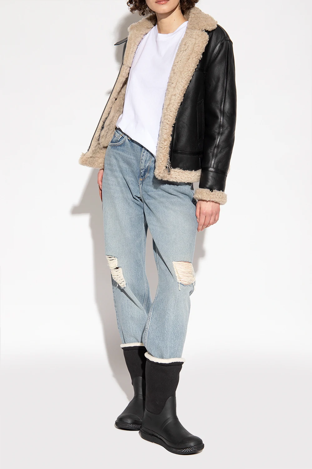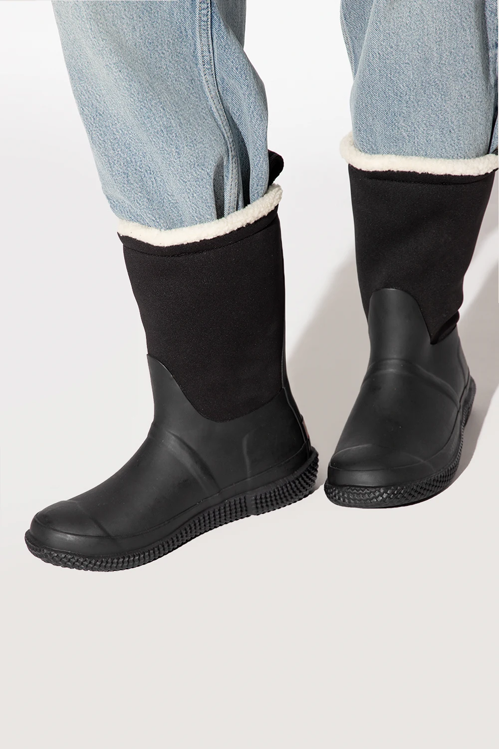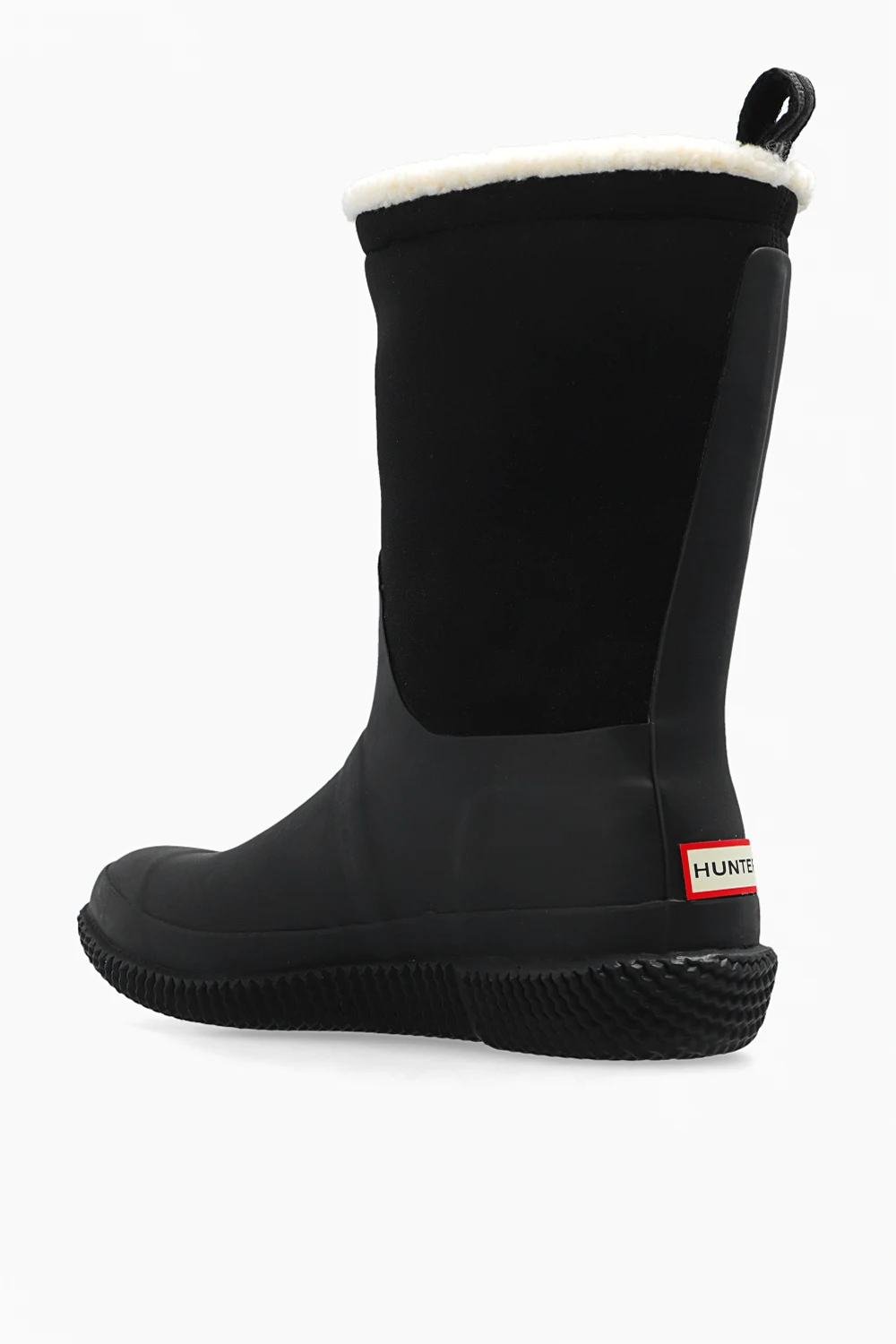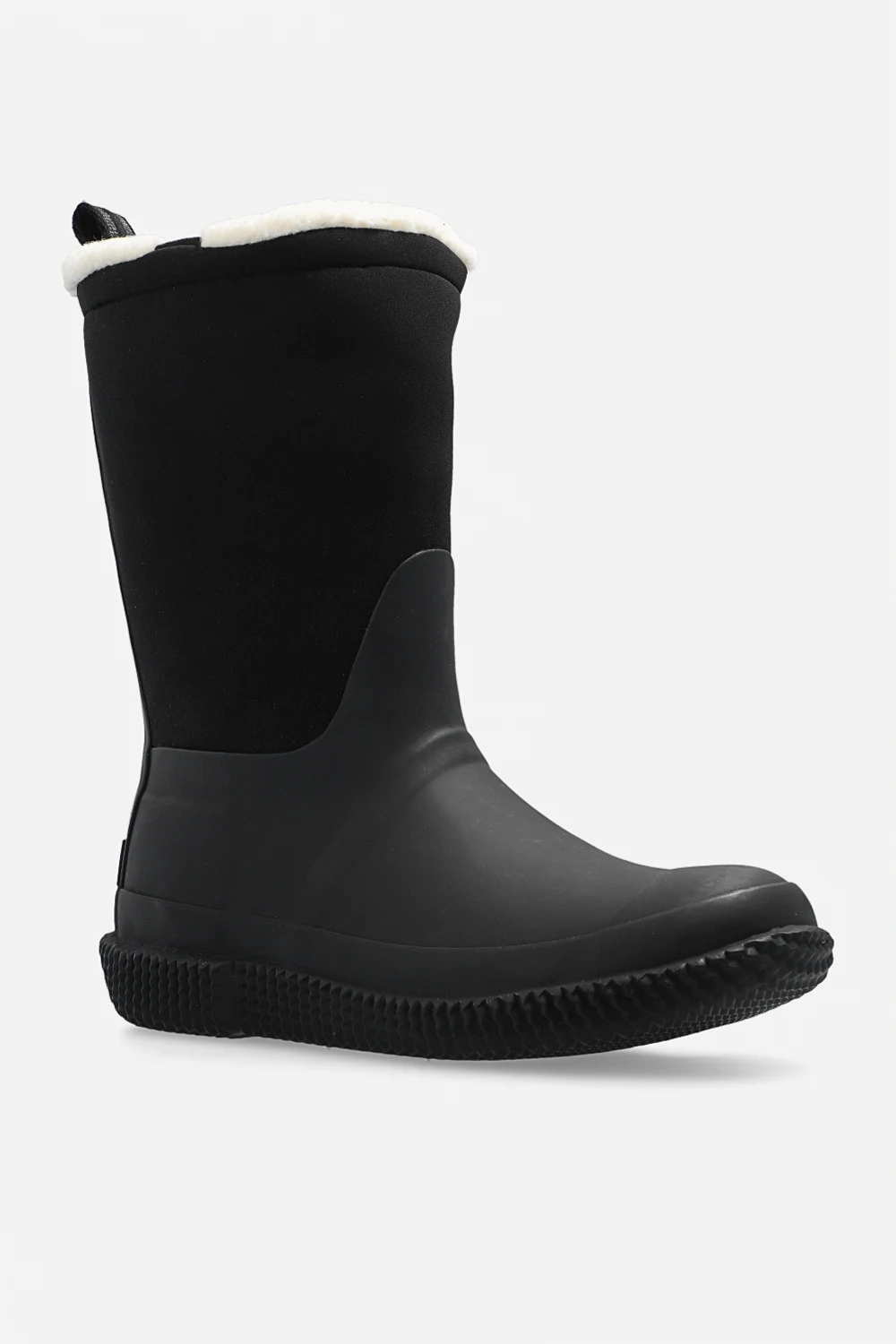 Black snow boots from Hunter. Handcrafted from rubber and insulating neoprene, this pair has vegan moisture-wicking fur in cream, logo detail and black rubber sole.