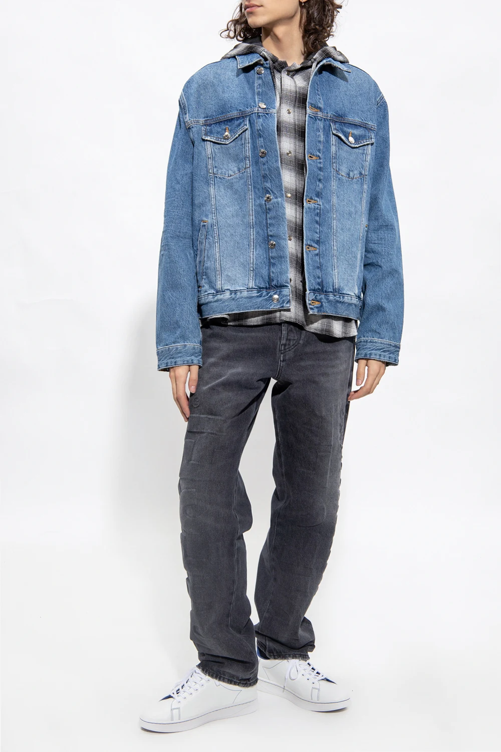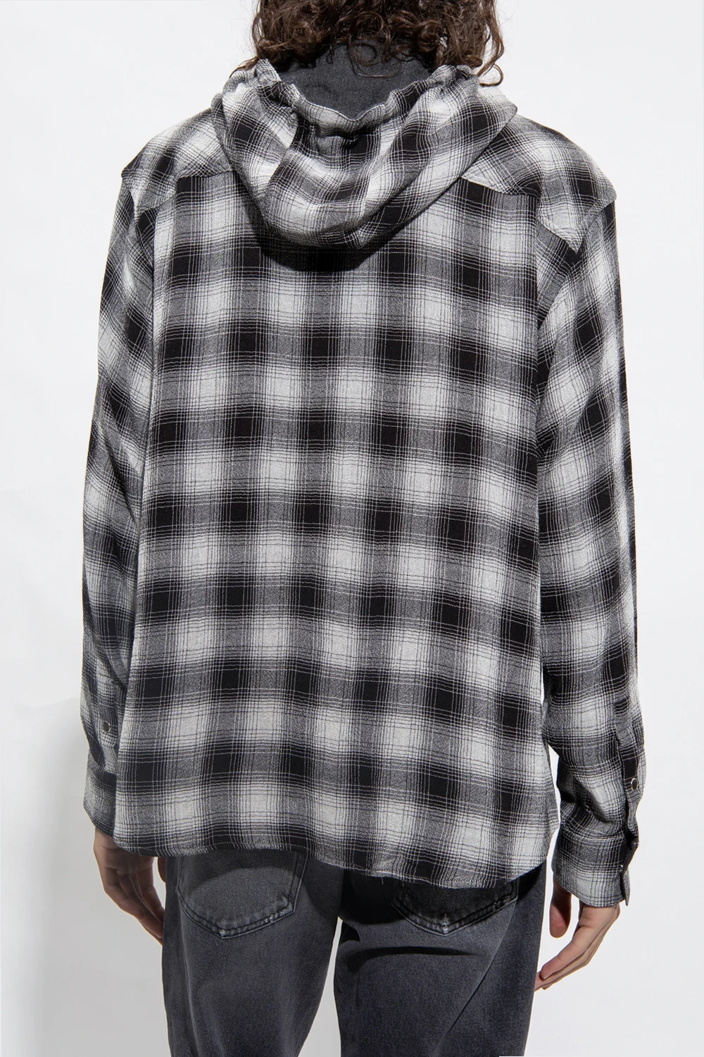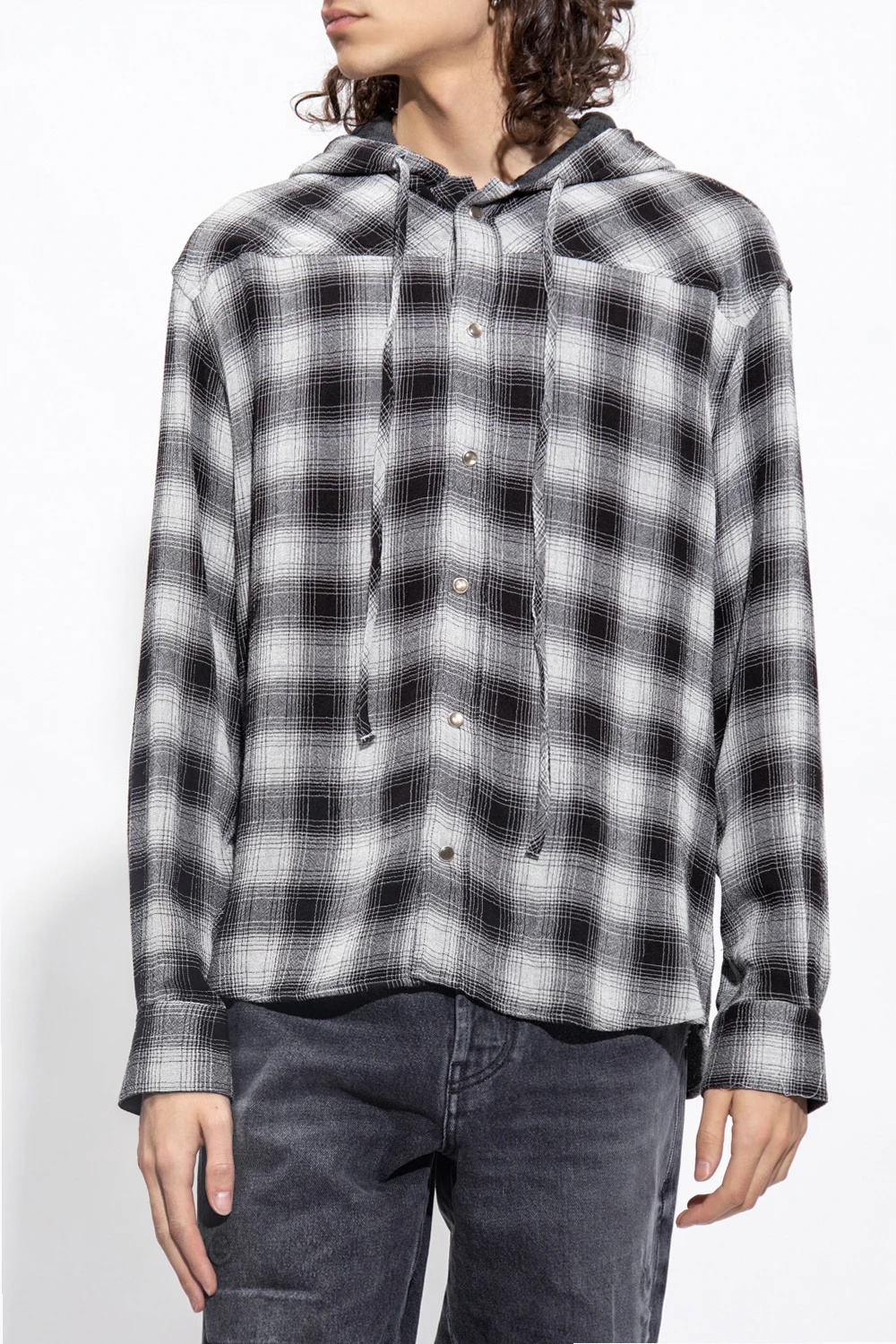 Grey and black ‘Wagner’ hooded shirt from Iro. Fastened with snaps, this design features a check pattern, drawstring hood and long sleeves with snap-fastened cuffs.