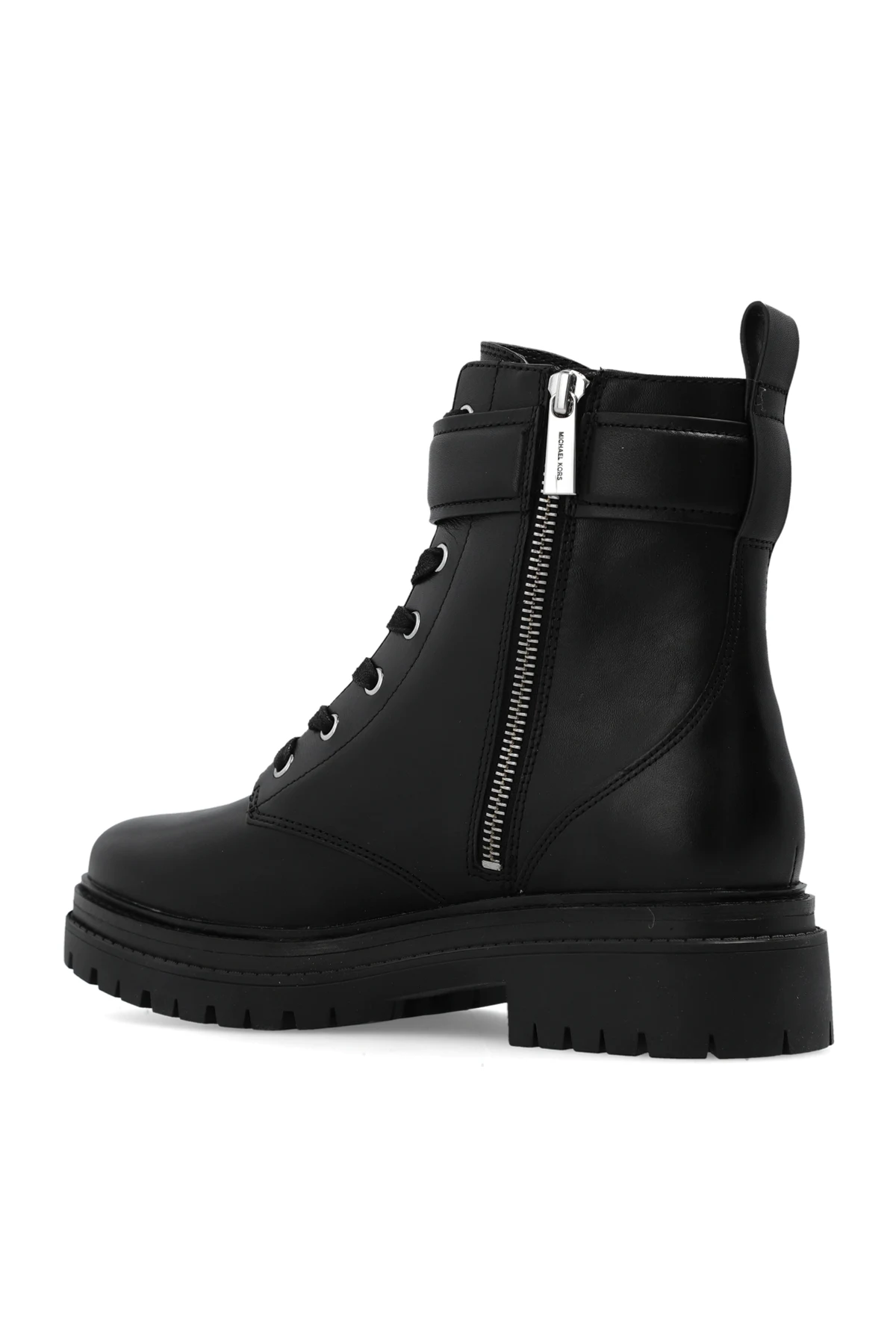 Black ‘Parker’ ankle boots from Michael Michael Kors. Made from leather, this lace-up model sits on a black rubber sole and features a side zipper and a velcro strap accentuated with a silver-tone logo plaque at the ankle.
