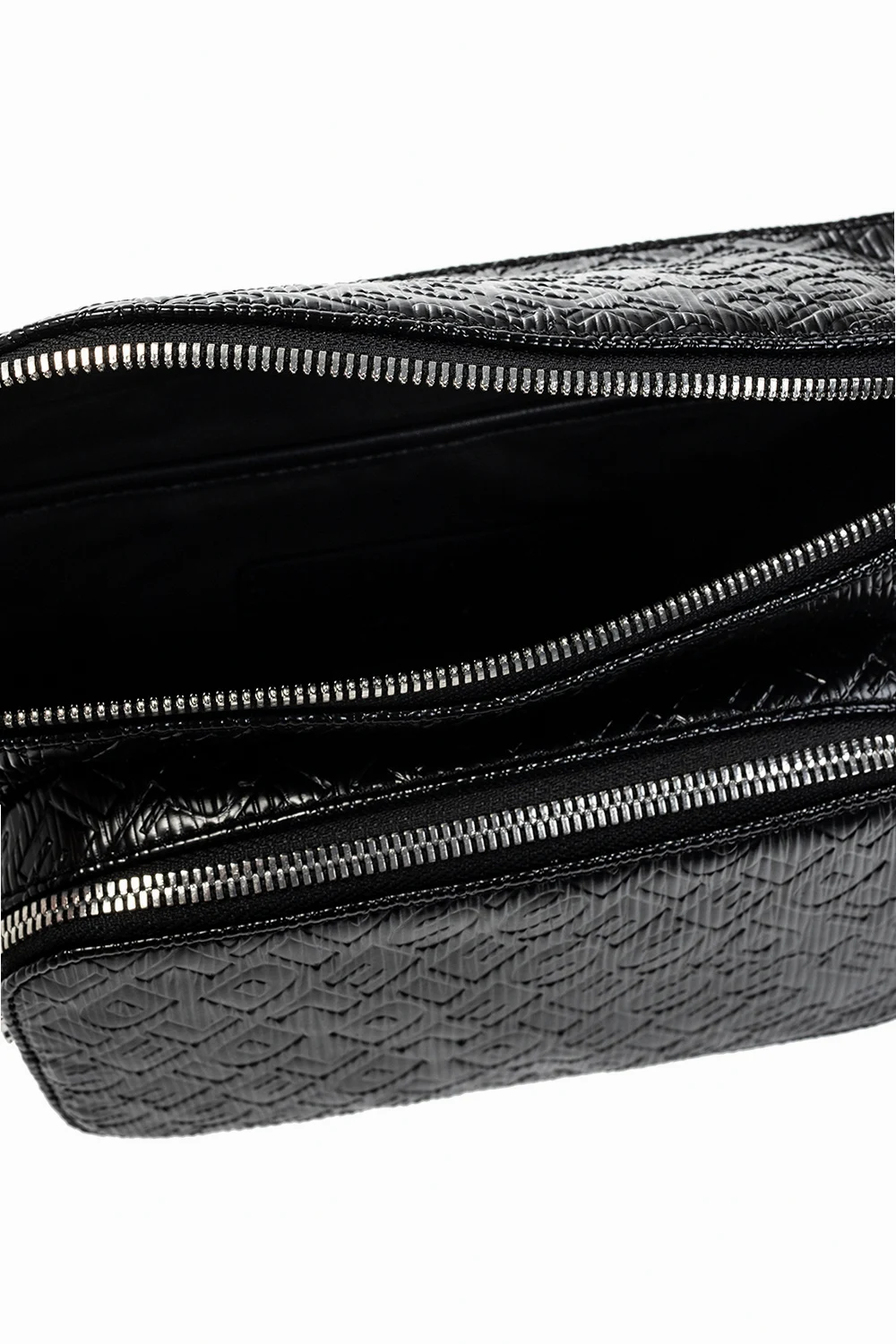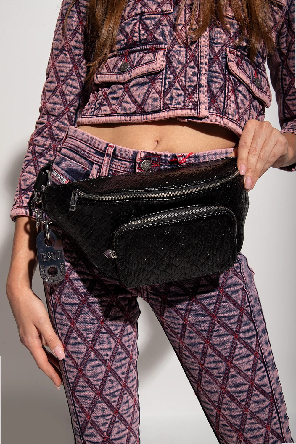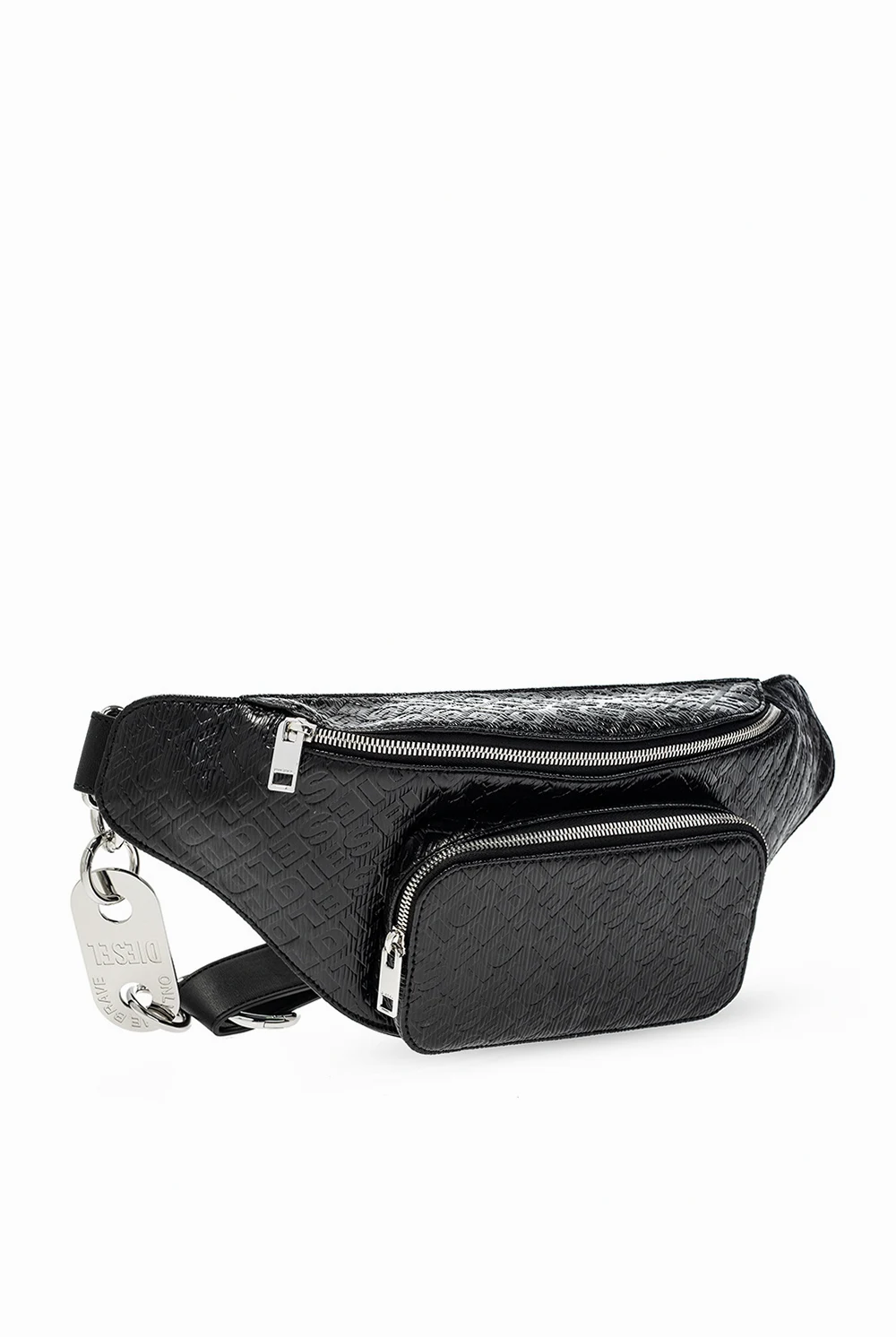 Black'Monogram Liberty' belt bag from Diesel. Fastened with a zip, this design features an embossed logo, front zip pocket, adjustable belt with a metal logo keyring, silver-tone metal hardware and one internal compartment with one slip pocket.