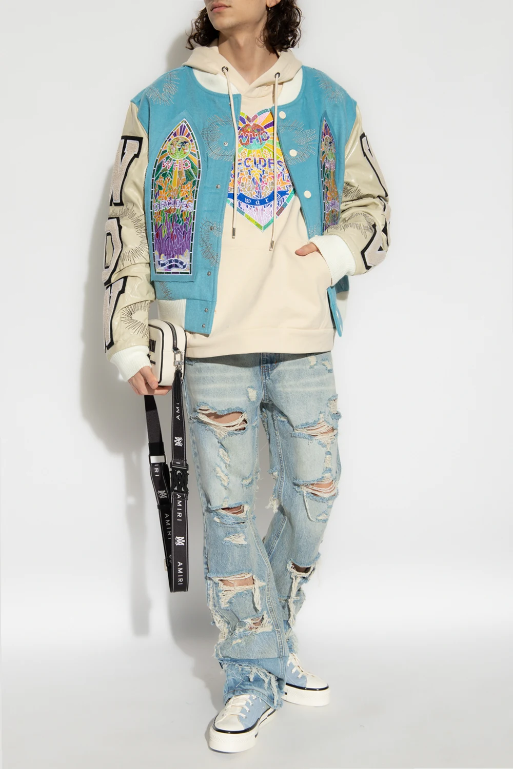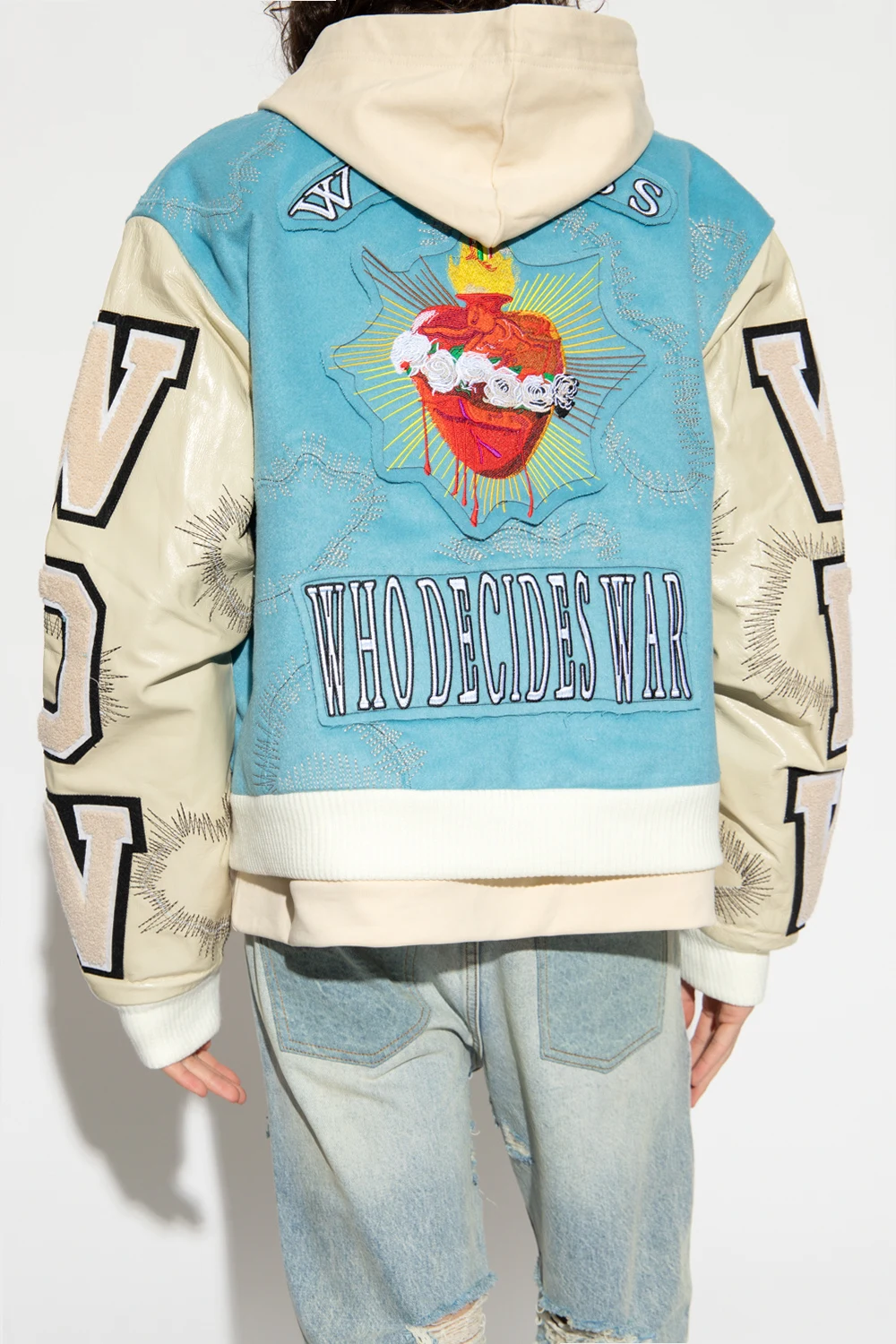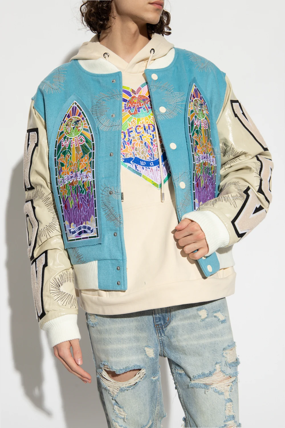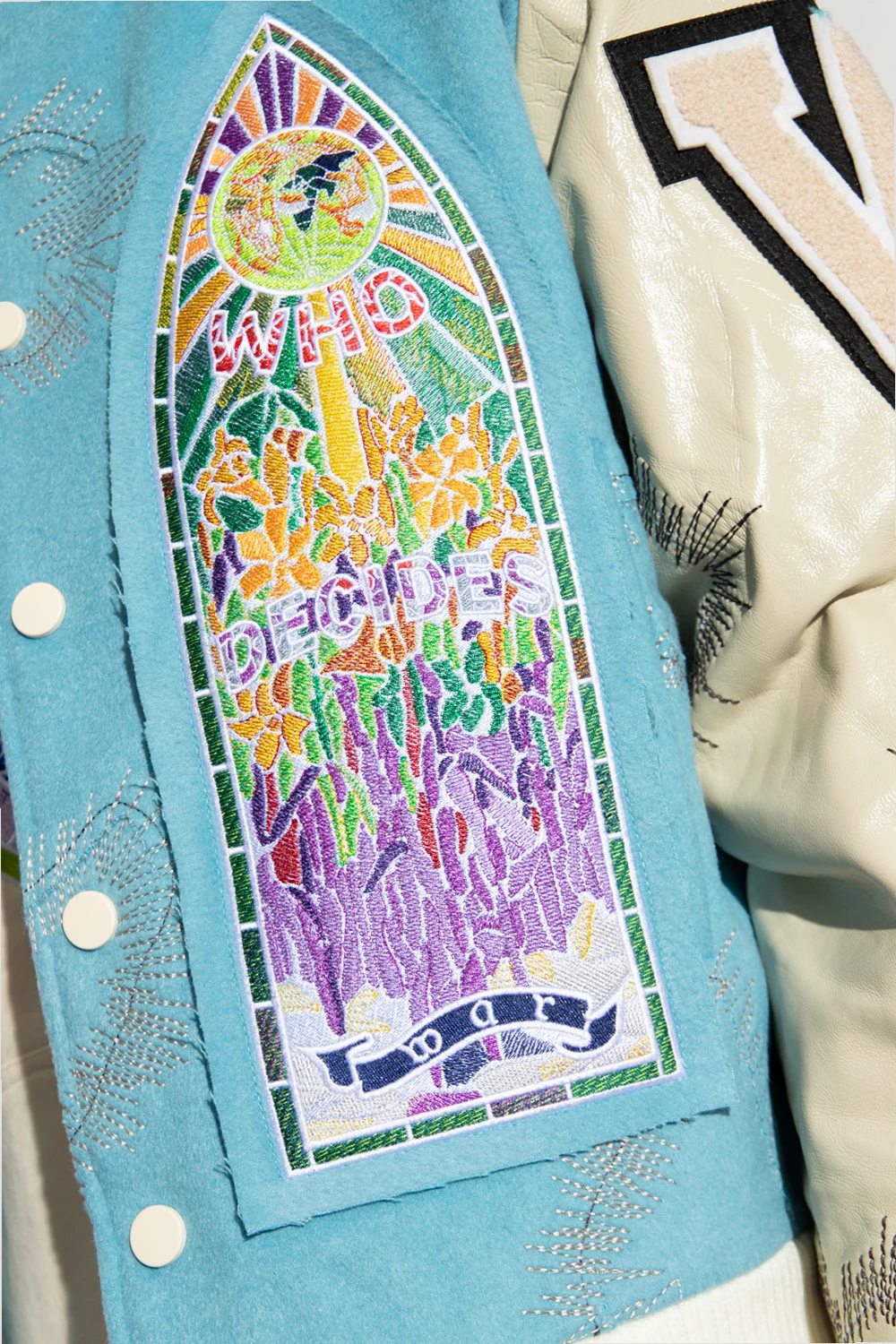 Blue, white and beige bomber jacket from Who Decides War. Crafted in part from wool, this garment features snap buttons, multicolored patches, two slip pockets and ribbed trims at the hem and cuffs.