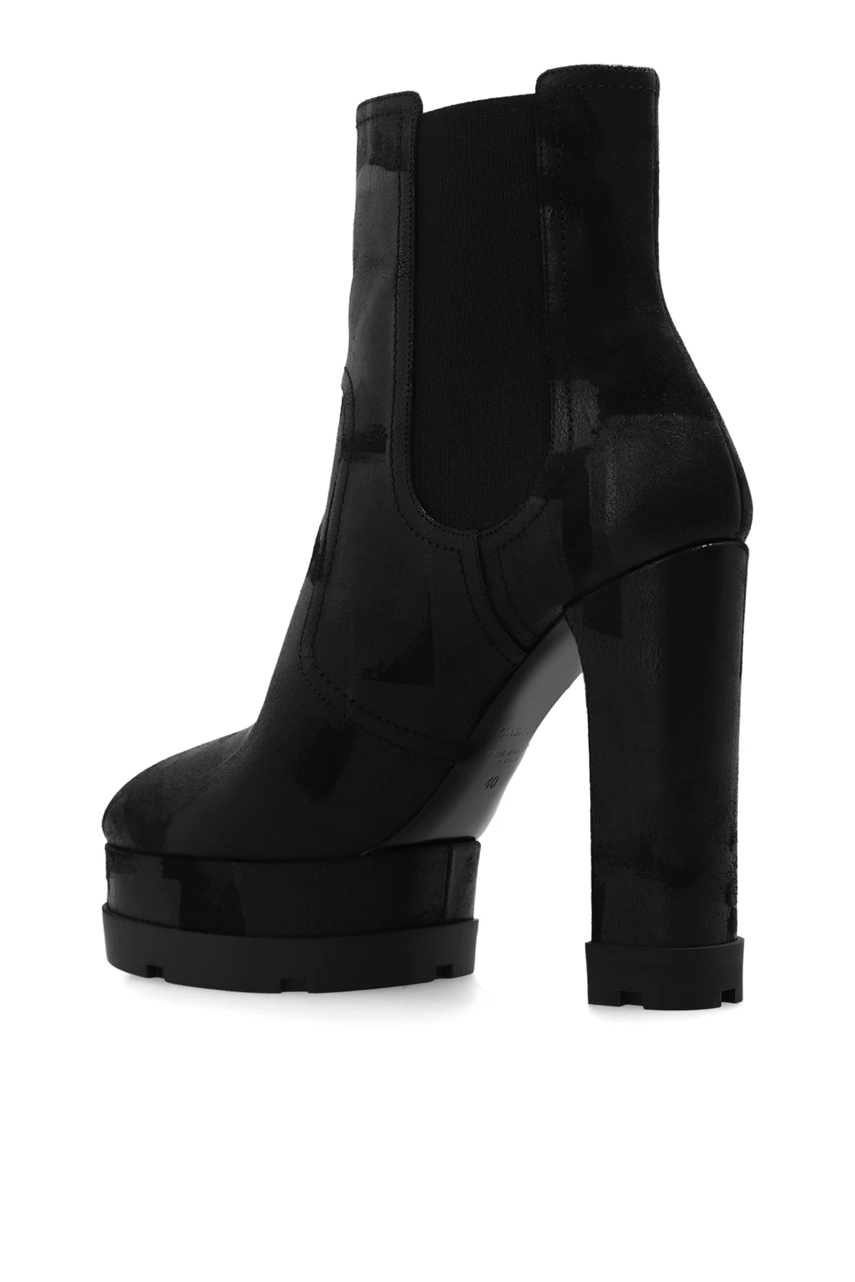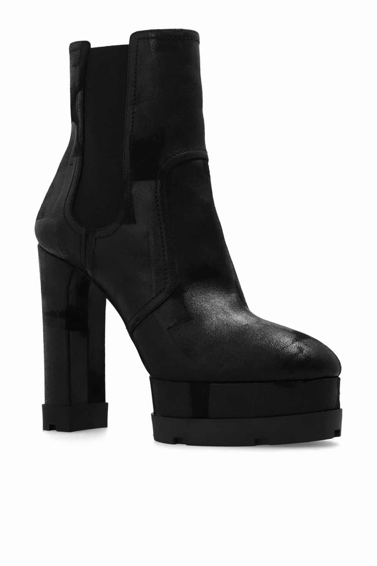 Black ‘Nancy’ platform ankle boots from Casadei. Made of suede with a vintage finish, this slip-on pair features elastic side panels and a black rubber sole.